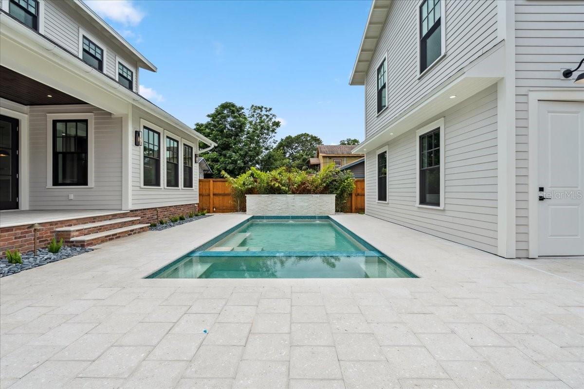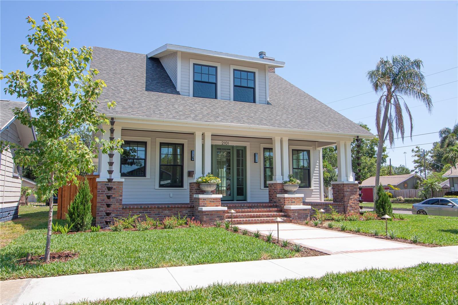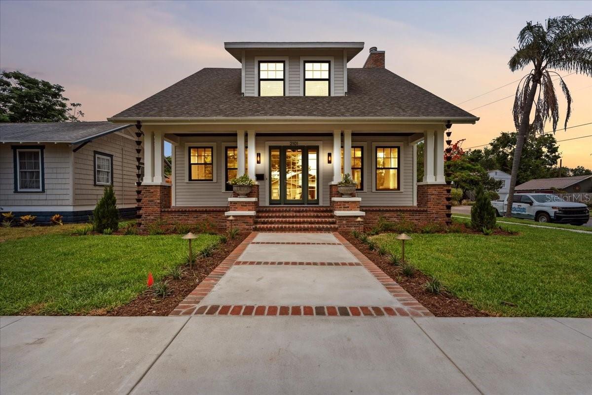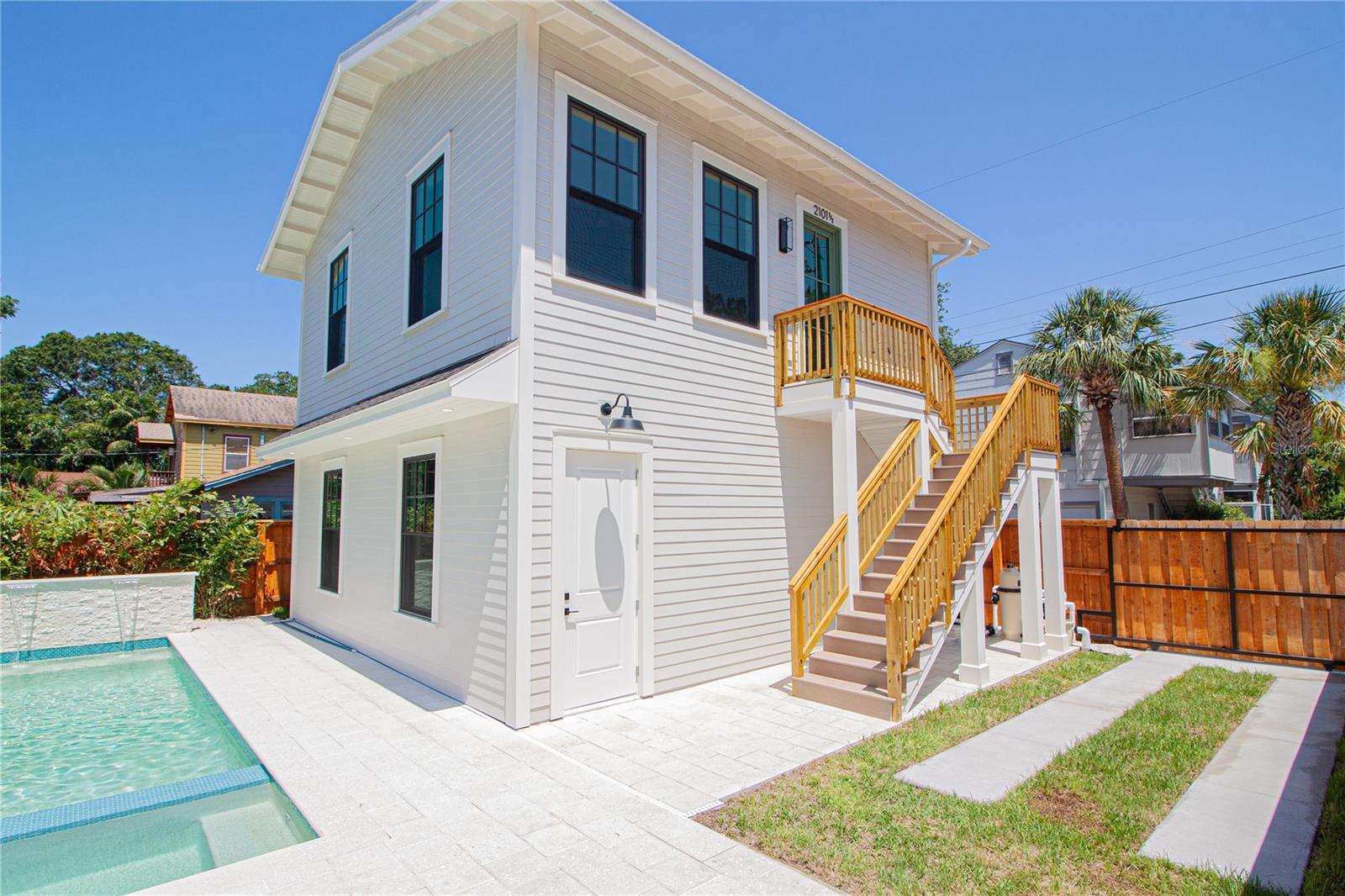 Experience timeless craftsmanship and modern luxury at 2101 3rd Ave N, a brand-new home by JWM Residential in St. Petersburg’s coveted Historic Kenwood. This stunning corner-lot property features a beautifully designed 3-bedroom, 2.5-bath main residence and a fully equipped 1-bedroom, 1-bath carriage house above a detached garage—perfect for guests, rental income, or a private studio. Inside the main home, you’ll find top-of-the-line finishes throughout: engineered hardwood floors, custom cabinetry, Sierra Pacific wood-clad windows and doors, and artisan-installed trimwork. The chef’s kitchen is anchored by paneled Thermador appliances, quartz countertops, a walk-in pantry with full cabinetry, and a large island ideal for entertaining. The open-concept living area features a gas fireplace with a Taj Mahal stone mantle and flows seamlessly into a bright dining area overlooking the pool. Upstairs, the primary suite boasts a spacious walk-in closet and a luxurious bathroom with a dual shower setup and brass fixtures. Two additional bedrooms share a beautifully tiled hallway bath. A laundry room with terrazzo tile and LG appliances adds both function and flair. Step outside to enjoy the heated saltwater pool and spa, finished in PebbleSheen and surrounded by Shellock pavers. A water feature wall and full automation elevate the backyard oasis. The home also includes a Rainbird irrigation system, Volt landscape lighting, tankless gas water heater, and Mitsubishi ducted mini-split HVAC systems for zoned efficiency. The detached garage and carriage house are separately metered and offer a full kitchen, laundry, and mini-split system—ideal for multi-generational living or long-term guests. The exterior is a blend of custom brickwork, WindsorONE trim, tongue-and-groove porch ceilings, rain chains, and historic half-round gutters, blending classic charm with new construction quality. Located just 1.5 miles from downtown St. Pete, minutes to Central Avenue’s shops and restaurants, and about 15 minutes to St. Pete Beach, this home offers unbeatable access to everything the area has to offer—plus quick access to Tampa via I-275.