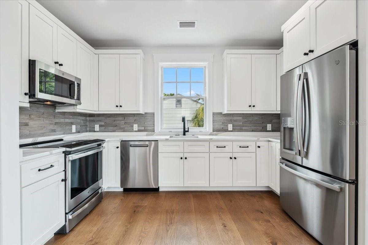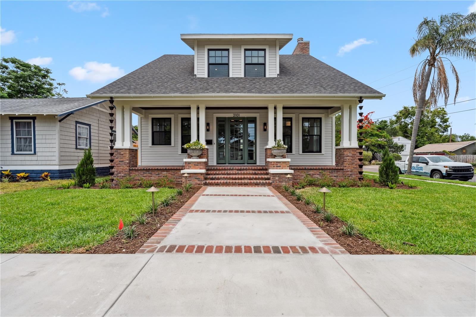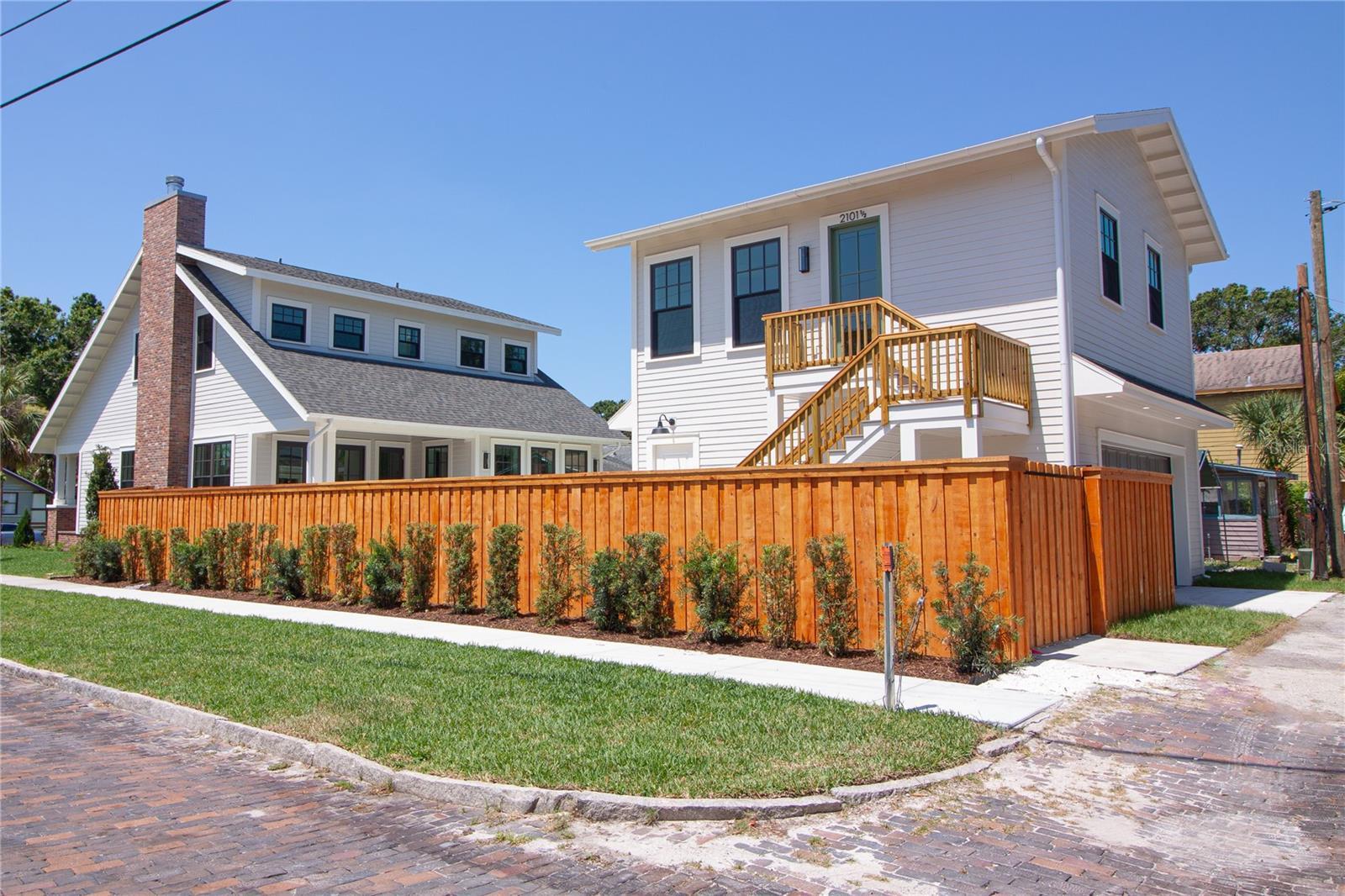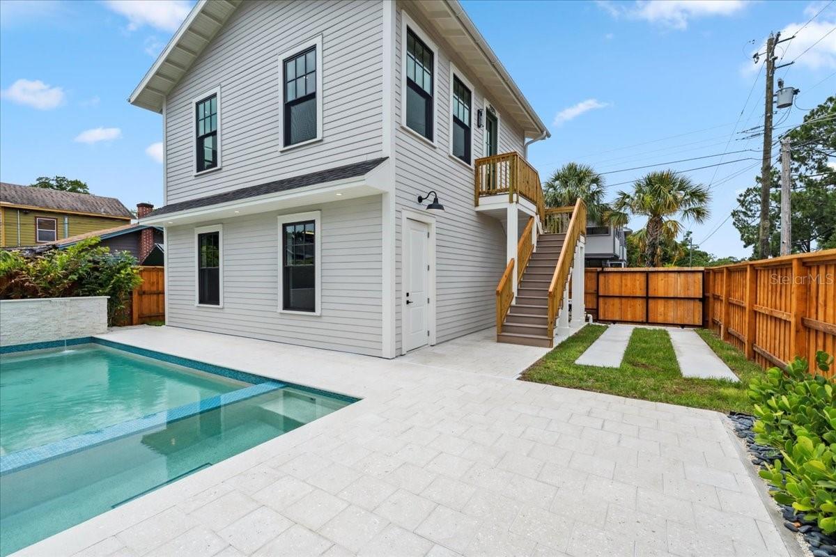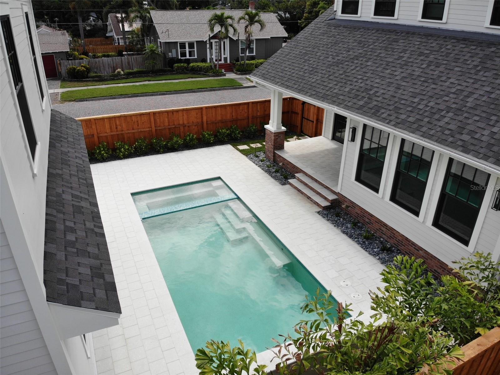 Experience timeless craftsmanship and modern luxury at 2101 3rd Ave N, a brand-new home by JWM Residential in St. Petersburg’s coveted Historic Kenwood. This stunning corner-lot property features a beautifully designed 3-bedroom, 2.5-bath main residence and a fully equipped 1-bedroom, 1-bath carriage house above a detached garage—perfect for guests, rental income, or a private studio. Inside the main home, you’ll find top-of-the-line finishes throughout: engineered hardwood floors, custom cabinetry, Sierra Pacific wood-clad windows and doors, and artisan-installed trimwork. The chef’s kitchen is anchored by paneled Thermador appliances, quartz countertops, a walk-in pantry with full cabinetry, and a large island ideal for entertaining. The open-concept living area features a gas fireplace with a Taj Mahal stone mantle and flows seamlessly into a bright dining area overlooking the pool. Upstairs, the primary suite boasts a spacious walk-in closet and a luxurious bathroom with a dual shower setup and brass fixtures. Two additional bedrooms share a beautifully tiled hallway bath. A laundry room with terrazzo tile and LG appliances adds both function and flair. Step outside to enjoy the heated saltwater pool and spa, finished in PebbleSheen and surrounded by Shellock pavers. A water feature wall and full automation elevate the backyard oasis. The home also includes a Rainbird irrigation system, Volt landscape lighting, tankless gas water heater, and Mitsubishi ducted mini-split HVAC systems for zoned efficiency. The detached garage and carriage house are separately metered and offer a full kitchen, laundry, and mini-split system—ideal for multi-generational living or long-term guests. The exterior is a blend of custom brickwork, WindsorONE trim, tongue-and-groove porch ceilings, rain chains, and historic half-round gutters, blending classic charm with new construction quality. Located just 1.5 miles from downtown St. Pete, minutes to Central Avenue’s shops and restaurants, and about 15 minutes to St. Pete Beach, this home offers unbeatable access to everything the area has to offer—plus quick access to Tampa via I-275.