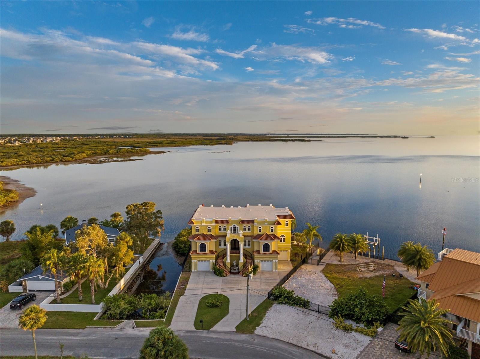 Welcome to the ''Castle on Hernando Beach''! This modern Mediterranean home nestled on the Gulf of Mexico is a rare find with OPEN GULF VIEWS and breathtaking sunsets! A stunning 4 bedroom, 4 bath home, custom built using COMMERCIAL-GRADE CONSTRUCTION; with poured-in-place concrete walls, concrete floors and decks, steel trusses, and 45 pilings. ELEVATOR with access to all 3 levels of the home. This expansive resort style property feels like your own private oasis. Featuring a paver deck, kidney-shaped Saltwater heated POOL with laminar jets, SPA, covered patio, firepit, and dock including a Jet ski lift. The 3-story front elevation has a spectacular architecture design, showcasing a large fountain at center of two grand circular Spanish tiled staircases that lead to the front doors. Enter the Foyer, your attention is immediately drawn to the panoramic views visible from nearly every room. The 2nd level is made for entertaining! Featuring an airy open floor plan with luxurious travertine marble and red Brazilian hardwood throughout. The Family room has mesmerizing ocean views, 20' Cathedral coffered ceilings, and a gas fireplace with coral-like mantle and built-in glass shelves. The lavish Kitchen with center island and an additional 9 ft. of bar height seating is a Chef's dream featuring granite countertops, double ovens, double sinks, microwave, trash compactor as well as a dishwasher and refrigerator that blends seamlessly with upscale wood cabinetry. There are 3 Pantry closets with custom shelves, two of which are walk-ins. The Kitchen also includes a desk and Nook with oversized bay windows. Theater room contains stadium seating, Polk Audio surround sound system and large 120'' screen that captivates! The Living room is perfect for reading or intimate conversations. Around the bend is a wet Bar with upscale cabinetry, granite counter, silver sink and wine fridge. There is a separate formal Dining room, a 4th bedroom (or Office) and full bathroom. The Patio is ideal for outdoor meals and contains a tankless gas grill. The 3rd level presents 3 luxurious retreats with ensuite bathrooms. Two of which have private covered balconies and spa-like accommodations which include a whirlpool tub, shower, marble floors and walls, private water closets, walk-in closets. The west wing features the two guest retreats, and across the catwalk is the Owners Primary retreat which provides ample privacy and seclusion. This level includes the laundry room with Washer, Dryer, deep sink and ample upscale cabinetry and granite counter. The 1st level contains 3 separate garage bays, one of them tandem, and a whopping 2,587 sq. ft. of parking/storage space. The front u-shape driveway can easily accommodate 10-12 autos. Accessing all 3 levels of this home is easy with its NEW ELEVATOR (and/or stairs) and you will love the 8' tall doors, upscale lighting fixtures and overhead fans throughout the house. Hot water is provided by 2 efficient gas tankless water heaters and there is a central vacuum cleaner. There are NO DEED RESTRICTIONS, HOA OR SHORT-TERM RENTAL RESTRICTIONS. Enjoy breathtaking sunsets, dolphins, manatees, various fish, turtles, and so much more! Hernando Beach is an up-and-coming waterfront community. You will experience the ultimate Florida lifestyle and you are within a short drive to the world famous Weeki Wachee Springs, Tampa International Airport and the greater Tampa area.