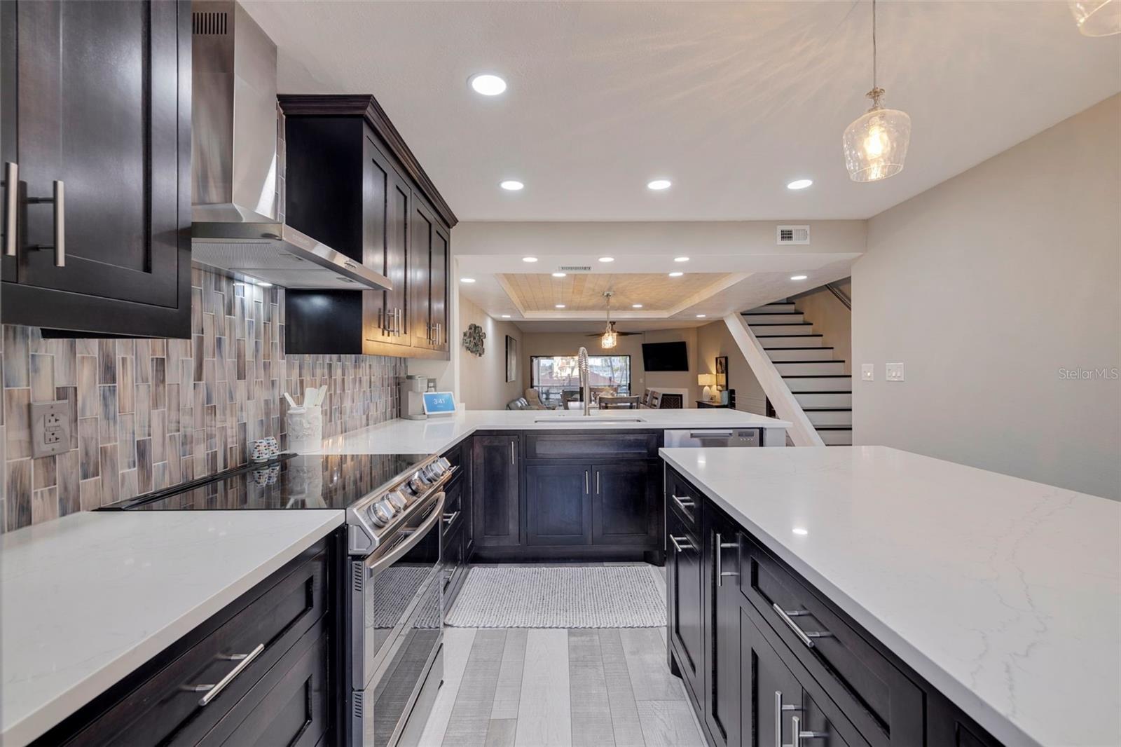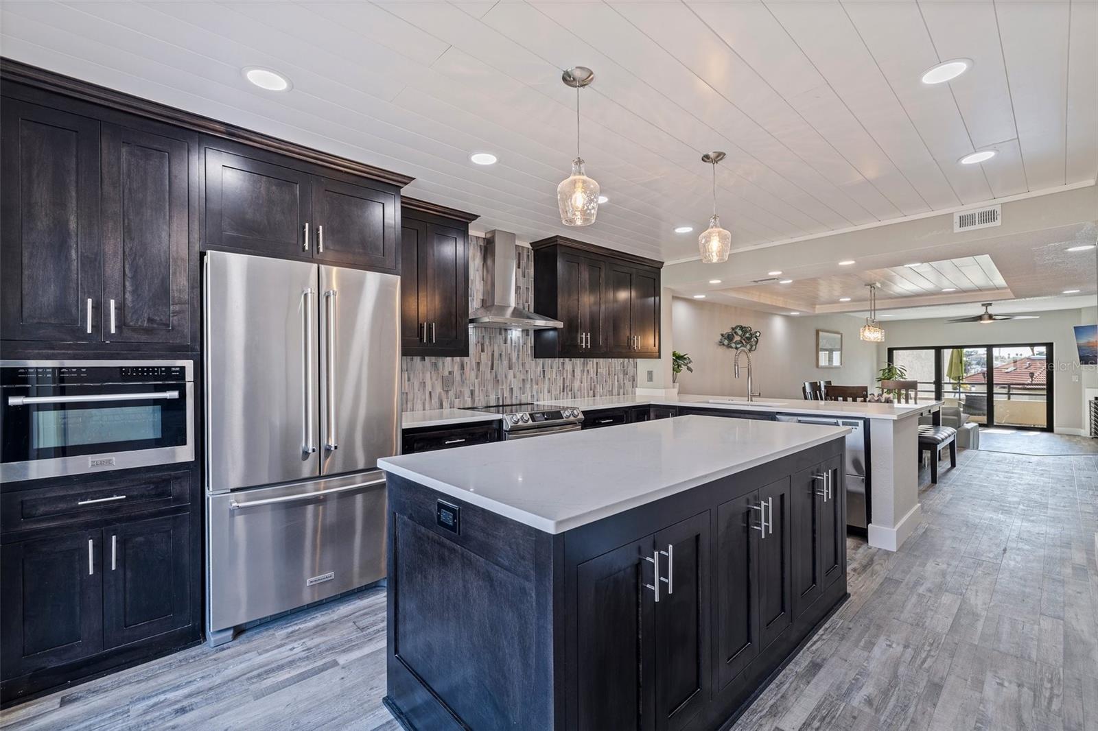- High Ceilings, Kitchen/Family Room Combo, Living Room/Dining Room Combo, Open Floorplan, Solid Wood Cabinets