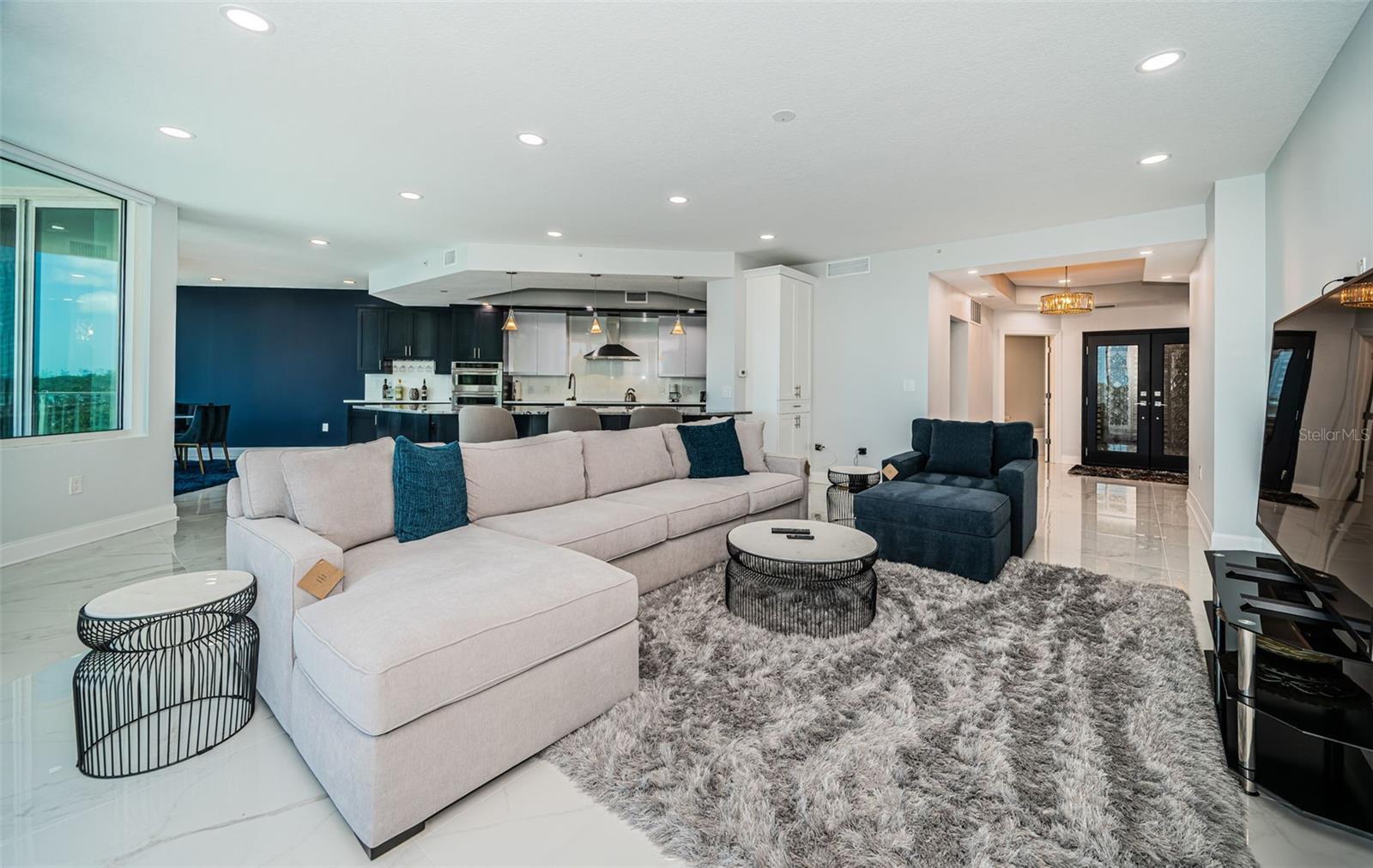 THIS BEAUTIFULLY UPDATED COASTAL CONTEMPORARY LUXURY RESIDENCE DELIVERS SWEEPING OPEN WATER VIEWS OF THE INTRACOASTAL WATERWAY! Located in the highly coveted community of Seaside, and adjacent to the renowned Belleair Country Club and golf course, you’ll love the feel and floorplan of this exceptional condominium with secure and convenient, under-building 2-car parking. Your private gated entrance and exquisite etched-glass double doors transition to a rich foyer and gorgeous panoramic waterviews. This brilliantly-reimagined open-concept unit features large form-factor porcelain floors, stunning new kitchen and baths, radiant modern lighting and electronic window treatments. The sumptuous chef’s kitchen boasts superior quartz surfaces with impressive quartz backsplash areas, lavish designer cabinetry, a fine stainless steel appliance package, a huge island bar/work center and pantry closet. Supported by an elegant matching drybar with wine chiller, your wonderfully-spacious dining area will inspire all with its magnificent water views. The fine living room opens to a fabulous 31ft-wide covered balcony overlooking the intracoastal waterway and the pool deck. The graceful owner’s suite provides terrific water views and opens to the covered balcony; suite includes a separate office/sitting room with its own pool/waterviews. Indulge yourself in the pampering owner’s bath with grand walk-in closet system, posh quartz vanities, coastal white cabinetry, superb dedicated cosmetics center with generous storage, and a luxurious walk-in rainshower with body sprays, body wand and large seating bench. The guest bedroom suite is very large and has a lovely walk-in closet system and a plush full bath with resplendent walk-in glass shower enclosure. You will appreciate the large in-unit multi-purpose storage room and separate laundry room. This residence has a leased 20,000lb boat slip. The community is pet friendly, and offers a heated pool, hot tub, lush mature landscaping and 24-hour gate guard. Bordering the grounds of the Bellevue Inn and the Belleair Country Club, and within minutes of fine dining, shopping and Clearwater Beach, this is a near perfect location to live the Florida dream. Wish to join the Belleair Country Club? By purchasing this unit, you will avoid the years of waiting for a membership. A great value in an outstanding location. Measurements are estimates. Buyer to confirm measurements.