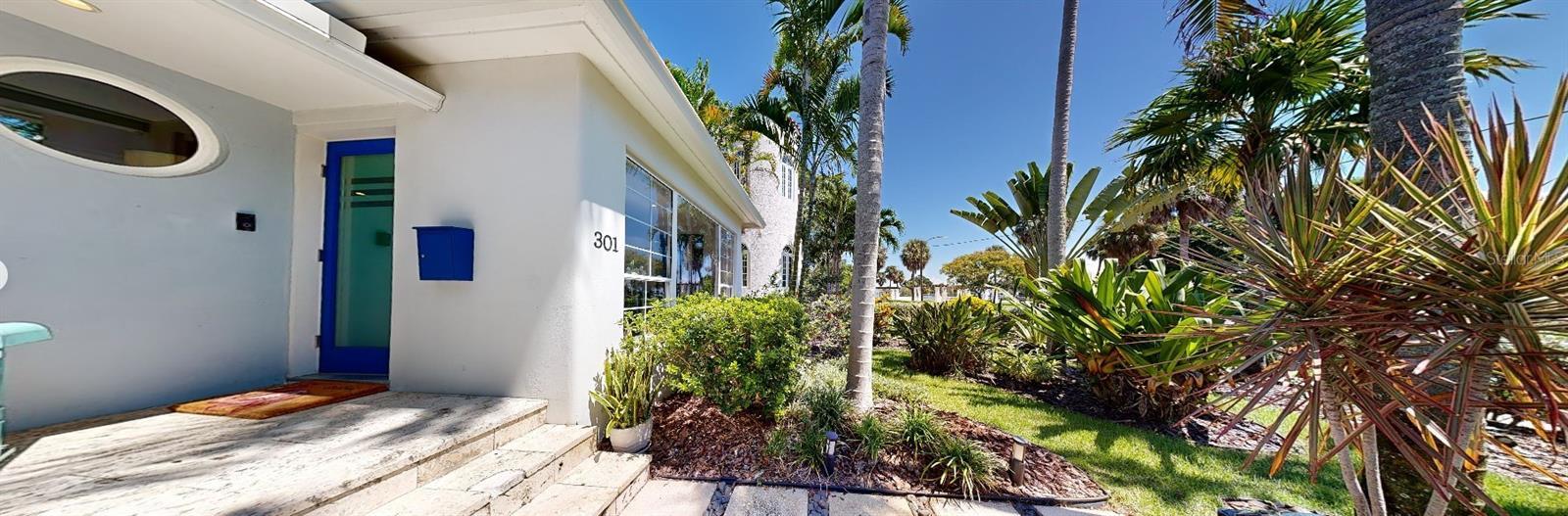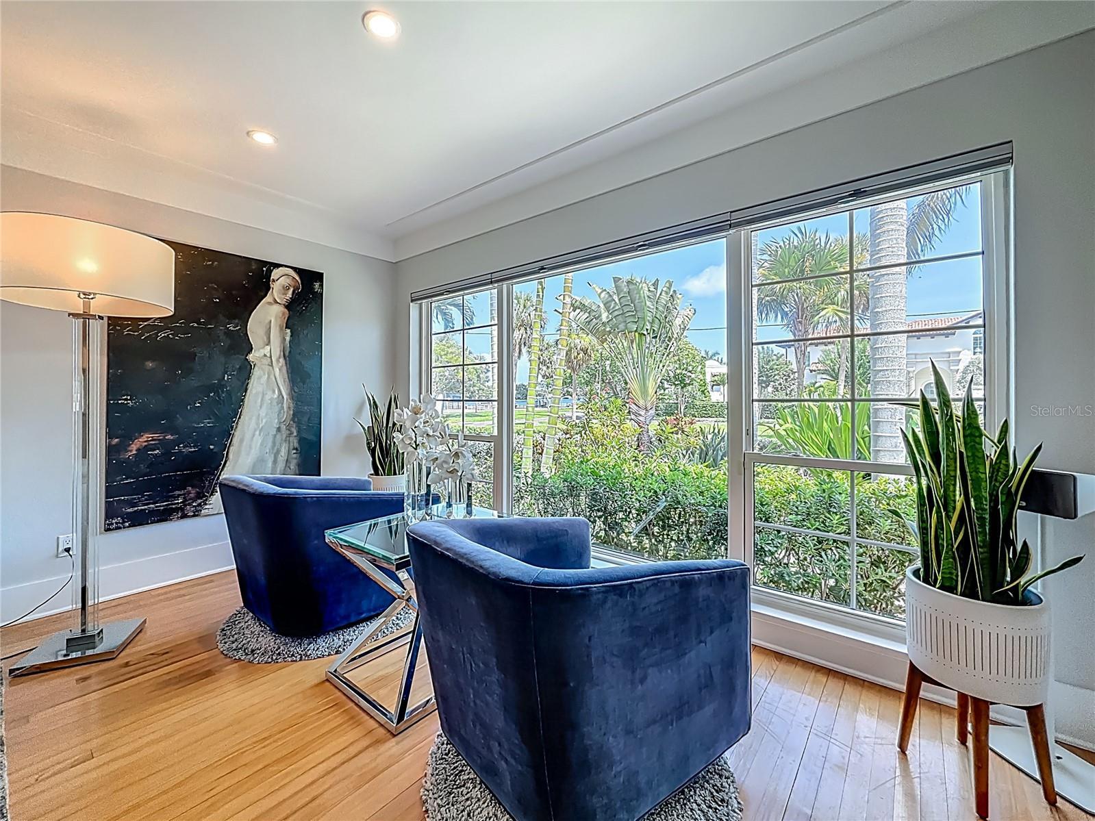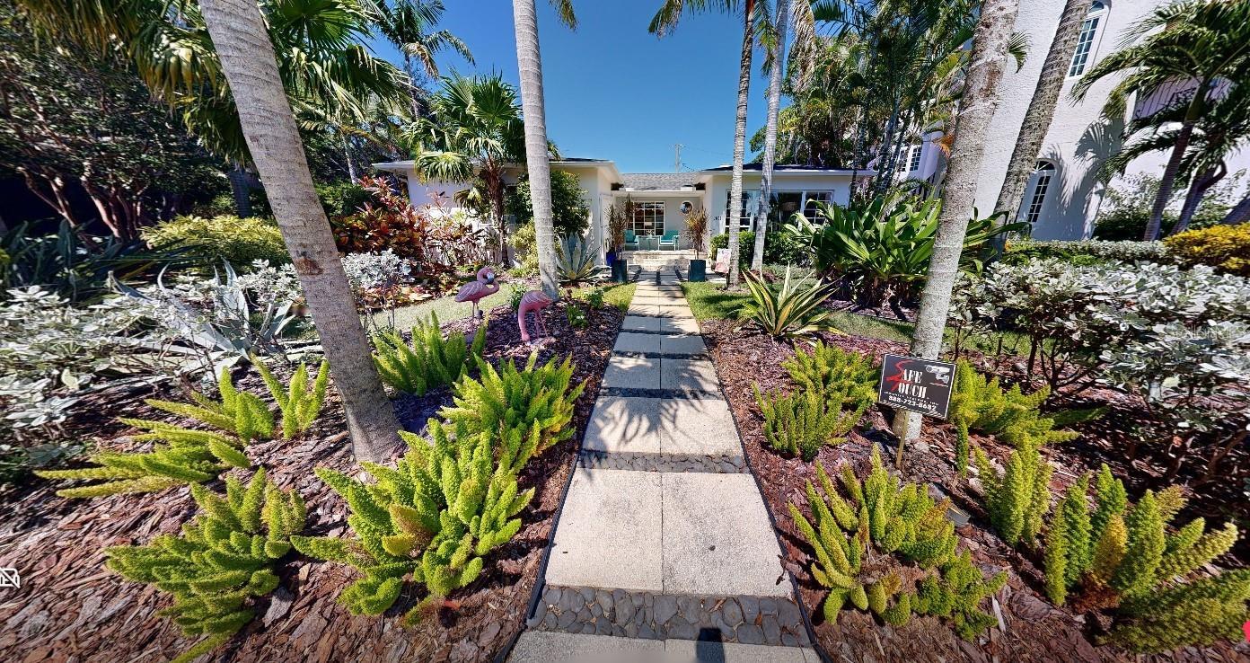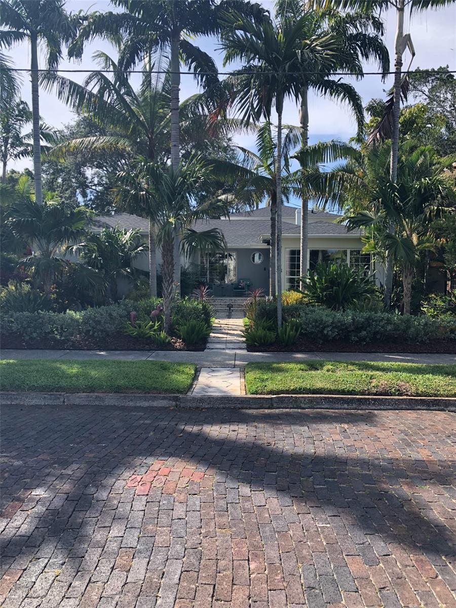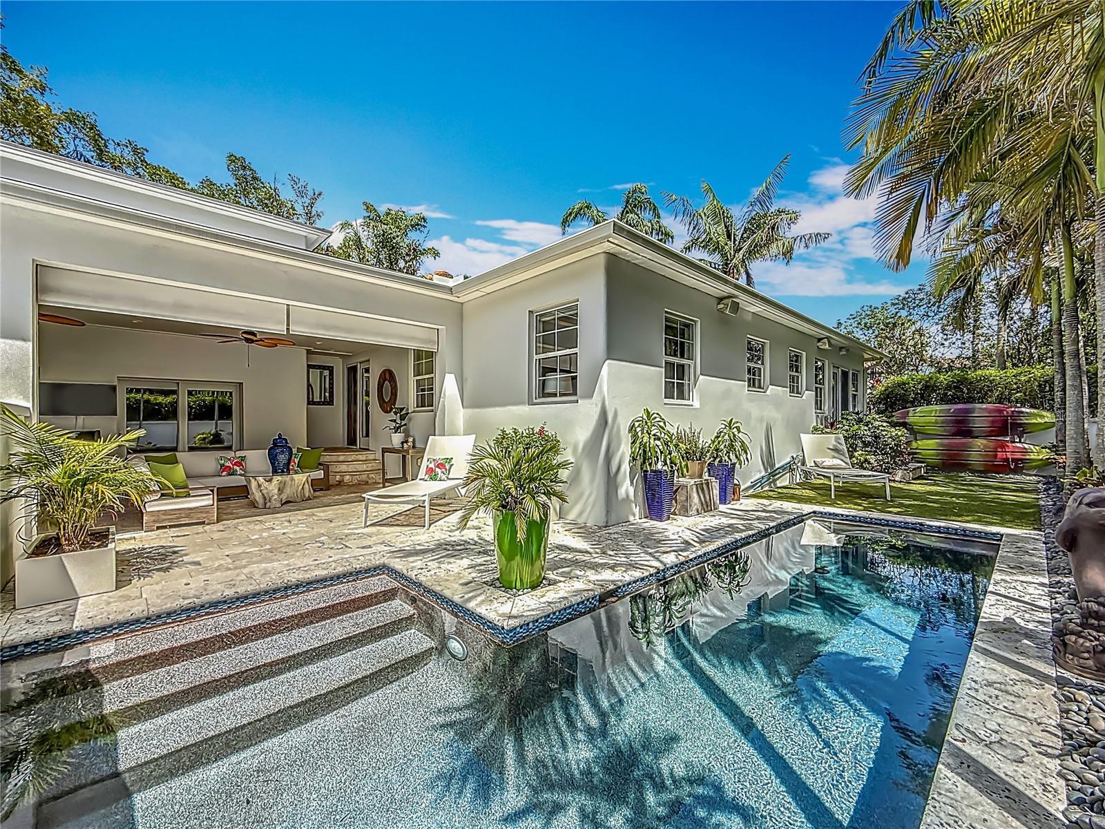 Under contract-accepting backup offers. Immaculate and stunning Mid-Century Modern home in historic Granada Terrace. Great water view and because of it's high elevation it has never been affected by past storms or hurricanes. Granada Terrace Park has sweeping water views across Coffee Pot Bayou and is the perfect location that allows you to walk out the front door and watch manatee and dolphins frolicking, drop in a kayak, take a long walk along the water to downtown, fish off the steps that Perry Snell installed for gondola tours or simply enjoy the quiet peace of the park. The serene garden entrance leads up to coral steps and a perfect porch to people watch. At the entry, you will find an open floor plan with a cozy sitting area that has breathtaking views of the water and an occasional wedding, a living room, dining room and open kitchen with an eat-in bar. The kitchen cabinets go perfectly with the original wood flooring for a retro, yet modern aesthetic. A primary suite with a graciously appointed bathroom has views of the park and doors to a small outside sitting area that lead to the turfed backyard, pool and lanai. A resplendent retreat. The second bedroom, also with ensuite bath, is located downstairs and would make a great space for a family member or guest room. Past the kitchen are stairs leading up to the private second primary or guest room with a full ensuite bath. Adjacent to the kitchen is a den that has many uses. Movie watching, cozying up to a good book, a wonderful play area for the kids or working from the built in desk. The den has doors that lead out to the lanai and pool area. A half bath located in the den provides convenient access on a pool day. The covered lanai and pool are hidden by a beautifully lush bamboo hedge and privacy wall. The pebble pool and no maintenance turf is easy on the kids and revered by dogs everywhere. There is also plenty of room to store the kayaks and paddle boards. The driveway and carport are to the side maintaining that clean front yard aesthetic. A storage area with a garage door that could house your scooters or a motorcycle for the inevitable downtown adventures is a handy space with access to the laundry room. Lutron lighting for complete control and customization of whole house illumination. Hunter Douglas custom blinds that open up and down. Landscaping lighting. Surround sound. The brick lined streets, immediate access to the third largest urban waterfront park system in North America, walking distance to vibrant downtown St. Pete and a small boat launch at Crisp Park make this undeniably the spot to enjoy all that the historic Old NE area has to offer.