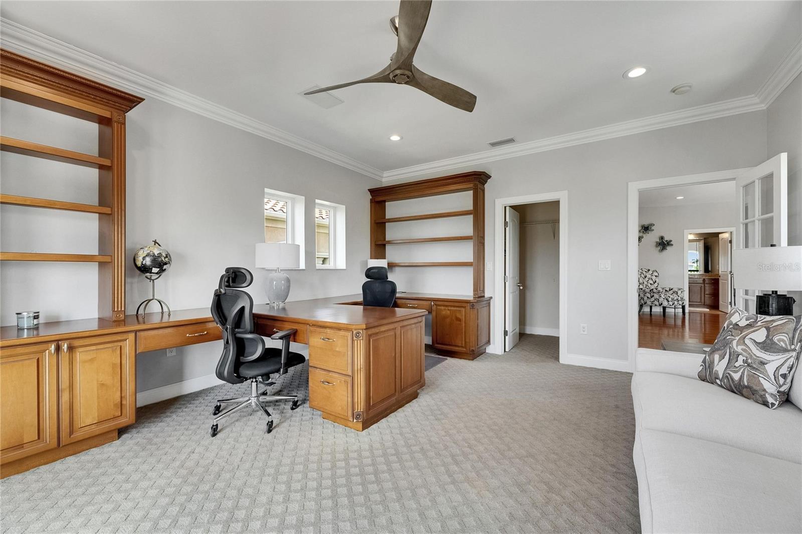 - Ceiling Fans(s), Crown Molding, High Ceilings, Kitchen/Family Room Combo, Open Floorplan, Solid Wood Cabinets, Stone Counters, Walk-In Closet(s)