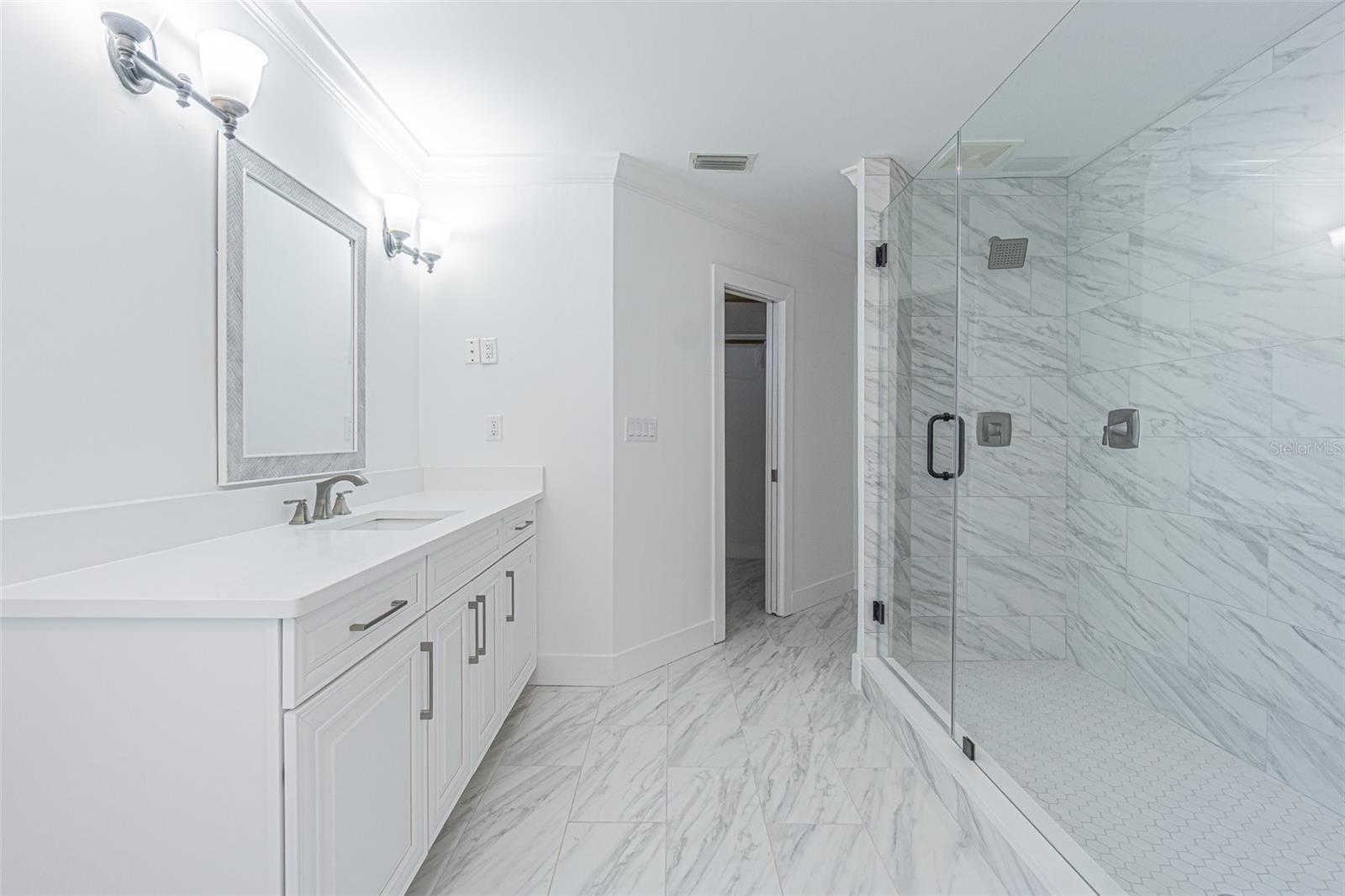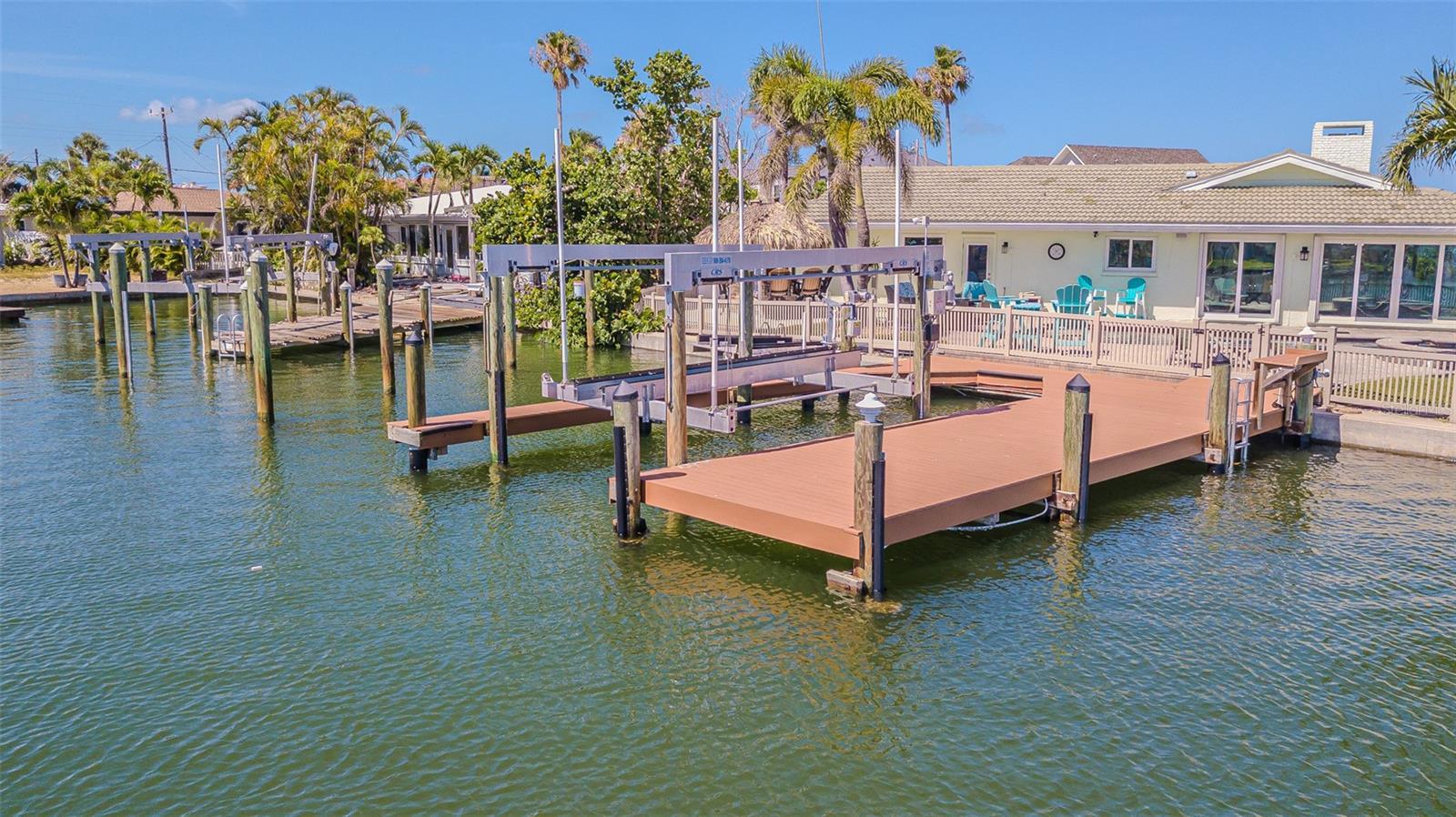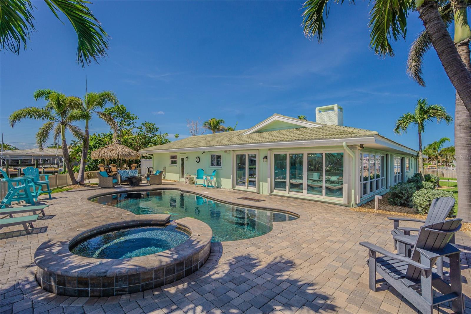 Welcome to coastal luxury living on St. Pete Beach, offering approximately 240 feet of pristine waterfront in the desirable Bahia Shores neighborhood. This beautifully renovated and fully remediated 4-bedroom, 3-bath home boasts 2,900 square feet of refined indoor space designed to showcase breathtaking water views and elegant finishes throughout. Step through the double front doors into a welcoming foyer and be captivated by imported travertine flooring that flows through the living, dining, kitchen, and master suite. Triple-pane impact windows and doors with hurricane shutters provide peace of mind and energy efficiency. The great room, dining room, kitchen, guest suite, and master bedroom all have stunning waterfront views, creating a serene, light-filled environment. The kitchen is a chef’s dream, featuring an expansive island, all-new cabinetry, and brand-new high-end stainless steel appliances. Retreat to the spacious master suite with a luxurious en-suite bathroom, complete with dual vanities, a soaking tub, glass block window, frameless glass walk-in shower, and modern finishes. The laundry room, custom cabinetry, a new washer and dryer, and a quartz countertop with utility sink for added convenience. Step outside to your private resort-style paradise, including a heated pool with spillover spa, PebbleTec finish, and mosaic mermaid and turtle inlays. The huge pavered deck and Tiki Hut are perfect for entertaining or relaxing in the Florida sun. Boaters will appreciate the dock with a 16,000 lb boat lift, an additional wet slip, jet ski lift, and fish cleaning station—a true waterfront playground. The wide-cap seawall was (installed 2003) to complete this impressive property. All this, just a short stroll to the beach! This exceptional home combines unparalleled water access, high-end finishes, and a prime location to give you the very best in waterfront living.