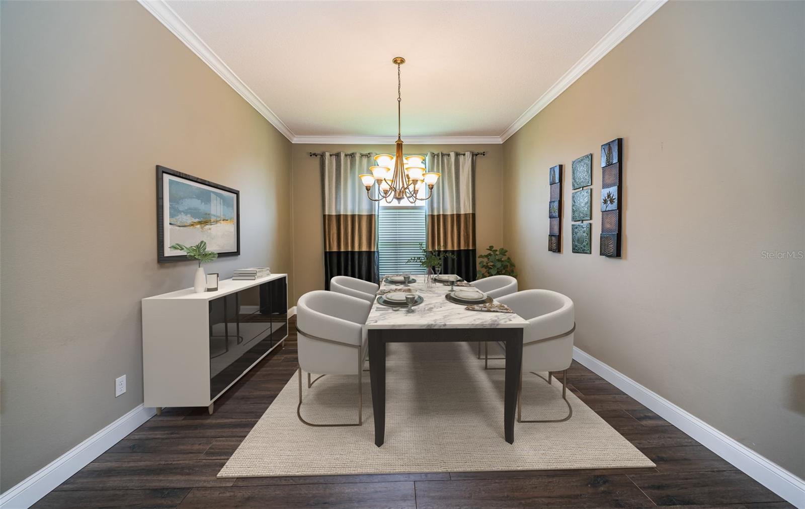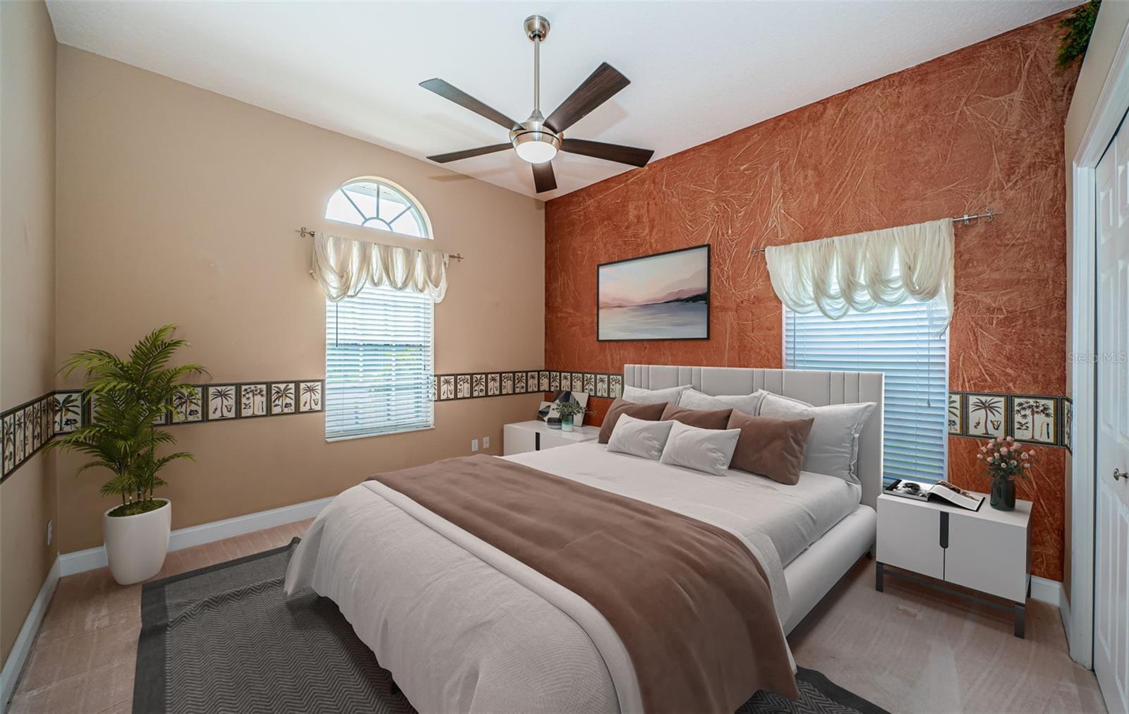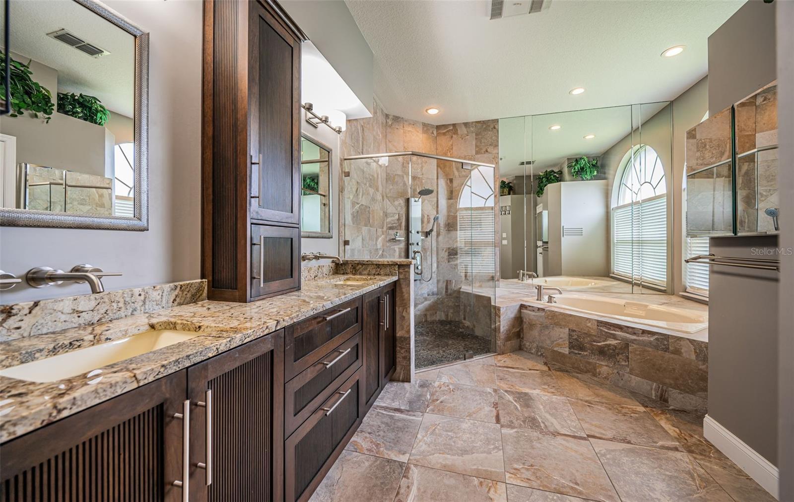 - Built-in Features, Ceiling Fans(s), Crown Molding, Eat-in Kitchen, High Ceilings, Primary Bedroom Main Floor, Solid Wood Cabinets, Split Bedroom, Stone Counters, Thermostat, Tray Ceiling(s), Walk-In Closet(s), Window Treatments