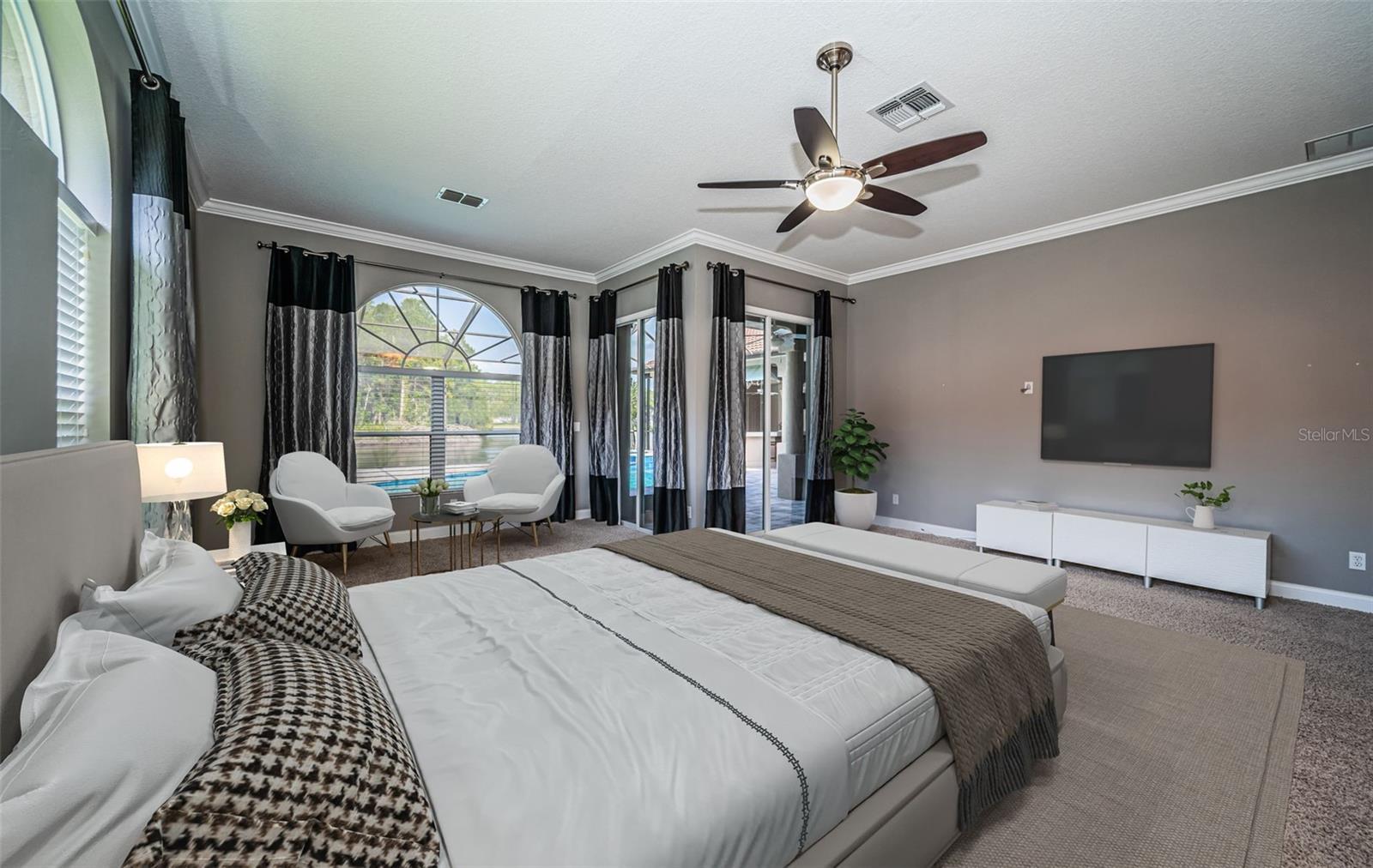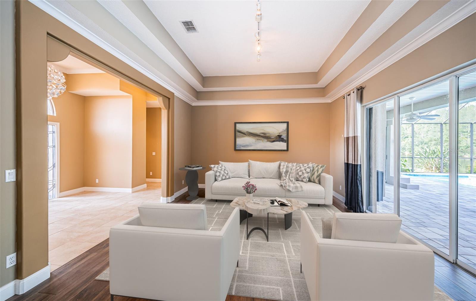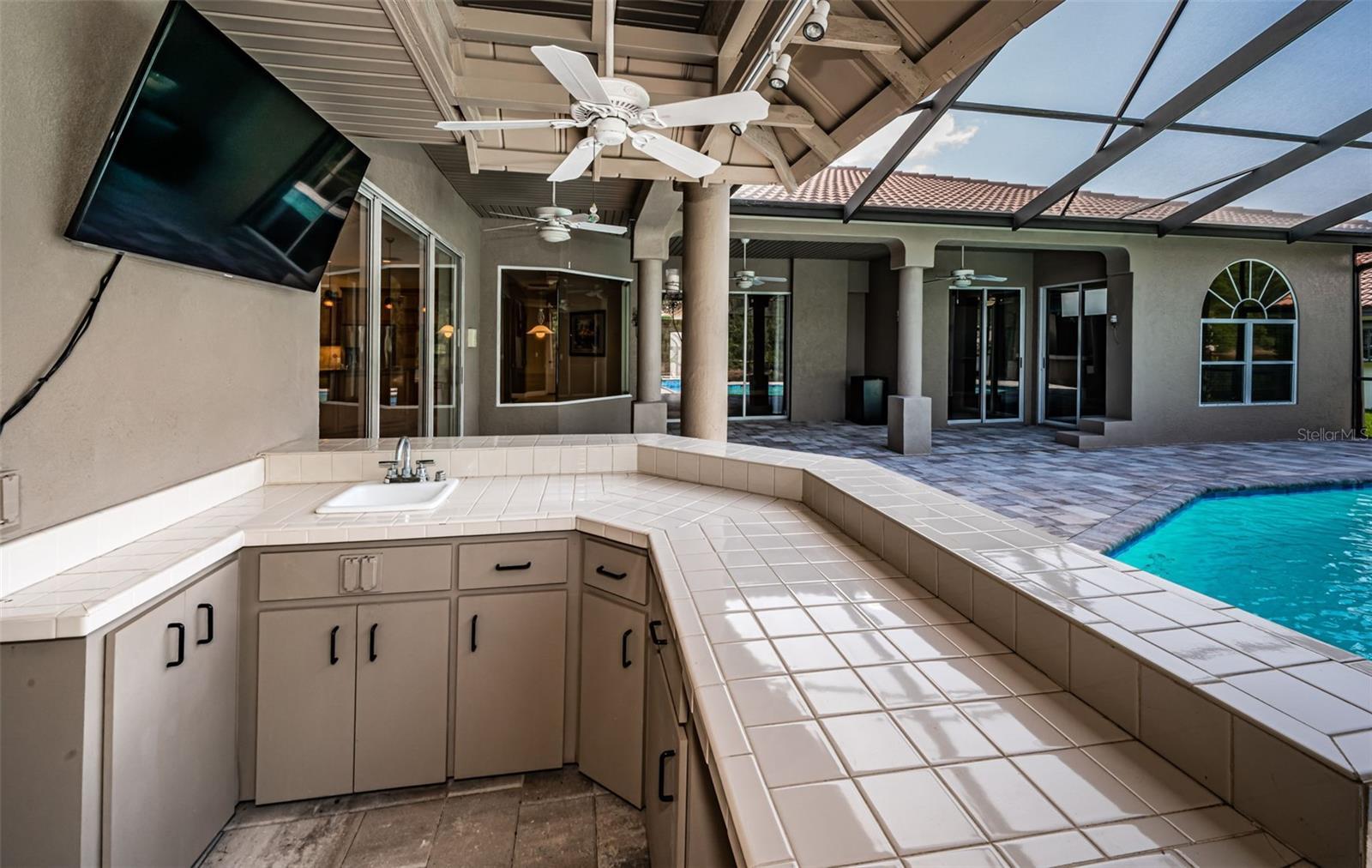 Under contract-accepting backup offers. One or more photo(s) has been virtually staged. Possible 4 Bedroom, Beautiful Custom Lakefront Home in the popular East Lake Corridor. NEW $40,000 tile roof 2020. TWO NEW Trane high-efficiency HVAC systems 2023. Pool was RESURFACED with a Pebble Tec finish, NEW pavers, and NEW mechanical equipment 2023. Located in a desirable NO FLOOD ZONE neighborhood, this move-in-ready home offers 3 bedrooms, one with Murphy bed that can be used as an office,( The dining room could easily convert to a 4th bedroom), 3 bathrooms, and 3164 sq ft of thoughtfully upgraded living space. Ideally situated, just minutes from top-rated beaches, parks, shopping, and dining, the home combines convenience, luxury, and peace of mind. Step inside to a grand 12-foot ceiling foyer with custom glass double doors and sidelights. The formal living and dining areas feature tiered ceilings and decorative architectural details, while the spacious family room includes a gas fireplace and built-in cabinetry. The updated kitchen boasts solid maple cabinets, stainless steel appliances, under and over-cabinet lighting, a pantry, and a breakfast nook with a 3-panel aquarium glass window overlooking the lake and pool. The oversized primary suite offers a large walk-in closet and a FULLY REMODELED en-suite bathroom with a soaking tub, a walk-in shower, and dual vanities. Two additional full bathrooms have also been REMODELED. Additional features include: Porcelain tile flooring throughout the main living areas and two bedrooms. Large laundry room with washer/dryer, utility sink, and upper storage cabinets. Covered lanai with pool, spa, and tiki bar featuring a sink, refrigerator, and Key West-style metal roof. Multiple storage closets throughout the home. Crown molding, glass block accents and more. Enjoy peaceful lake views and direct sightlines to a conservation area, where you can watch the sunrise and local wildlife from your private backyard oasis. This home offers luxury, functionality, and a prime location-perfect for Florida living.