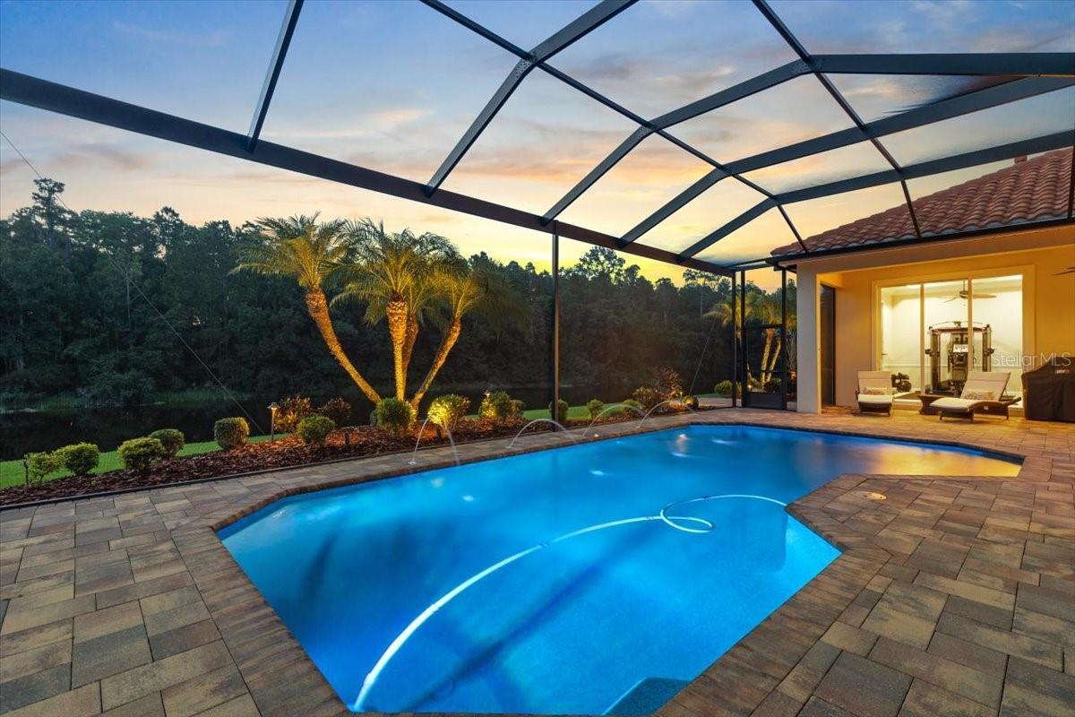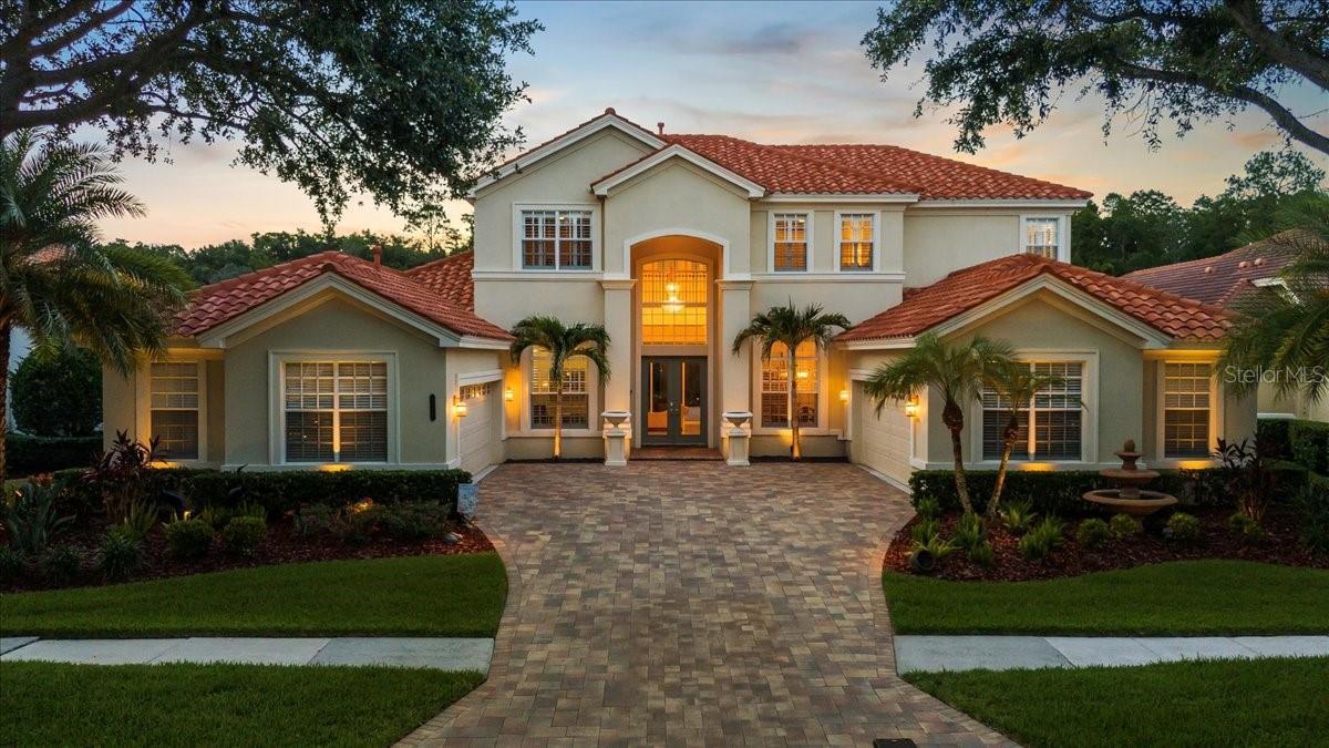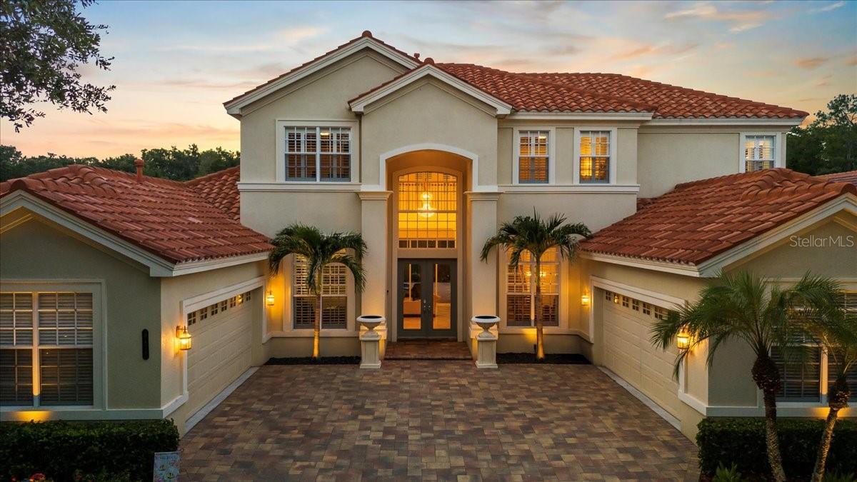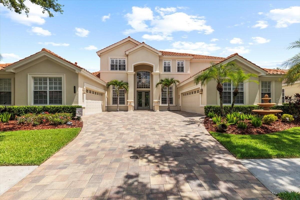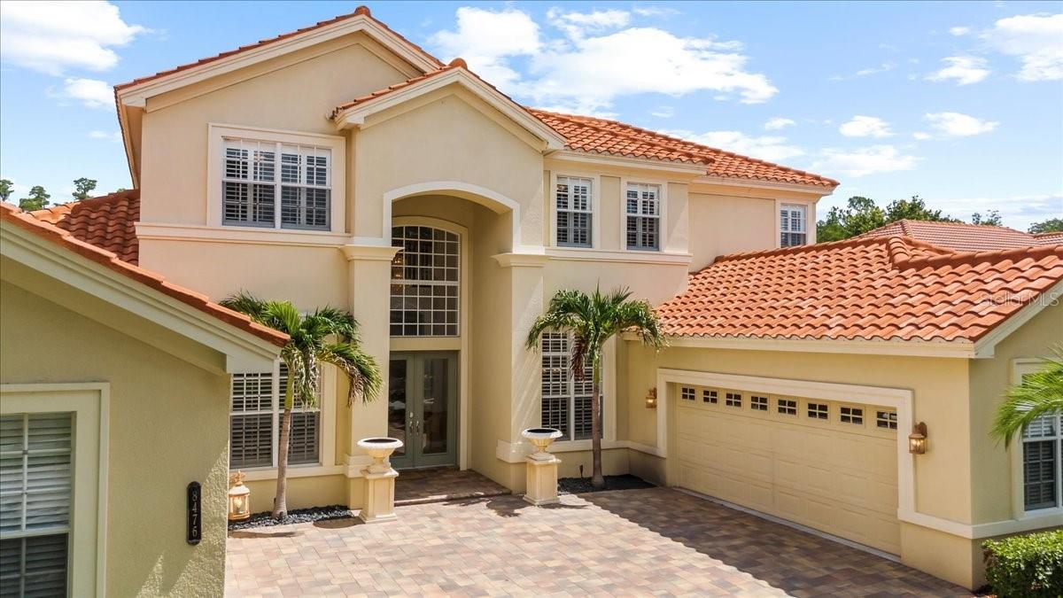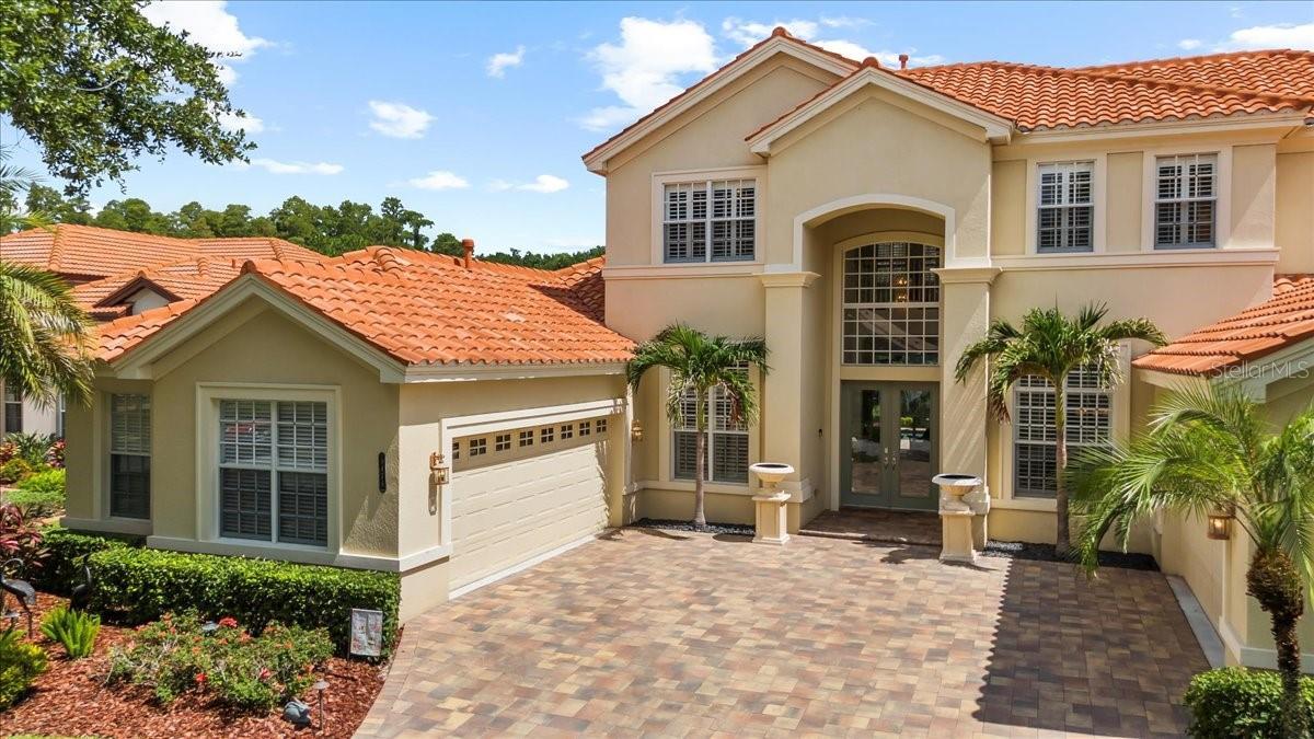 Under contract-accepting backup offers. Refined elegance meets timeless craftsmanship in this architecturally distinguished estate, tucked behind the gates of the coveted Grand Hampton community. Designed and built by Taylor Morrison, this masterfully curated residence offers an exceptional blend of sophistication and comfort—boasting 4,896 Sq-ft, 4 spacious bedrooms, 4 full bathrooms, a private office, bonus room, and a rare 4-car garage. From the moment you arrive, the home's commanding curb appeal sets the tone—lush, upgraded landscaping, dramatic outdoor lighting, and an oversized paver driveway lead to stately glass double doors. Inside, a grand chandelier anchors the foyer, while natural light cascades throughout, highlighting the polished tile floors that flow seamlessly across the main living areas. To the left, the executive office is appointed with elegant plantation shutters and architectural detail. To the right, a formal dining room exudes luxury with tray ceilings and refined millwork—perfect for upscale entertaining. Continue into the first living room where stacker sliding glass doors offer a sweeping, panoramic view of the pond and surrounding conservation area. Adjacent, the first full bathroom—conveniently serving as a pool bath—features a sleek glass walk-in shower and modern finishes. Beyond, French doors open to a private foyer with a lighted niche, leading to the exquisite primary suite. Designed for indulgence, the primary bedroom boasts double tray ceilings, dual walk-in closets, serene pond and conservation views, and direct access to the outdoor retreat. The spa-inspired en-suite bath includes dual vanities, a deep soaking garden tub, and a glass walk-in shower with a built-in bench. Off the living room, the dinette area is surrounded by bay windows, framing peaceful backyard vistas. The gourmet kitchen is a culinary showpiece—featuring upgraded solid wood cabinetry, shimmering quartz countertops, high-end stainless steel appliances, a gas cooktop, and an oversized pantry—all overlooking the second living area, complete with an entertainment niche, built-in surround sound system, and another set of stacker sliding glass doors to the lanai. The bonus room provides endless flexibility—ideal as a gym with stunning views of the pond. Nearby, the expansive laundry room offers abundant cabinetry, generous countertop space, and a deep utility sink—combining practicality with design. Upstairs, discover Bedrooms Two and Three, each with ample closet space, served by two additional full bathrooms. Bedroom Four—the largest of all secondary rooms—offers comfort and versatility for guests. Step into your private outdoor sanctuary—an exquisite retreat thoughtfully crafted for both relaxation and entertaining. The fully screened lanai showcases a heated saltwater pool with a self-cleaning system, elegant decorative jets, and ambient lighting that transforms the space from day to night. Multiple seating areas invite gatherings, quiet mornings, or alfresco dining under the Florida sky. With uninterrupted views of the tranquil pond and lush conservation area, and no rear neighbors in sight, this outdoor haven offers the ultimate in privacy and natural beauty. Situated within Grand Hampton’s resort-style, guard-gated community, residents enjoy access to a luxurious clubhouse, pools, tennis courts, fitness center, playgrounds, and scenic walking trails. This remarkable home is not just a residence—it’s a statement of style, serenity, and elevated living.