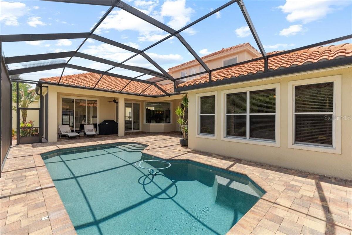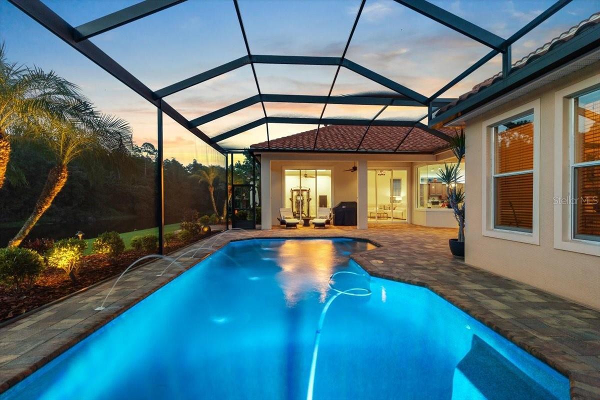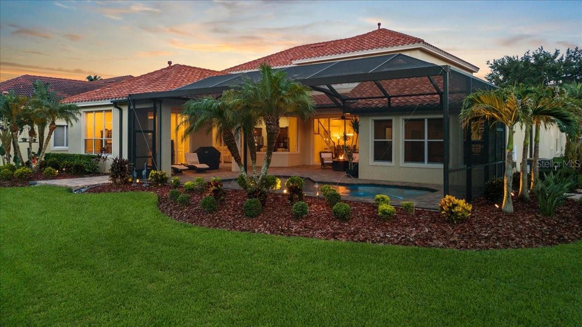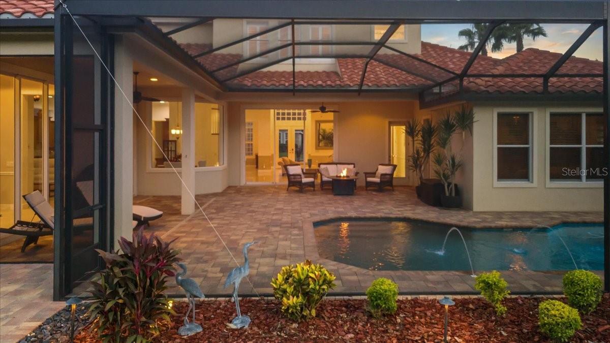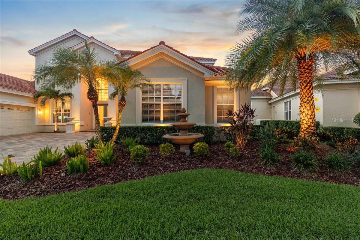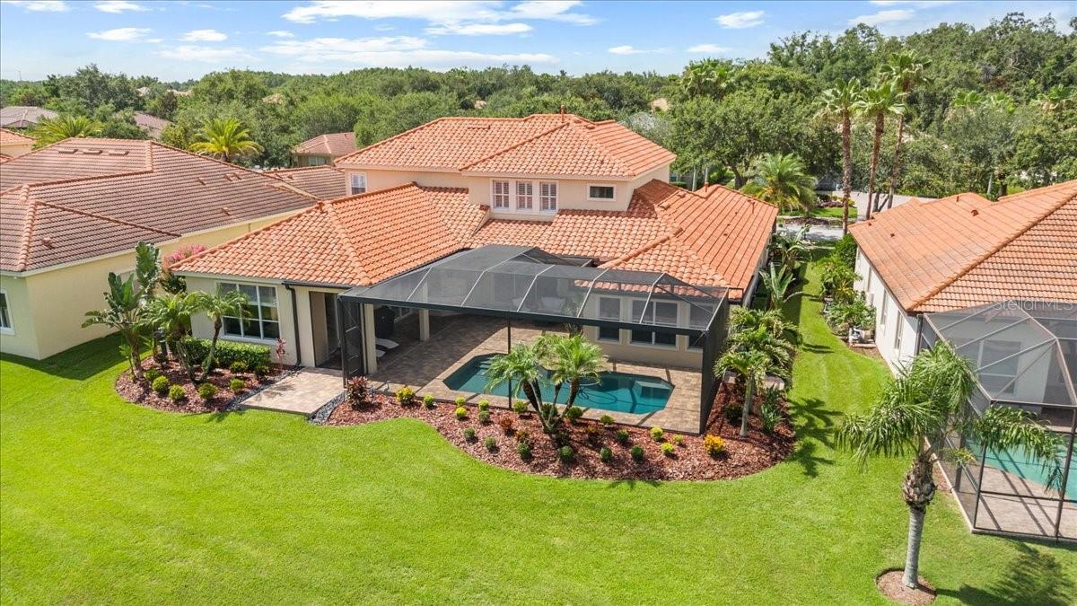 Under contract-accepting backup offers. Refined elegance meets timeless craftsmanship in this architecturally distinguished estate, tucked behind the gates of the coveted Grand Hampton community. Designed and built by Taylor Morrison, this masterfully curated residence offers an exceptional blend of sophistication and comfort—boasting 4,896 Sq-ft, 4 spacious bedrooms, 4 full bathrooms, a private office, bonus room, and a rare 4-car garage. From the moment you arrive, the home's commanding curb appeal sets the tone—lush, upgraded landscaping, dramatic outdoor lighting, and an oversized paver driveway lead to stately glass double doors. Inside, a grand chandelier anchors the foyer, while natural light cascades throughout, highlighting the polished tile floors that flow seamlessly across the main living areas. To the left, the executive office is appointed with elegant plantation shutters and architectural detail. To the right, a formal dining room exudes luxury with tray ceilings and refined millwork—perfect for upscale entertaining. Continue into the first living room where stacker sliding glass doors offer a sweeping, panoramic view of the pond and surrounding conservation area. Adjacent, the first full bathroom—conveniently serving as a pool bath—features a sleek glass walk-in shower and modern finishes. Beyond, French doors open to a private foyer with a lighted niche, leading to the exquisite primary suite. Designed for indulgence, the primary bedroom boasts double tray ceilings, dual walk-in closets, serene pond and conservation views, and direct access to the outdoor retreat. The spa-inspired en-suite bath includes dual vanities, a deep soaking garden tub, and a glass walk-in shower with a built-in bench. Off the living room, the dinette area is surrounded by bay windows, framing peaceful backyard vistas. The gourmet kitchen is a culinary showpiece—featuring upgraded solid wood cabinetry, shimmering quartz countertops, high-end stainless steel appliances, a gas cooktop, and an oversized pantry—all overlooking the second living area, complete with an entertainment niche, built-in surround sound system, and another set of stacker sliding glass doors to the lanai. The bonus room provides endless flexibility—ideal as a gym with stunning views of the pond. Nearby, the expansive laundry room offers abundant cabinetry, generous countertop space, and a deep utility sink—combining practicality with design. Upstairs, discover Bedrooms Two and Three, each with ample closet space, served by two additional full bathrooms. Bedroom Four—the largest of all secondary rooms—offers comfort and versatility for guests. Step into your private outdoor sanctuary—an exquisite retreat thoughtfully crafted for both relaxation and entertaining. The fully screened lanai showcases a heated saltwater pool with a self-cleaning system, elegant decorative jets, and ambient lighting that transforms the space from day to night. Multiple seating areas invite gatherings, quiet mornings, or alfresco dining under the Florida sky. With uninterrupted views of the tranquil pond and lush conservation area, and no rear neighbors in sight, this outdoor haven offers the ultimate in privacy and natural beauty. Situated within Grand Hampton’s resort-style, guard-gated community, residents enjoy access to a luxurious clubhouse, pools, tennis courts, fitness center, playgrounds, and scenic walking trails. This remarkable home is not just a residence—it’s a statement of style, serenity, and elevated living.