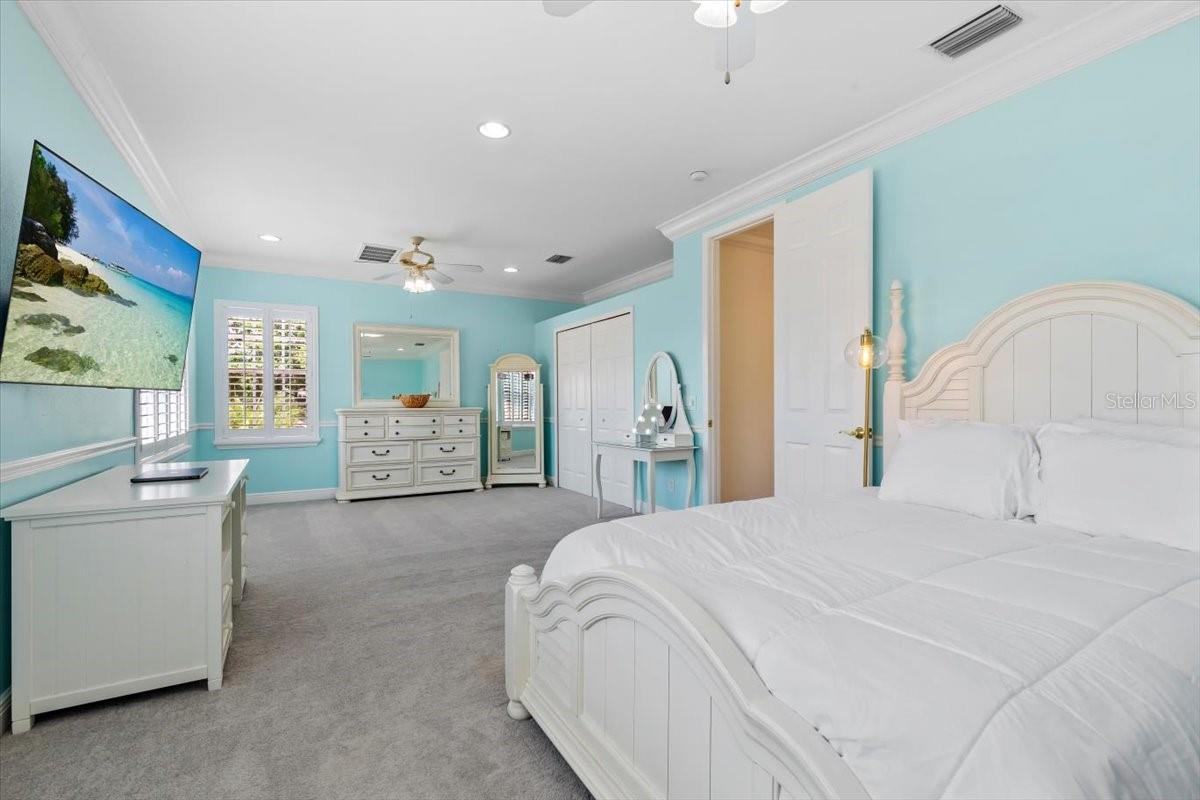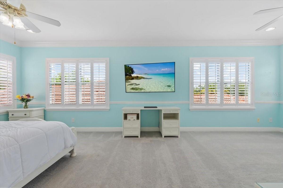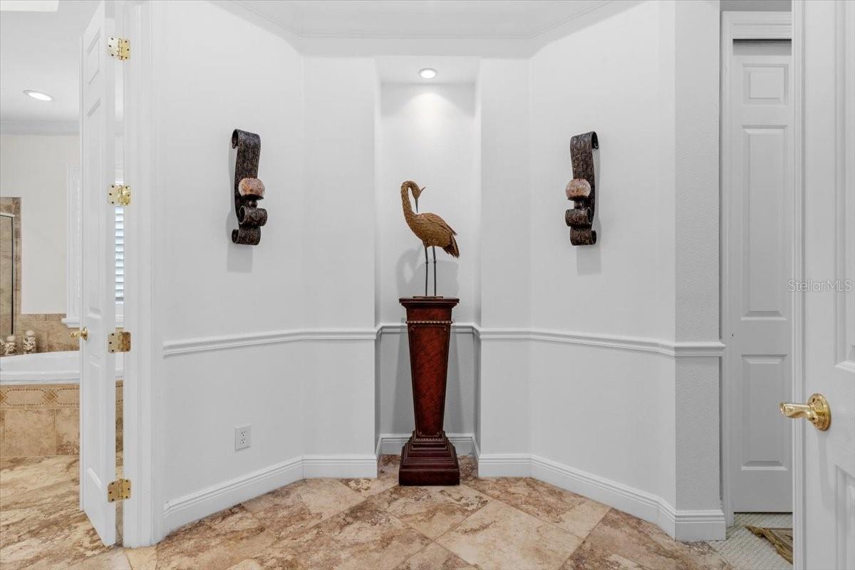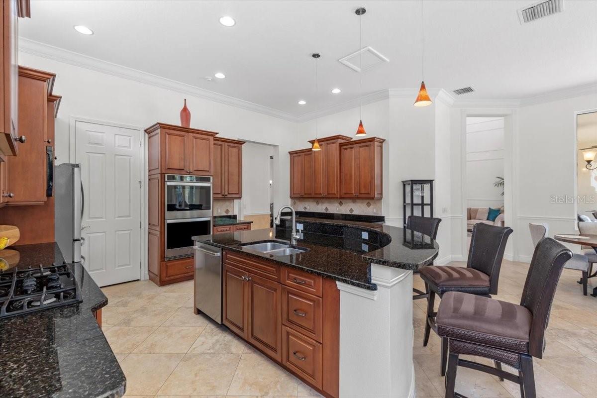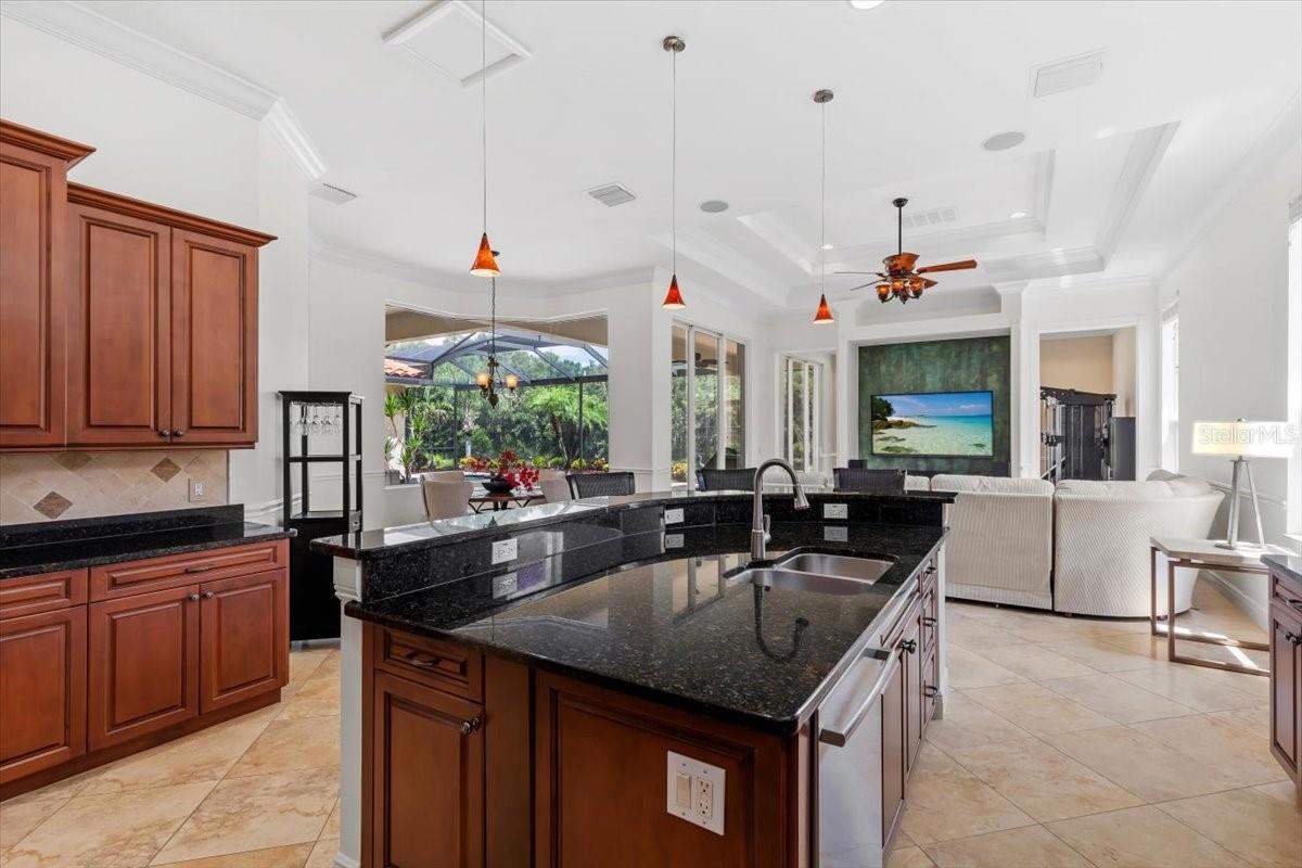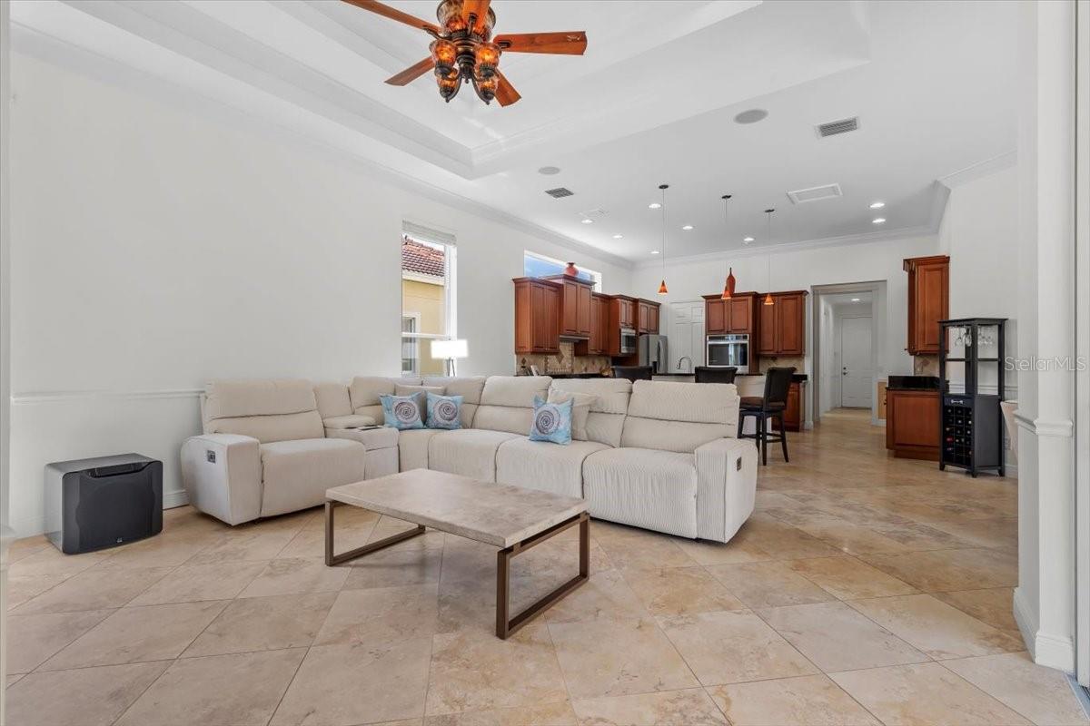 - Built-in Features, Ceiling Fans(s), Chair Rail, Crown Molding, Eat-in Kitchen, High Ceilings, In Wall Pest System, Kitchen/Family Room Combo, Open Floorplan, Primary Bedroom Main Floor, Solid Wood Cabinets, Stone Counters, Thermostat, Tray Ceiling(s), Vaulted Ceiling(s), Walk-In Closet(s), Window Treatments