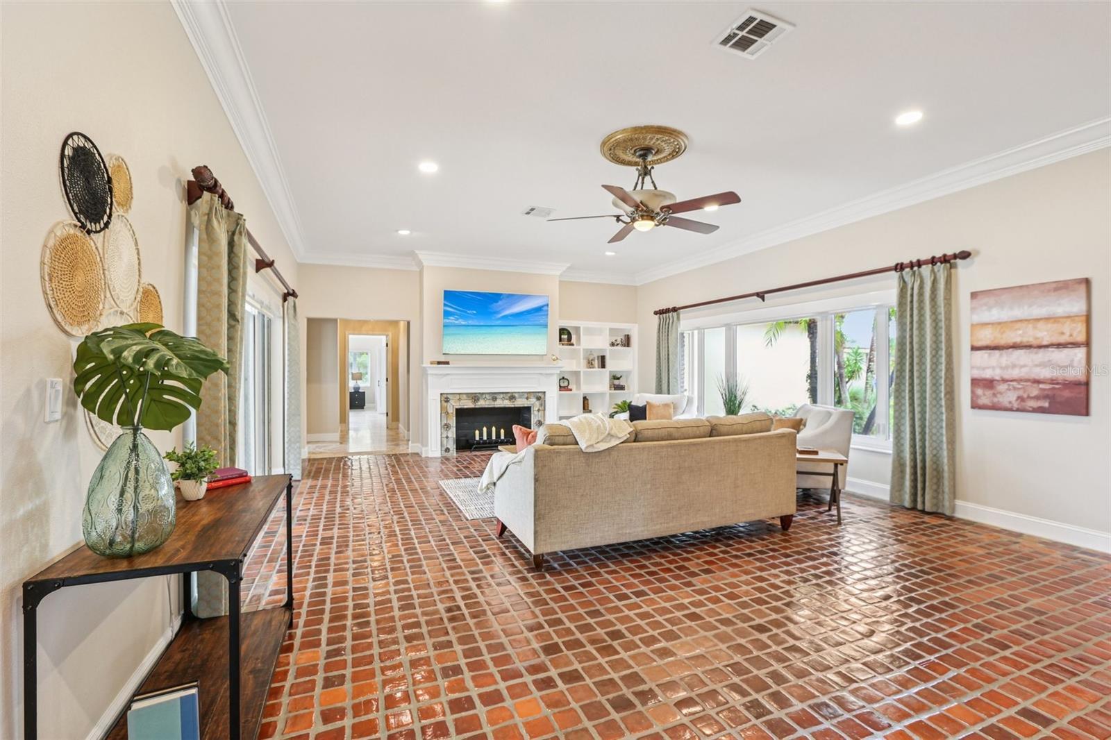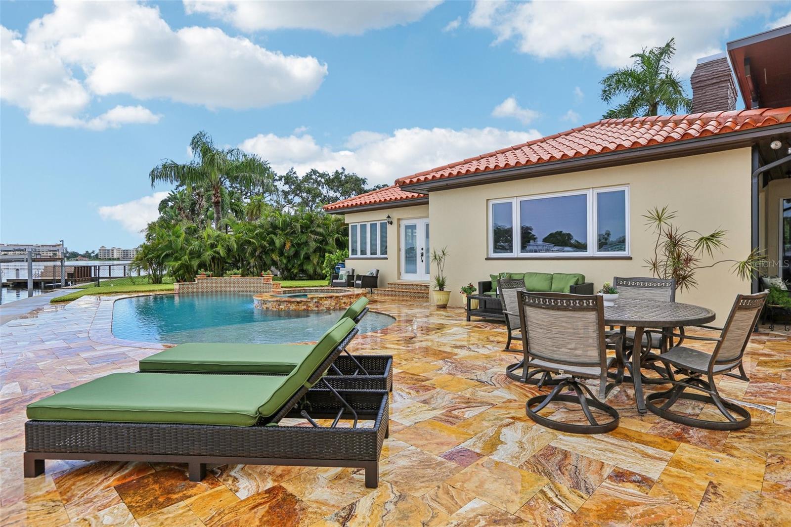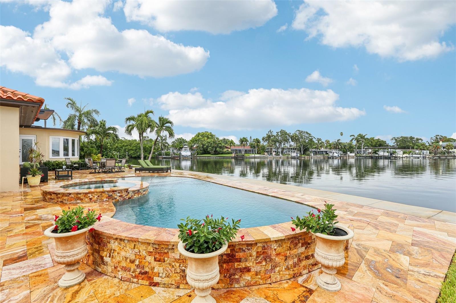 Under contract-accepting backup offers. Boater’s Paradise on Sailboat Water – This beautifully renovated home blends historic charm with modern luxury, tucked away on a quiet cul-de-sac with 150 feet of protected sailboat water and unrestricted access to the Gulf. In 2025, the property underwent a complete renovation, pairing timeless details with fresh, high-end finishes. Recent upgrades include a brand-new pool and spa finished in travertine pavers, an oversized seawall, and a new A/C system—making this a true turn-key waterfront retreat. Fresh exterior paint, crisp landscaping, and sweeping water views greet you at arrival. Step inside to find a dramatic solarium and great room, both designed to showcase the water. The great room features a cozy fireplace and expansive sliders that lead directly to the waterfront patio. The renovated kitchen and dining area take full advantage of the views, while the home’s two main-level master suites each offer comfort and privacy, including one overlooking the water. A spacious laundry room, guest bath, and oversized 23-foot garage complete the main level. Upstairs, two bedrooms and a full bath provide space for family or guests, with the east bedroom opening to a private balcony and sundeck—perfect for sunrise coffee or sunset cocktails. The outdoor living spaces are equally impressive, featuring a large travertine deck with a covered area for entertaining, surrounded by mature tropical landscaping and a wide-cap seawall stretching approximately 150 feet—an ideal setting for enjoying the open water views. Original Moravian tile floors, crown molding, and abundant natural light preserve the home’s character, while thoughtful updates—including a solar water heater assist and new main waterline—bring peace of mind. Set on a peaceful cul-de-sac location, yet only minutes to downtown St. Petersburg, Tropicana Field, the beaches, and major highways—this is a rare opportunity to own a truly special sailboat-water property with timeless charm and modern upgrades.