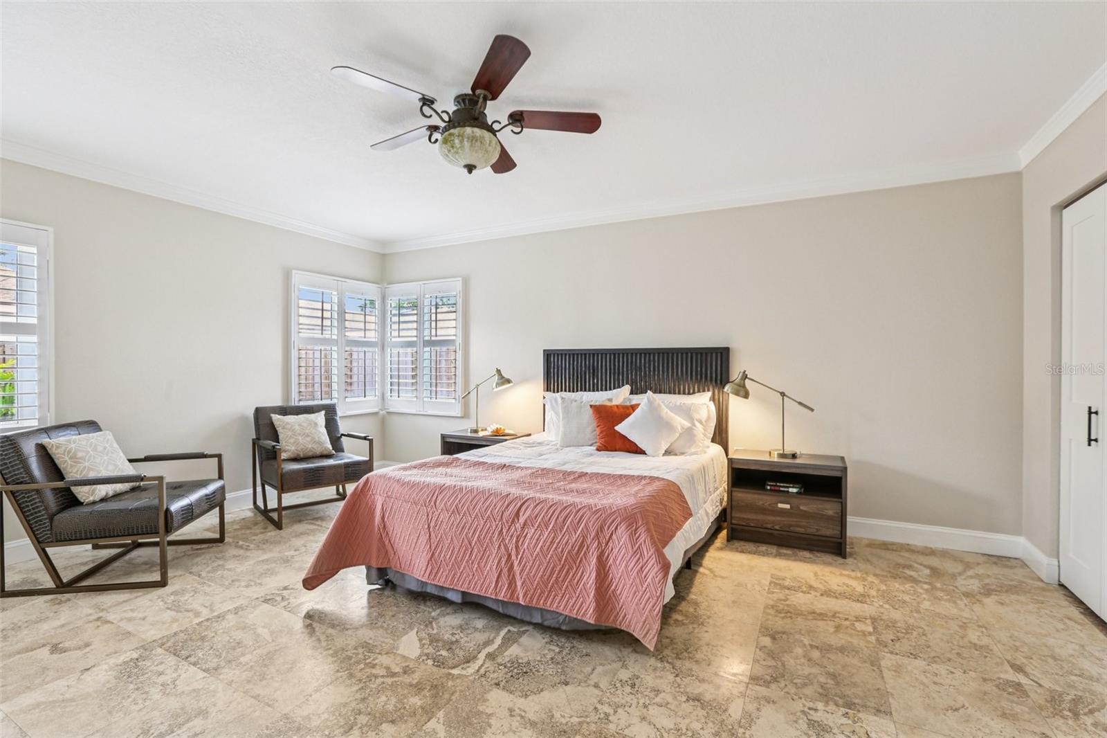 - Ceiling Fans(s), Crown Molding, Eat-in Kitchen, High Ceilings, Primary Bedroom Main Floor, Solid Surface Counters, Solid Wood Cabinets, Split Bedroom, Stone Counters, Thermostat, Walk-In Closet(s), Window Treatments
