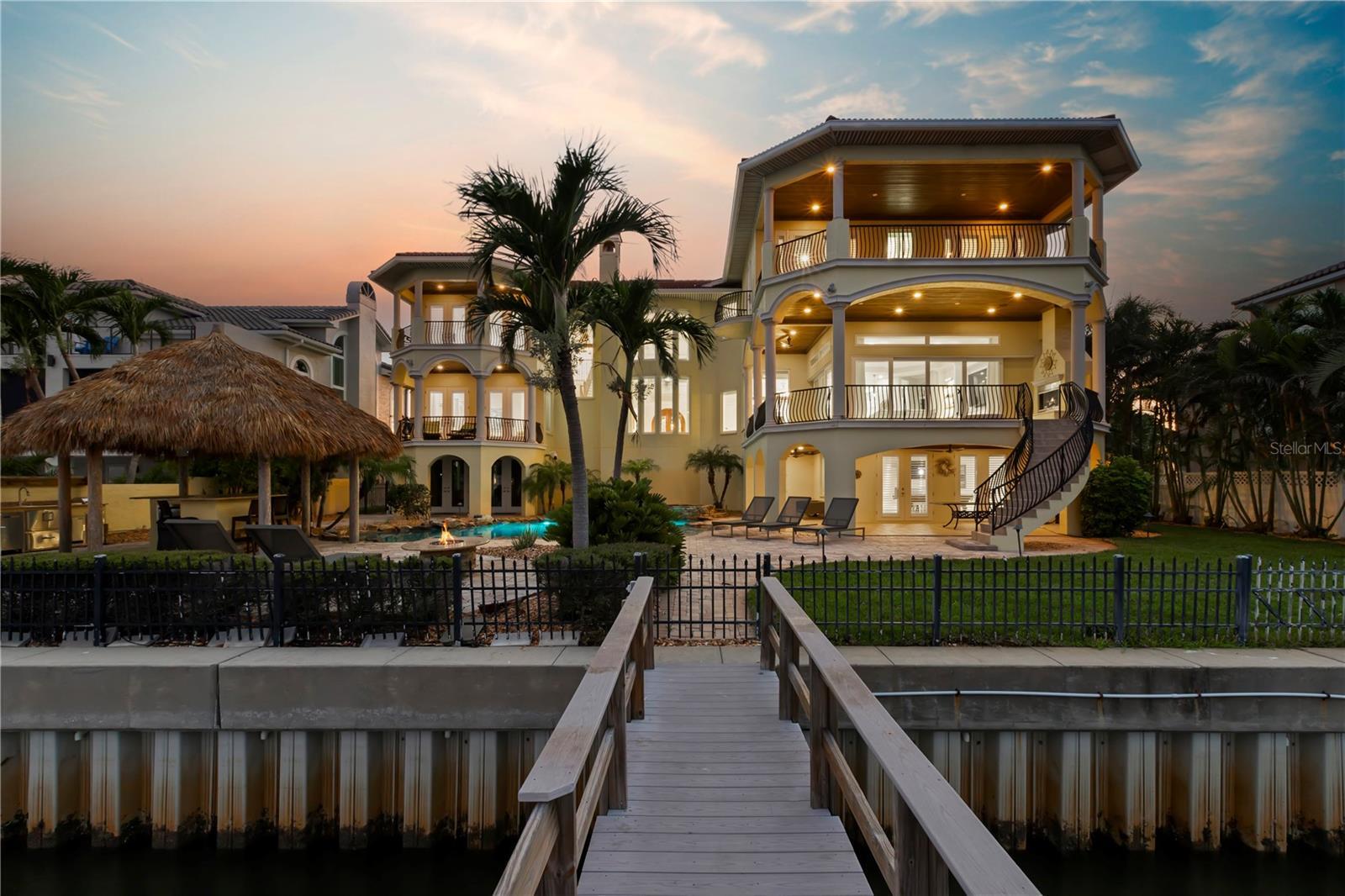 Welcome to an unparalleled sanctuary of luxury and elegance, positioned majestically on Florida’s Tampa Bay. This commanding estate offers an awe-inspiring tableau of open water views that captivate you the moment you step through the grand double glass and wrought iron doors. As you enter the magnificent formal living area, you're greeted by soaring cathedral ceilings and an inviting cast stone gas fireplace, creating an ambiance that is both impressive and warmly welcoming. Spanning an expansive 7,042 square feet, this palatial abode has been meticulously designed to balance grandeur with the comfort of a home. Recently remodeled to bring the coastal beauty indoors, the home marries elegance with modern coastal aesthetics. Nearly every room is a canvas for breathtaking views, including the brand new designer kitchen. This culinary haven features pristine coastal white cabinetry paired with a contrasting large center island and a breakfast bar, all topped with stunning quartzite stone countertops. Culinary artistry is found in its fabulous blue enamel stove with gas cooktop, complemented by top-of-the-line appliances including dual built-in Thermador refrigerators, two double drawer dishwashers, an ice maker, and a hidden butler’s pantry with additional wine refrigeration. The picturesque family room is a masterpiece of design, offering panoramic views of Tampa Bay through two walls of pocket (hurricane rated) sliding doors that seamlessly blend indoor and outdoor living. Custom crafted shelving and a wide screen complete this space, perfect for relaxation and entertainment. Each of the four generously sized bedrooms features walk-in closets and en-suite baths, providing private retreats for family and guests alike. The main living level hosts a guest suite, a richly paneled office, and a second spacious family room with a bar, adorned with exquisite wall coverings and a large flat-screen TV, creating the ideal setting for movie nights or watching the big game. Completing this level are a formal dining room, a casual dining nook with custom seating, a half bath, and an expansive laundry room. Ascend to the top floor, where the lavish primary suite awaits, featuring a luxurious en-suite bath and two massive walk-in closets equipped with custom closet systems. The opposite wing presents a cozy separate living area for two additional beautiful waterfront bedrooms, each adorned with coastal wall coverings. This estate is as practical as it is beautiful, featuring an exquisite elevator with glass panels for seamless access across all levels, all-new hurricane rated windows and doors, and expansive waterfront decks adorned with designer lighting and architectural mastery. Car enthusiasts will revel in the massive garage on the first level, providing ample space for a fleet of vehicles. The outdoor oasis is a true spectacle, featuring a lagoon-style pool with jacuzzi, a cozy grotto with waterfall, and easy beach entry. The backyard is an entertainer's dream with an enormous tiki bar and a stainless steel outdoor kitchen. With 100 feet of pristine waterfront, a large dock with wet slip ideal for a yacht, a tide slide system, and boat and jet ski lifts, this estate is not just a home, but a lifestyle to be cherished for a lifetime. Experience unparalleled luxury in Florida’s coastal paradise, where every detail has been crafted to create a home that is both a sanctuary and a statement.