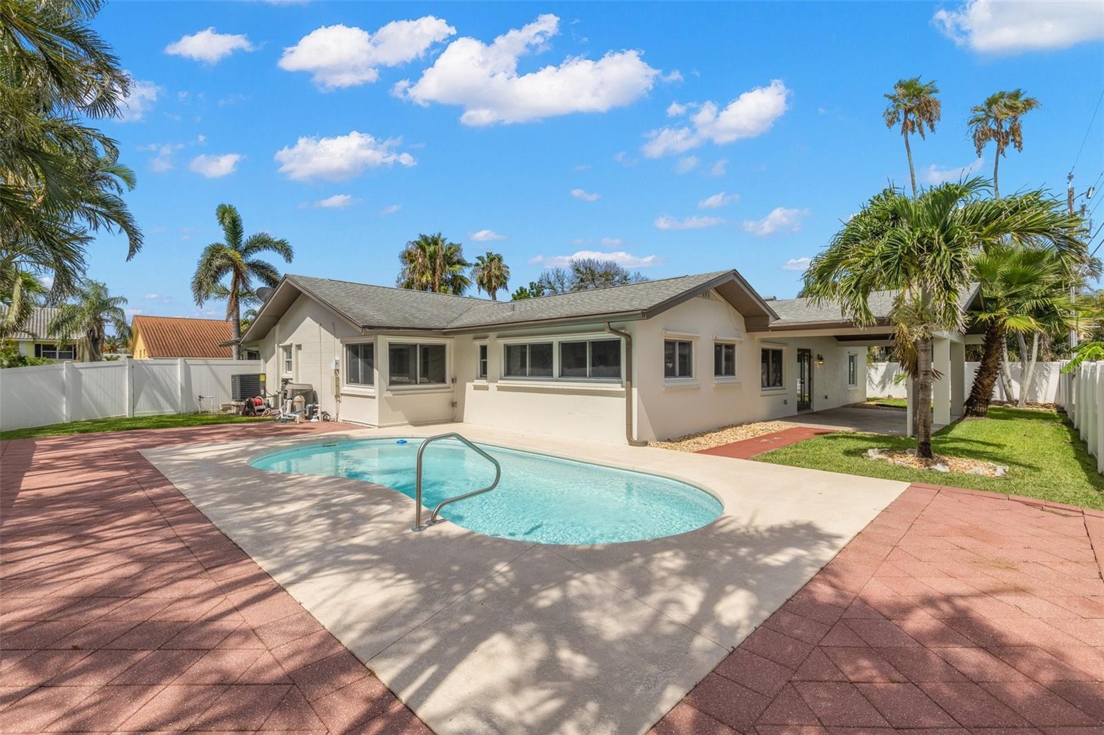 From the outside in, this 4 bedroom/3 bath home in Belleair Beach has been updated and renovated to bring it into the 21st century!! "NEW" kitchen, baths, flooring, fixtures, lighting, interior doors and neutral fresh paint inside and outside. Kitchen features NEW hard surface counters, cabinets, and stainless appliances. All of the baths feature NEW cabinets, hard surface vanities, lighting and fixtures. Did you see the primary walk-in shower? WOW! Enjoy the pool on those HOT Florida days and relax on the covered lanai. Privacy provided by the white vinyl fencing. Less than 2 blocks to the Gulf of America and Clearwater Harbor. This home is move-in ready, so make this concrete block/stucco YOURS in 2025!