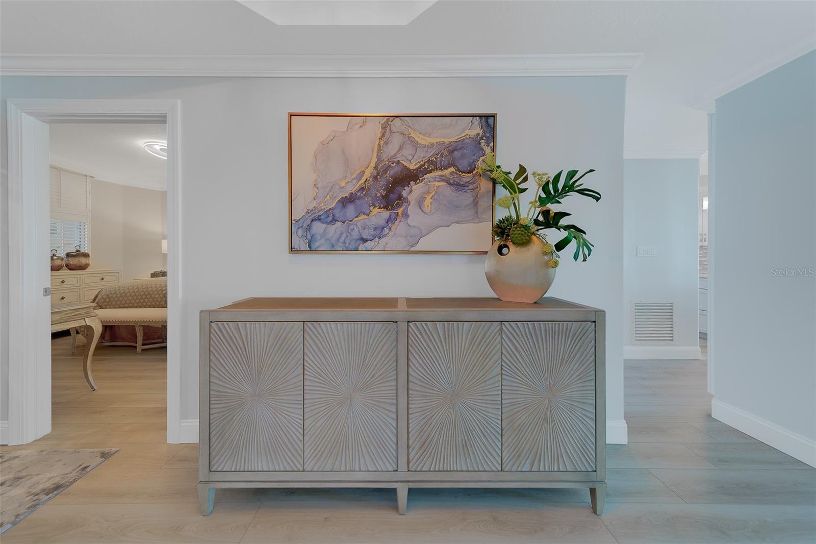 - Built-in Features, Chair Rail, Crown Molding, High Ceilings, L Dining, Solid Wood Cabinets, Tray Ceiling(s), Window Treatments
