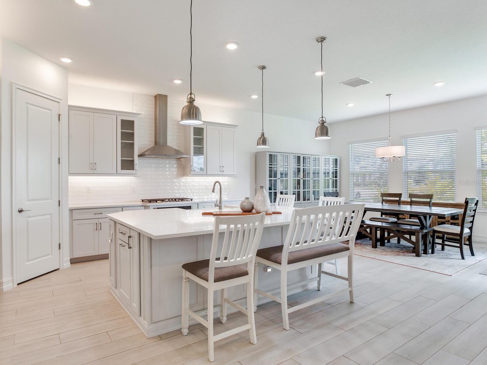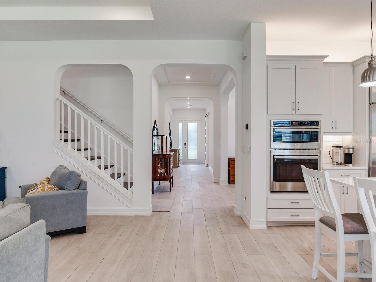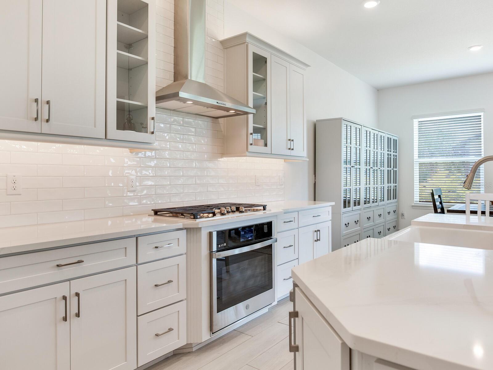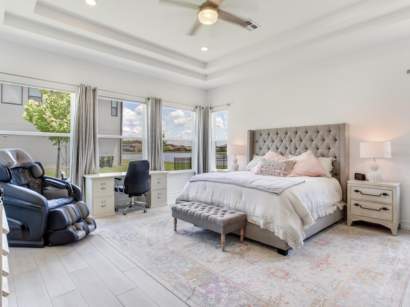 Welcome to refined Florida living at 6057 Marsh Trail Drive, located within the exclusive, gated community of Tarramor Estates in Odessa. Built in 2023, this beautifully upgraded modified Amberly floor plan offers 5 bedrooms, 4 baths, and 3,615 square feet of thoughtfully designed living space on a generous .28-acre lakefront lot—providing both privacy and room to dream. From the moment you arrive, the home makes a statement. Barrel tile roofing, full gutters, the California Color Package, coach lighting, and lush professional landscaping create striking curb appeal, while the full-lite obscure glass front door sets a warm, modern tone. Inside, 10-foot ceilings, wood-look tile flooring, and an open-concept layout deliver a light, airy feel perfect for everyday living and entertaining. The heart of the home is the designer kitchen, showcasing Level 4 Calcutta Gold Silestone countertops, GE stainless steel appliances, a 36” gas cooktop, built-in wall oven and microwave, 42” Alpine-painted cabinetry with crown molding, soft-close drawers, custom pull-outs, a farmhouse apron-front sink, and a full-height custom backsplash. An oversized island with abundant seating anchors the space, while the walk-in pantry with ventilated wood shelving is a chef’s dream. A formal dining room offers elegant entertaining, and expansive sliders from the main living area lead to a covered patio with serene water views. The side yard offers ample room for a future pool, outdoor kitchen, and play space, making it ideal for creating your own private outdoor oasis. Seller is offering a concession toward a side-yard fence, adding flexibility for pets, play, or additional privacy. The flexible floor plan includes a dedicated flex space—perfect for a home office, gym, or playroom—enhanced by frosted glass solid-core barn doors for style and privacy. The owner’s suite is a true retreat, featuring a tray ceiling, dual custom walk-in closets, and a spa-inspired bath with an oversized soaking tub, a semi-frameless glass shower with dual shower heads and rain feature, and dual vanities with Level 4 Silestone countertops. A split-bedroom design ensures comfort and privacy: two bedrooms share a Jack-and-Jill bath, another enjoys its own private bath, and upstairs you’ll find a versatile fifth bedroom with full bath and designer walk-in closet—ideal as a guest suite, media room, or second home office. Additional highlights include a 3-car garage with epoxy floors, laundry room with sink and cabinetry, whole-home LED recessed lighting, 15 SEER Carrier HVAC, tankless water heater, Low-E dual-pane windows, CAT 5 and USB outlets, Sensi programmable thermostats, Ring doorbell, MyQ smart garage technology, and washer and dryer included. Tarramor residents enjoy resort-style amenities, including a heated pool, state-of-the-art fitness center, and elegant clubhouse. Zoned for A-rated schools—Hammond Elementary, Martinez Middle, and Steinbrenner High—with convenient access to shopping, dining, golf, beaches, Tampa International Airport, and downtown Tampa. Located in Flood Zone X (no flood insurance required) with no CDD fees, this move-in-ready home delivers luxury, flexibility, and long-term value in one of Odessa’s premier gated communities.