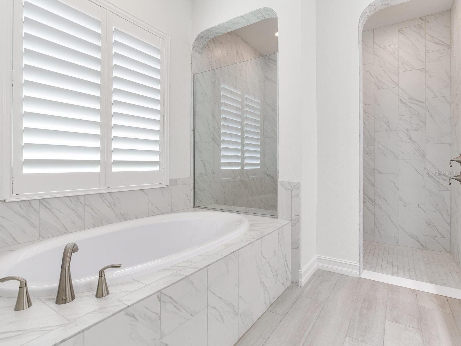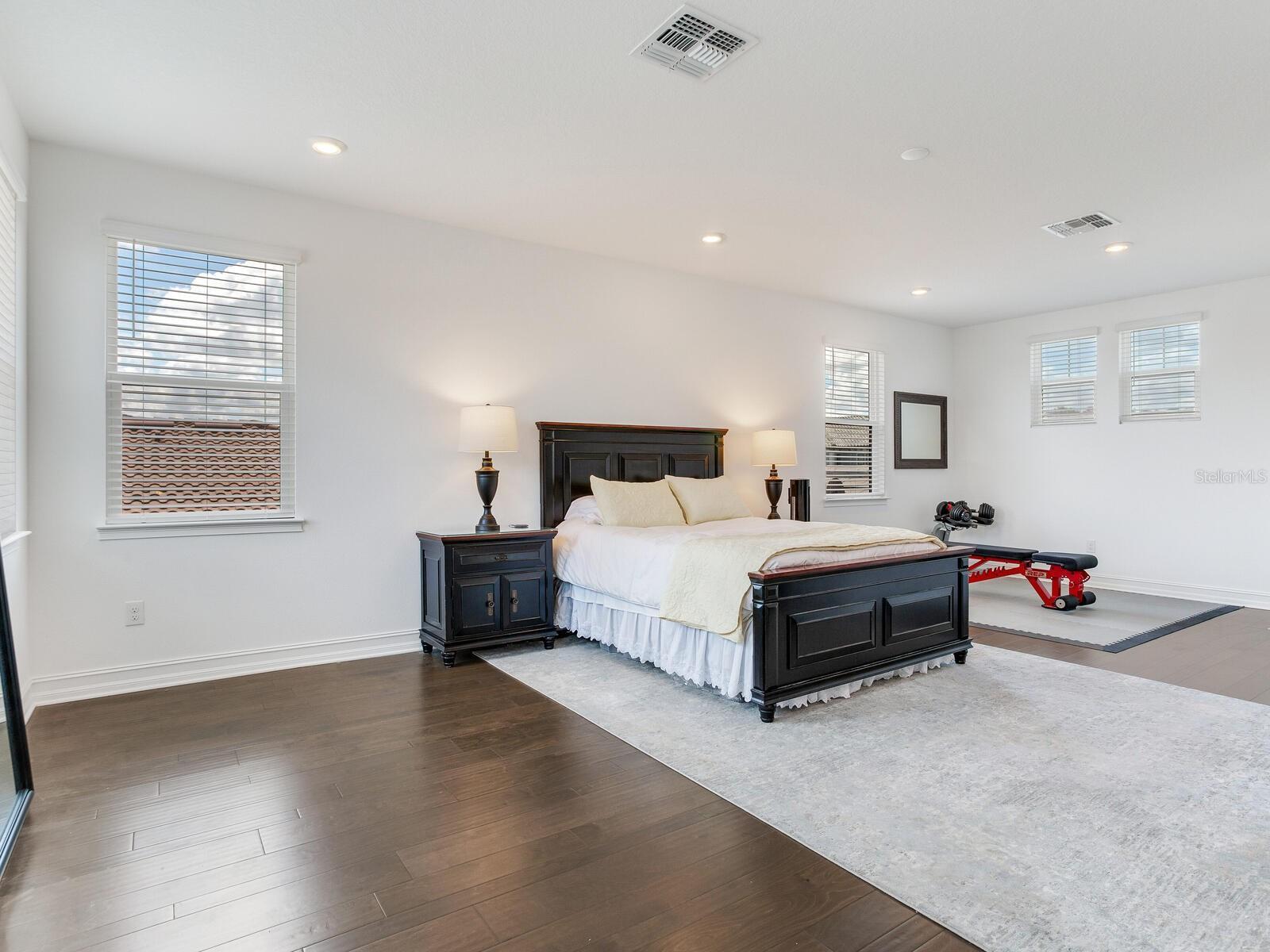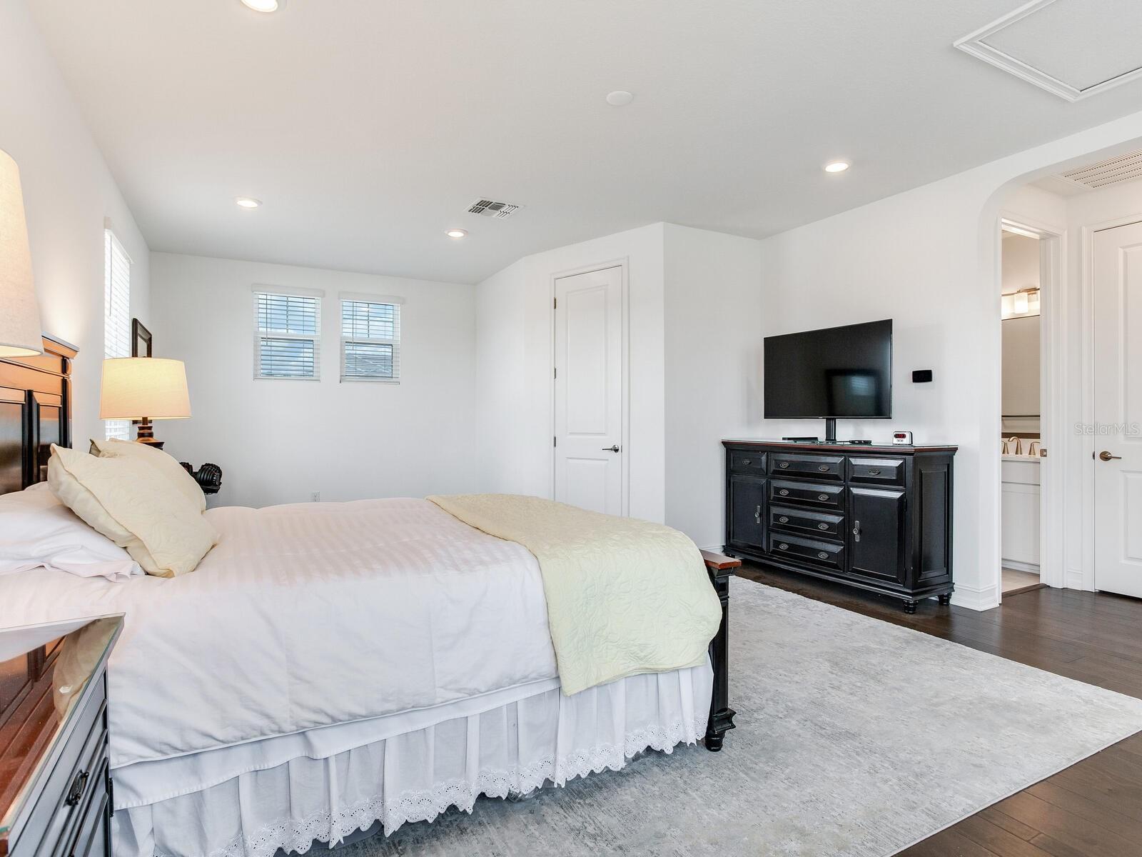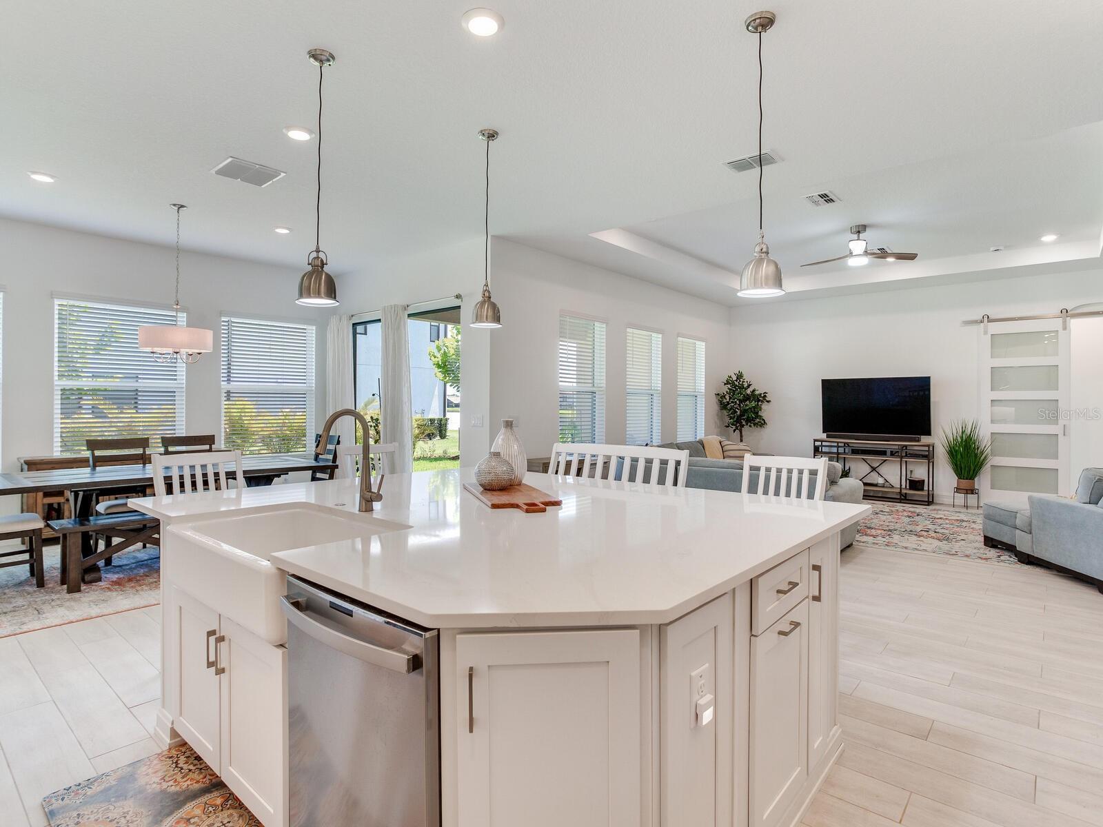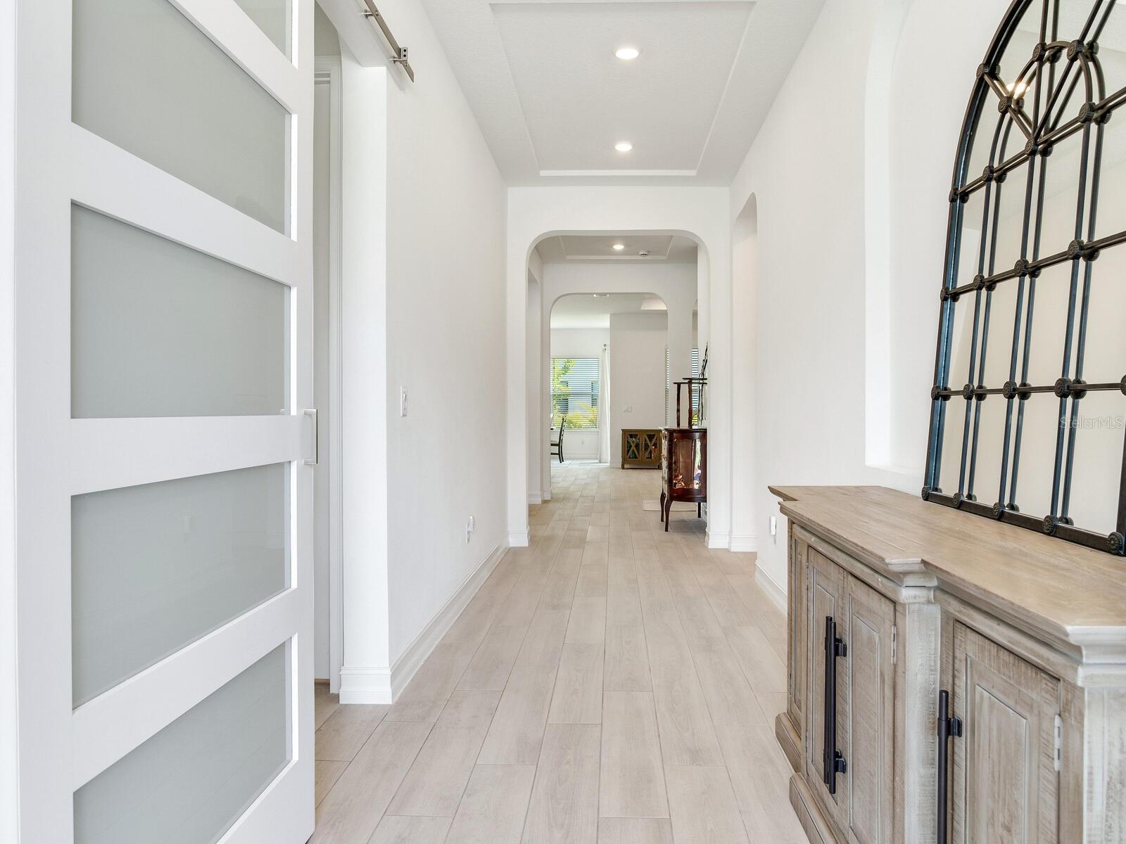 Welcome to refined Florida living at 6057 Marsh Trail Drive, located within the exclusive, gated community of Tarramor Estates in Odessa. Built in 2023, this beautifully upgraded modified Amberly floor plan offers 5 bedrooms, 4 baths, and 3,615 square feet of thoughtfully designed living space on a generous .28-acre lakefront lot—providing both privacy and room to dream. From the moment you arrive, the home makes a statement. Barrel tile roofing, full gutters, the California Color Package, coach lighting, and lush professional landscaping create striking curb appeal, while the full-lite obscure glass front door sets a warm, modern tone. Inside, 10-foot ceilings, wood-look tile flooring, and an open-concept layout deliver a light, airy feel perfect for everyday living and entertaining. The heart of the home is the designer kitchen, showcasing Level 4 Calcutta Gold Silestone countertops, GE stainless steel appliances, a 36” gas cooktop, built-in wall oven and microwave, 42” Alpine-painted cabinetry with crown molding, soft-close drawers, custom pull-outs, a farmhouse apron-front sink, and a full-height custom backsplash. An oversized island with abundant seating anchors the space, while the walk-in pantry with ventilated wood shelving is a chef’s dream. A formal dining room offers elegant entertaining, and expansive sliders from the main living area lead to a covered patio with serene water views. The side yard offers ample room for a future pool, outdoor kitchen, and play space, making it ideal for creating your own private outdoor oasis. Seller is offering a concession toward a side-yard fence, adding flexibility for pets, play, or additional privacy. The flexible floor plan includes a dedicated flex space—perfect for a home office, gym, or playroom—enhanced by frosted glass solid-core barn doors for style and privacy. The owner’s suite is a true retreat, featuring a tray ceiling, dual custom walk-in closets, and a spa-inspired bath with an oversized soaking tub, a semi-frameless glass shower with dual shower heads and rain feature, and dual vanities with Level 4 Silestone countertops. A split-bedroom design ensures comfort and privacy: two bedrooms share a Jack-and-Jill bath, another enjoys its own private bath, and upstairs you’ll find a versatile fifth bedroom with full bath and designer walk-in closet—ideal as a guest suite, media room, or second home office. Additional highlights include a 3-car garage with epoxy floors, laundry room with sink and cabinetry, whole-home LED recessed lighting, 15 SEER Carrier HVAC, tankless water heater, Low-E dual-pane windows, CAT 5 and USB outlets, Sensi programmable thermostats, Ring doorbell, MyQ smart garage technology, and washer and dryer included. Tarramor residents enjoy resort-style amenities, including a heated pool, state-of-the-art fitness center, and elegant clubhouse. Zoned for A-rated schools—Hammond Elementary, Martinez Middle, and Steinbrenner High—with convenient access to shopping, dining, golf, beaches, Tampa International Airport, and downtown Tampa. Located in Flood Zone X (no flood insurance required) with no CDD fees, this move-in-ready home delivers luxury, flexibility, and long-term value in one of Odessa’s premier gated communities.