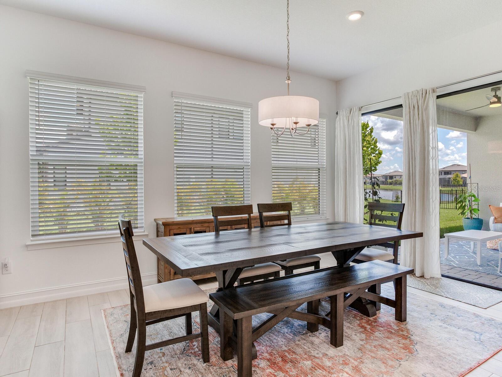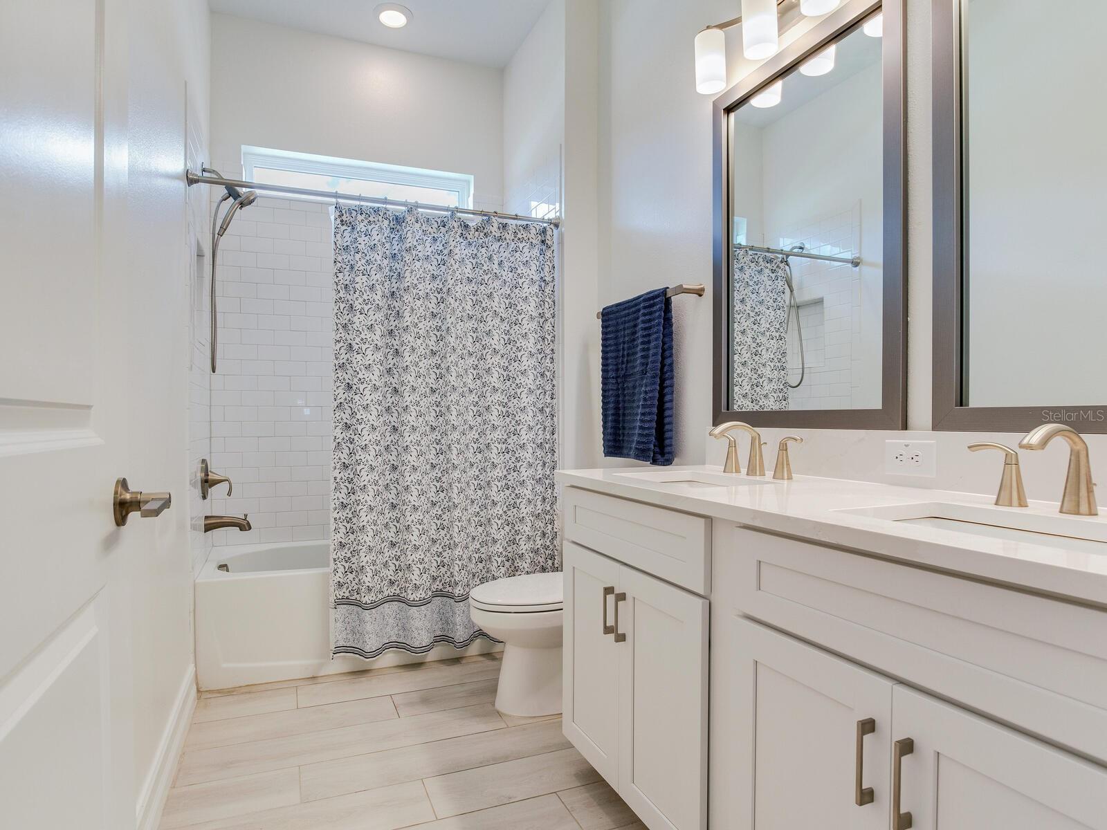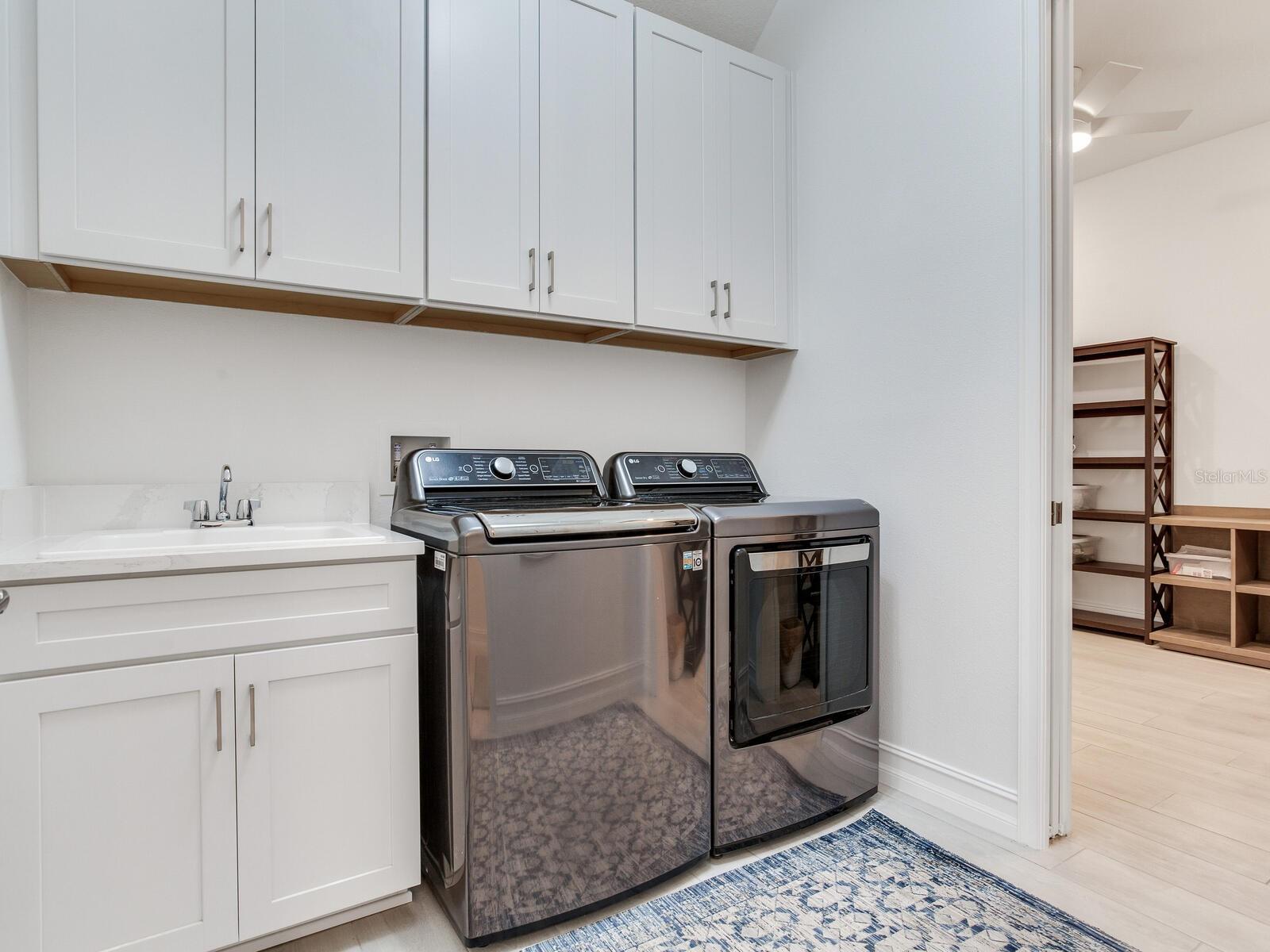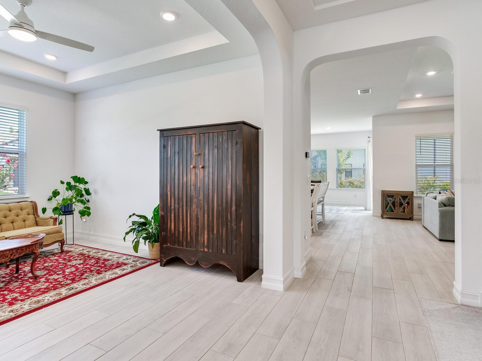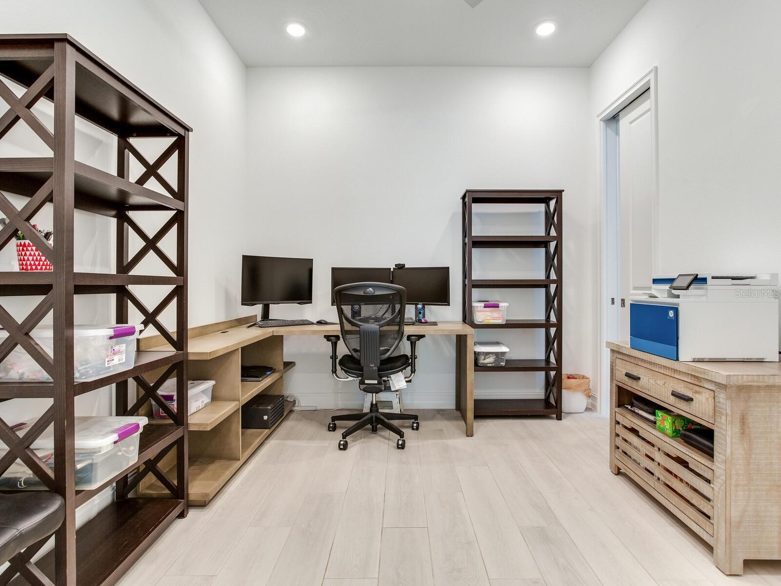 Welcome to refined Florida living at 6057 Marsh Trail Drive, located within the exclusive, gated community of Tarramor Estates in Odessa. Built in 2023, this beautifully upgraded modified Amberly floor plan offers 5 bedrooms, 4 baths, and 3,615 square feet of thoughtfully designed living space on a generous .28-acre lakefront lot—providing both privacy and room to dream. From the moment you arrive, the home makes a statement. Barrel tile roofing, full gutters, the California Color Package, coach lighting, and lush professional landscaping create striking curb appeal, while the full-lite obscure glass front door sets a warm, modern tone. Inside, 10-foot ceilings, wood-look tile flooring, and an open-concept layout deliver a light, airy feel perfect for everyday living and entertaining. The heart of the home is the designer kitchen, showcasing Level 4 Calcutta Gold Silestone countertops, GE stainless steel appliances, a 36” gas cooktop, built-in wall oven and microwave, 42” Alpine-painted cabinetry with crown molding, soft-close drawers, custom pull-outs, a farmhouse apron-front sink, and a full-height custom backsplash. An oversized island with abundant seating anchors the space, while the walk-in pantry with ventilated wood shelving is a chef’s dream. A formal dining room offers elegant entertaining, and expansive sliders from the main living area lead to a covered patio with serene water views. The side yard offers ample room for a future pool, outdoor kitchen, and play space, making it ideal for creating your own private outdoor oasis. Seller is offering a concession toward a side-yard fence, adding flexibility for pets, play, or additional privacy. The flexible floor plan includes a dedicated flex space—perfect for a home office, gym, or playroom—enhanced by frosted glass solid-core barn doors for style and privacy. The owner’s suite is a true retreat, featuring a tray ceiling, dual custom walk-in closets, and a spa-inspired bath with an oversized soaking tub, a semi-frameless glass shower with dual shower heads and rain feature, and dual vanities with Level 4 Silestone countertops. A split-bedroom design ensures comfort and privacy: two bedrooms share a Jack-and-Jill bath, another enjoys its own private bath, and upstairs you’ll find a versatile fifth bedroom with full bath and designer walk-in closet—ideal as a guest suite, media room, or second home office. Additional highlights include a 3-car garage with epoxy floors, laundry room with sink and cabinetry, whole-home LED recessed lighting, 15 SEER Carrier HVAC, tankless water heater, Low-E dual-pane windows, CAT 5 and USB outlets, Sensi programmable thermostats, Ring doorbell, MyQ smart garage technology, and washer and dryer included. Tarramor residents enjoy resort-style amenities, including a heated pool, state-of-the-art fitness center, and elegant clubhouse. Zoned for A-rated schools—Hammond Elementary, Martinez Middle, and Steinbrenner High—with convenient access to shopping, dining, golf, beaches, Tampa International Airport, and downtown Tampa. Located in Flood Zone X (no flood insurance required) with no CDD fees, this move-in-ready home delivers luxury, flexibility, and long-term value in one of Odessa’s premier gated communities.