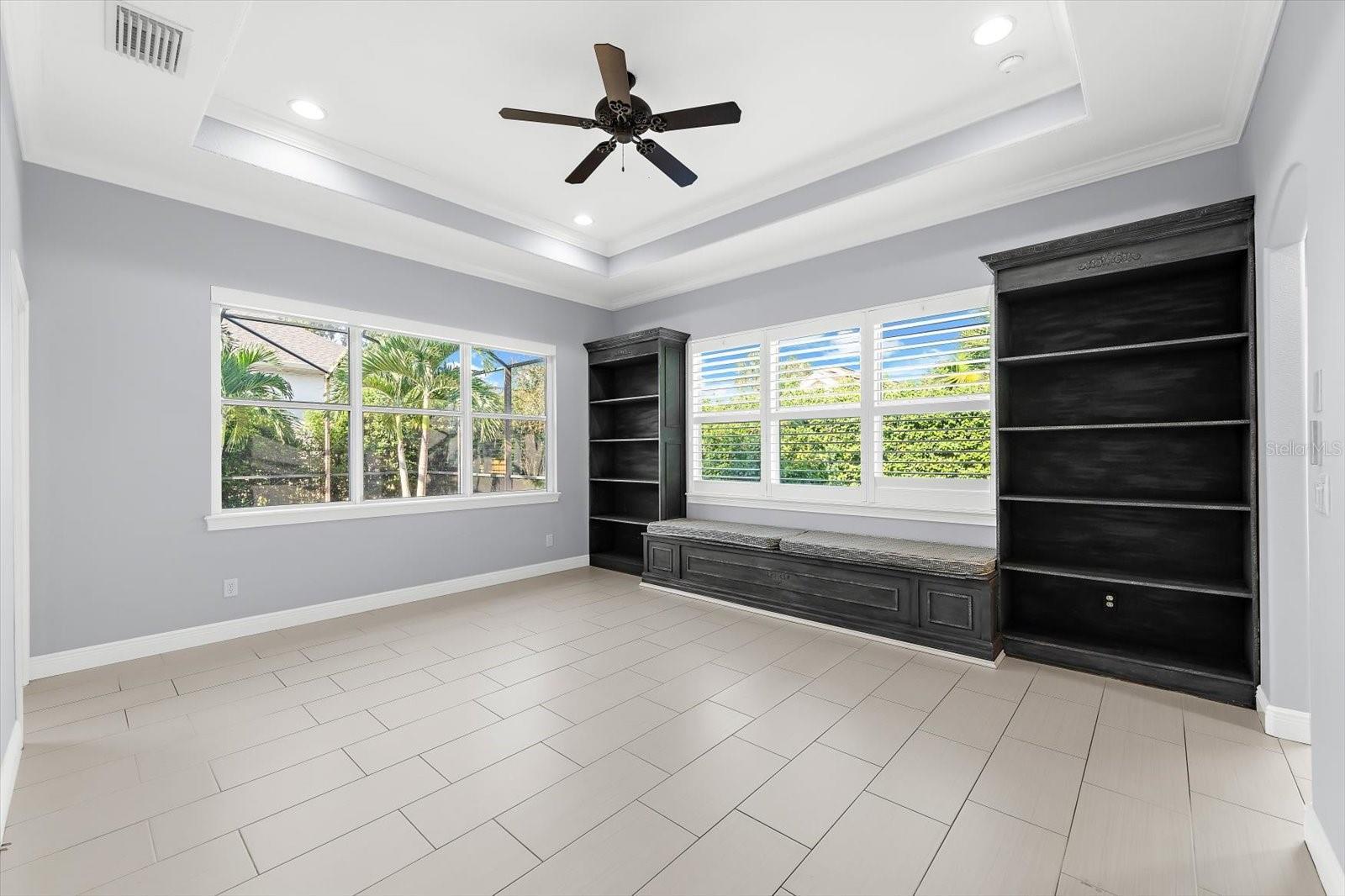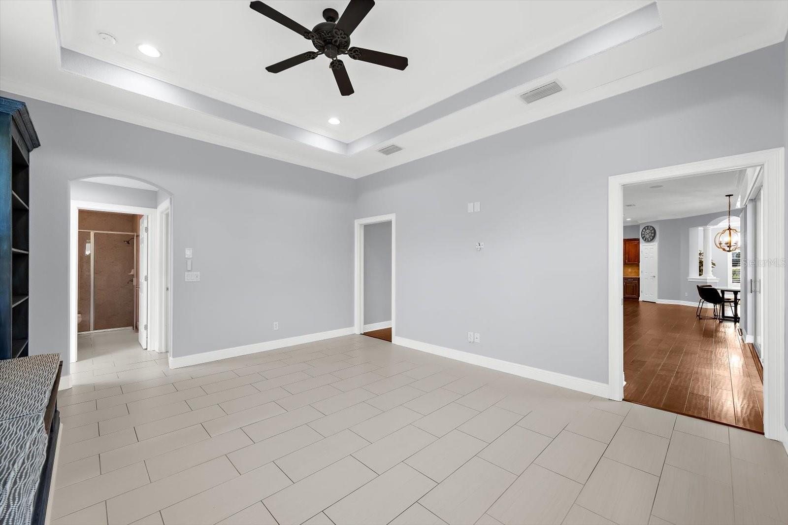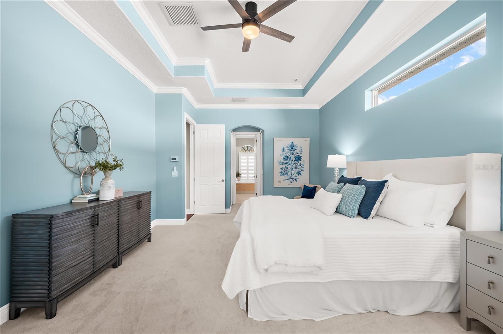 - Built-in Features, Ceiling Fans(s), Crown Molding, Eat-in Kitchen, Kitchen/Family Room Combo, Open Floorplan, Primary Bedroom Main Floor, Solid Wood Cabinets, Thermostat, Walk-In Closet(s), Window Treatments