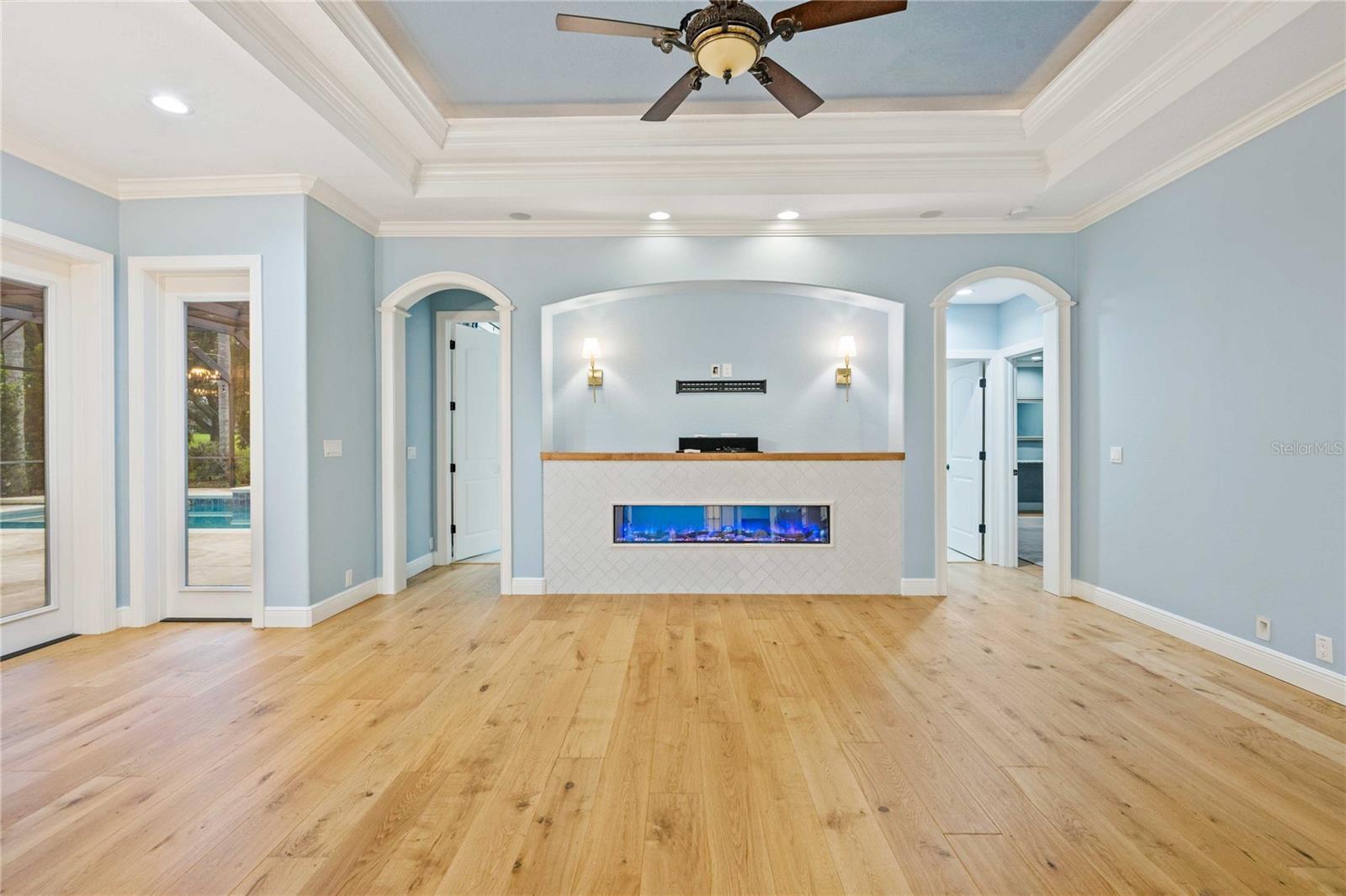 - Ceiling Fans(s), Crown Molding, Eat-in Kitchen, L Dining, Open Floorplan, Primary Bedroom Main Floor, Solid Surface Counters, Tray Ceiling(s), Wet Bar