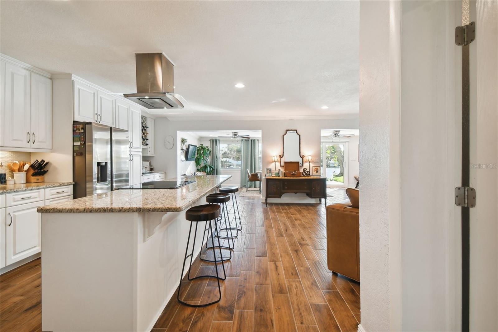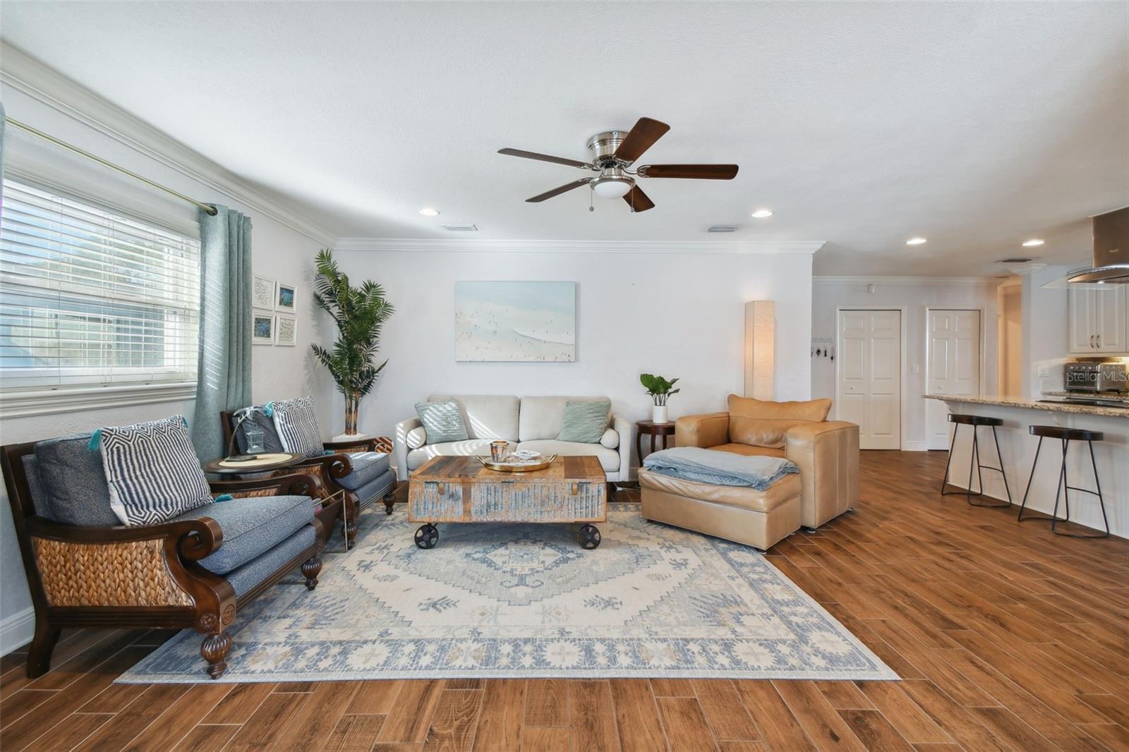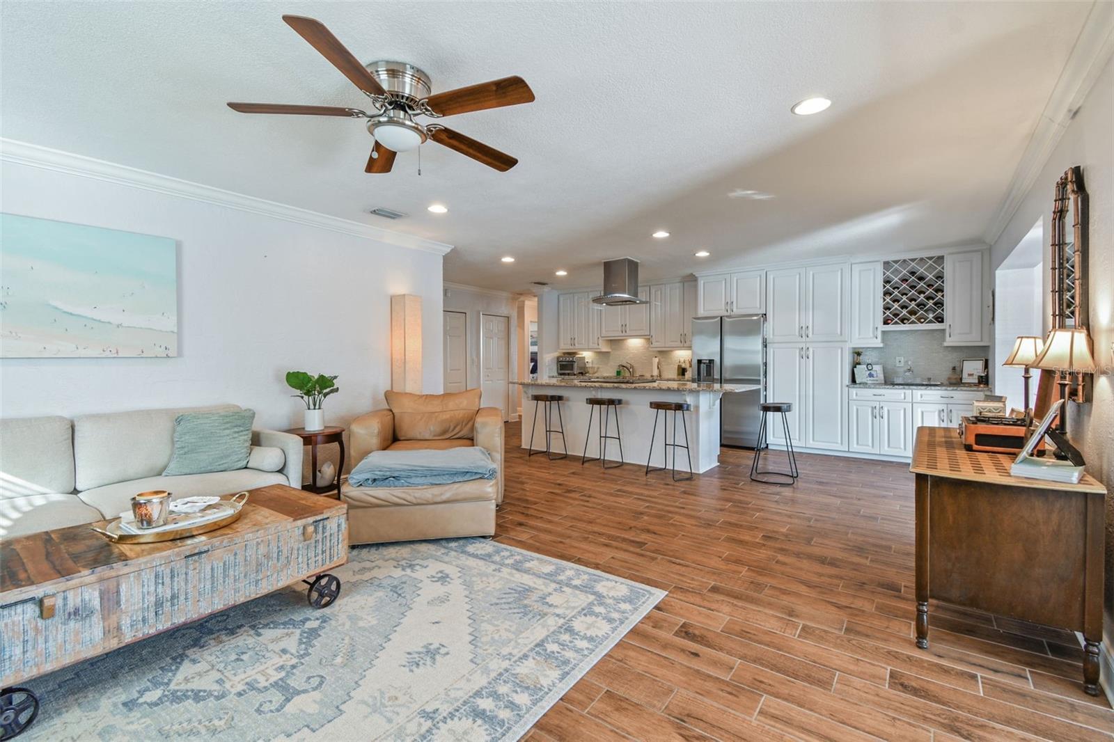 Enjoy modernized waterfront living just minutes from downtown St. Petersburg in this three-bedroom, two-bath home with nearly 2,000 square feet of thoughtfully designed space. A bonus room and one-car garage add flexibility, while the open layout includes wood-look tile flooring, recessed lighting and a chef’s kitchen with white cabinetry, stainless steel appliances, granite countertops and an oversized island with extended prep space. The backyard features a private pool, dock with new concrete wraps and a mature Royal Poinciana tree that blooms each summer. Recent upgrades include a new roof, elevated HVAC system and a Dam It Defense Flood Prevention System — a reinforced aluminum barrier system engineered for added protection during extreme weather events, transferrable to the new owner. The bonus room offers washer and dryer hookups and flexible use. A detached shed, one-car garage and long driveway add storage and parking. This turnkey home blends indoor-outdoor living with sought-after coastal access.