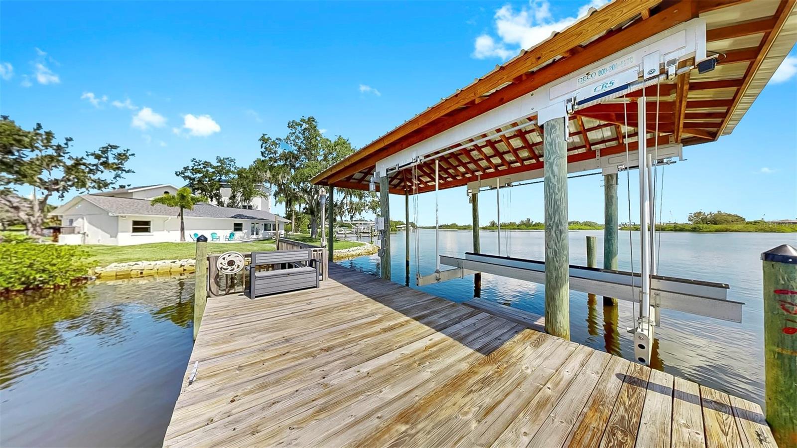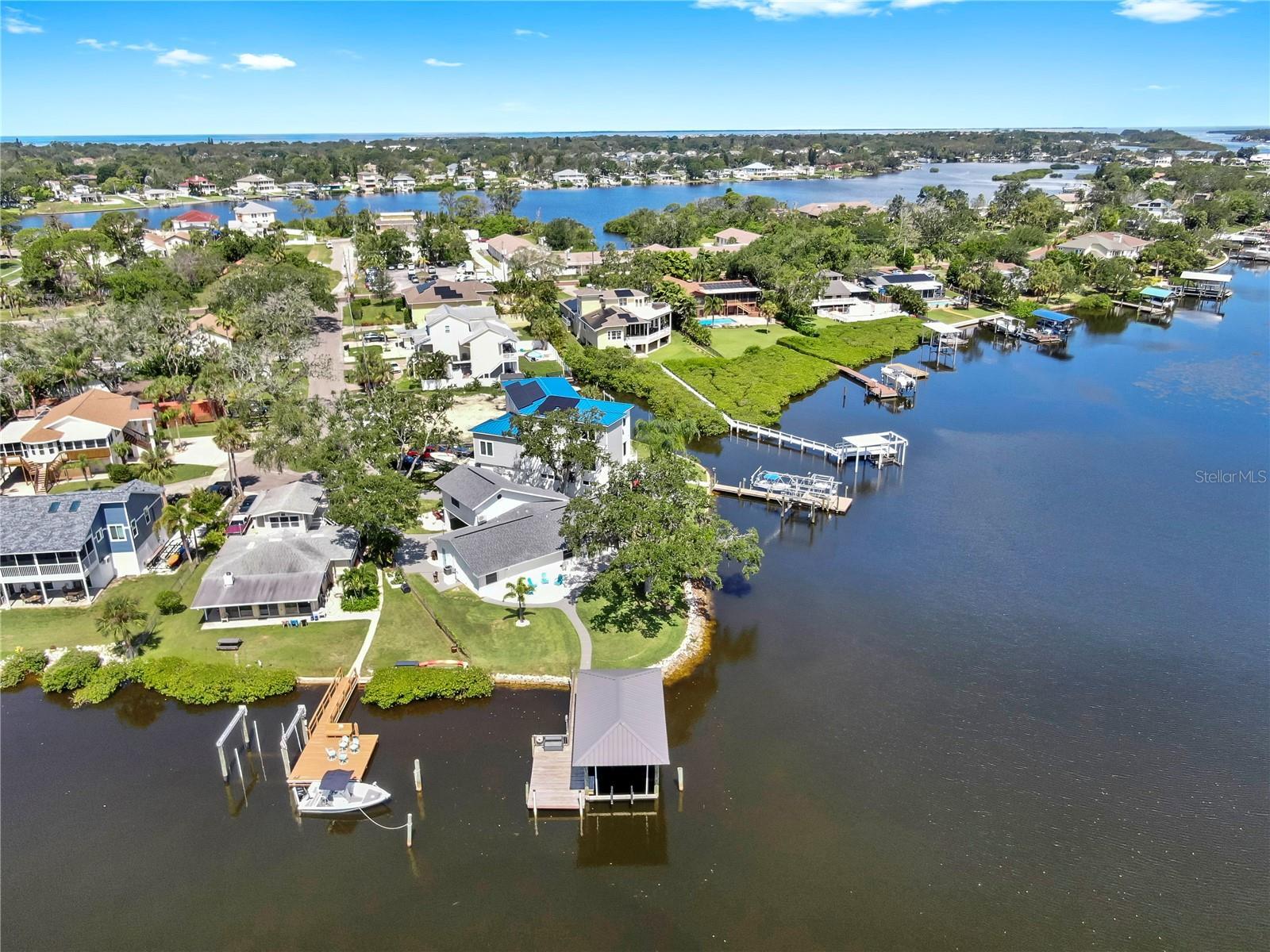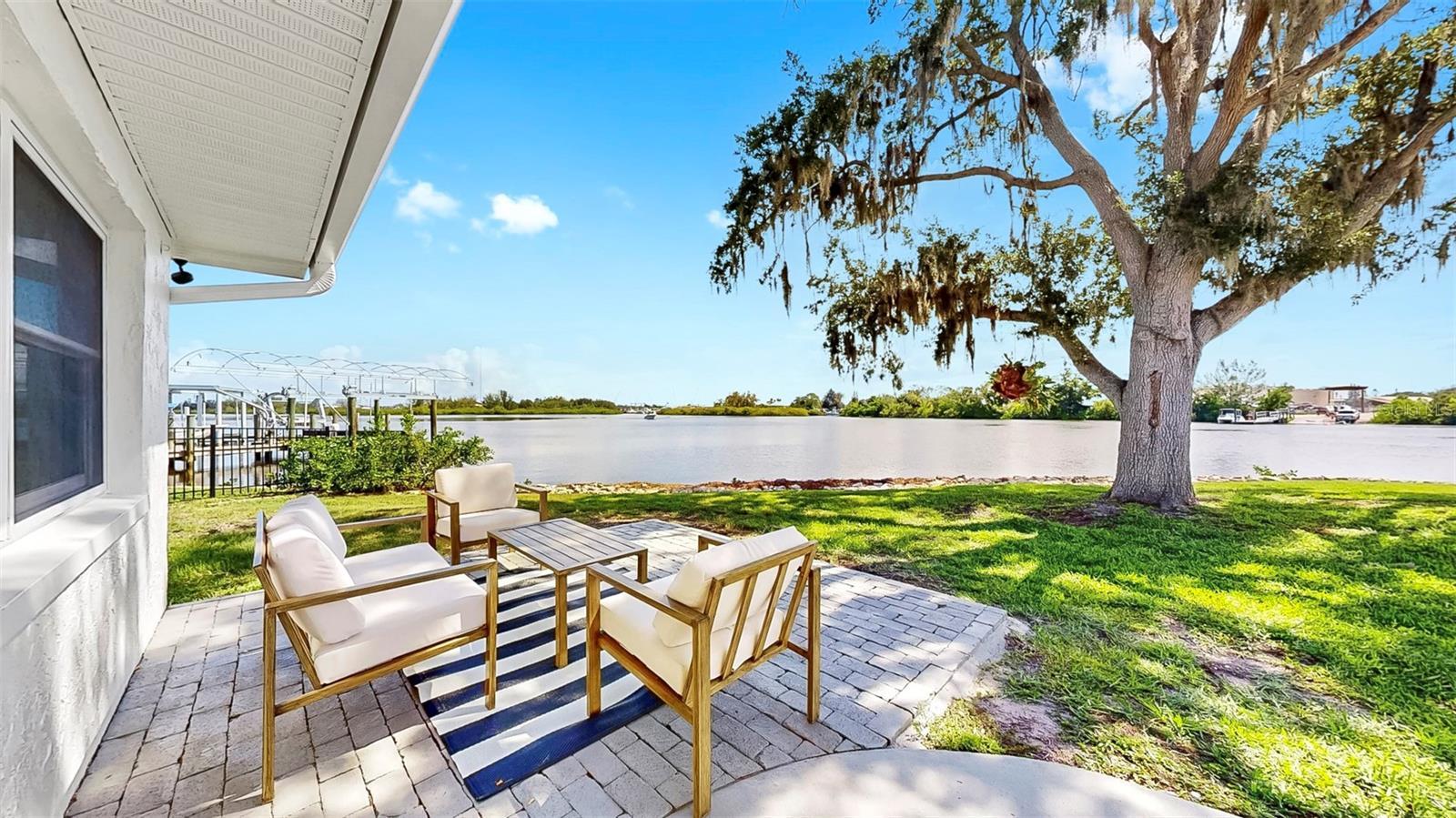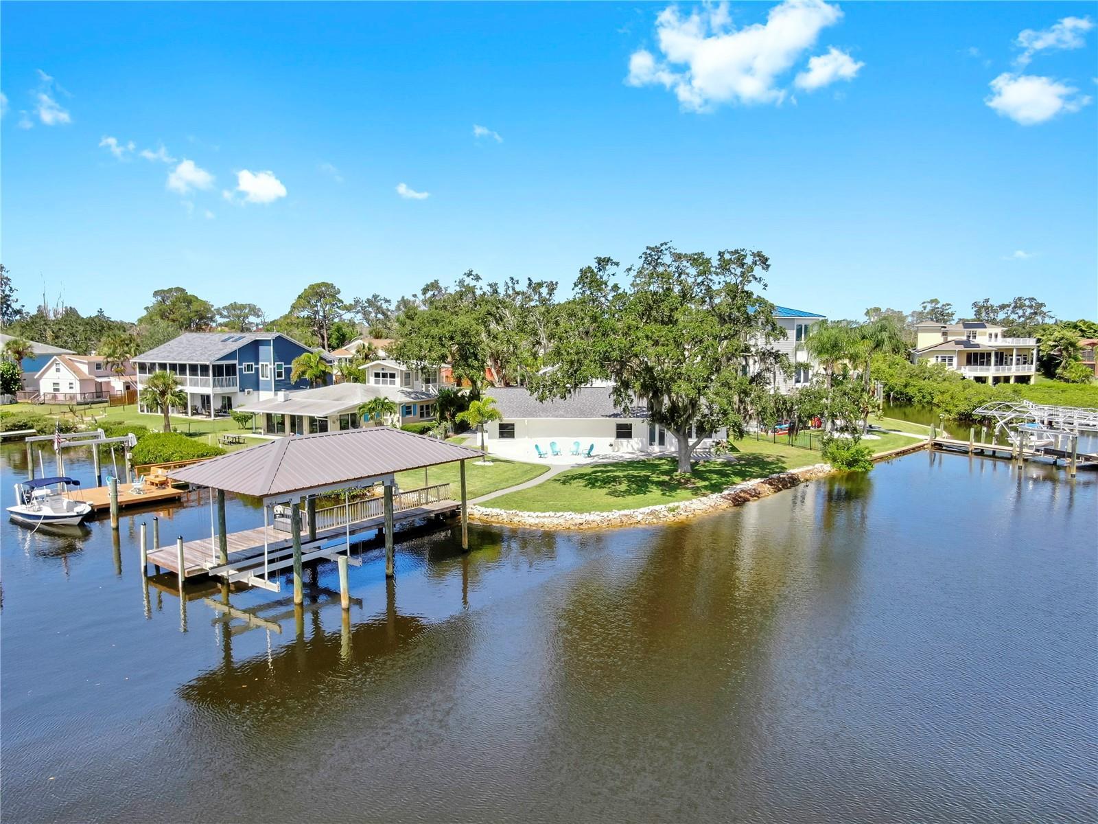 Welcome to coastal living at its finest! Located on a quiet cul-de-sac across from the Tarpon Yacht Club, this fully renovated 3-bedroom, 3-bath waterfront home offers 130 feet of deep water frontage with no tide restrictions on Tarpon Bayou with direct access to the Anclote River and Gulf, perfect for boating enthusiasts. The deep water canal stays navigable, even at low tide, a rare find! The covered dock with electric, 20,000 lb boat lift, and seawall with riprap make this a true boater’s paradise. Step inside to discover modern elegance and thoughtful upgrades throughout. Enjoy new wood and tile flooring, recessed lighting, impact windows, and custom storage solutions including a built-in wine rack, dining room cabinetry and custom closet organizers. The kitchen shines with new LG appliances, washer/dryer, new cabinetry, high-end fixtures, and a craft refrigerator with craft ice. The spacious primary suite features his and her walk-in closets, a dual vanity bath, and luxe Delta fixtures. All three bathrooms have been renovated to include timeless, modern finishes. Upstairs, separate mini-split A/C systems provide personalized comfort. Recent updates include a new roof, HVAC and ductwork, tankless water heater, and upgraded electrical (all 2025). Enjoy a spacious interior utility room with a stainless steel sink, ideal for prepping boating or fishing gear, plus an exterior storage room for rods, tackle, and tools. Outside, unwind on the paver patio overlooking the water, surrounded by lush, freshly landscaped grounds and a gated circular driveway for added privacy. Located minutes from charming downtown Tarpon Springs, the historic Sponge Docks, Spring Bayou, Craig Park and Fred Howard Park, this home offers both privacy and proximity to shopping, dining, and the Gulf. Schedule your showing today!