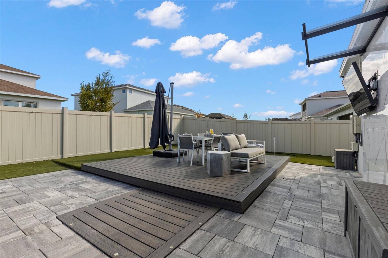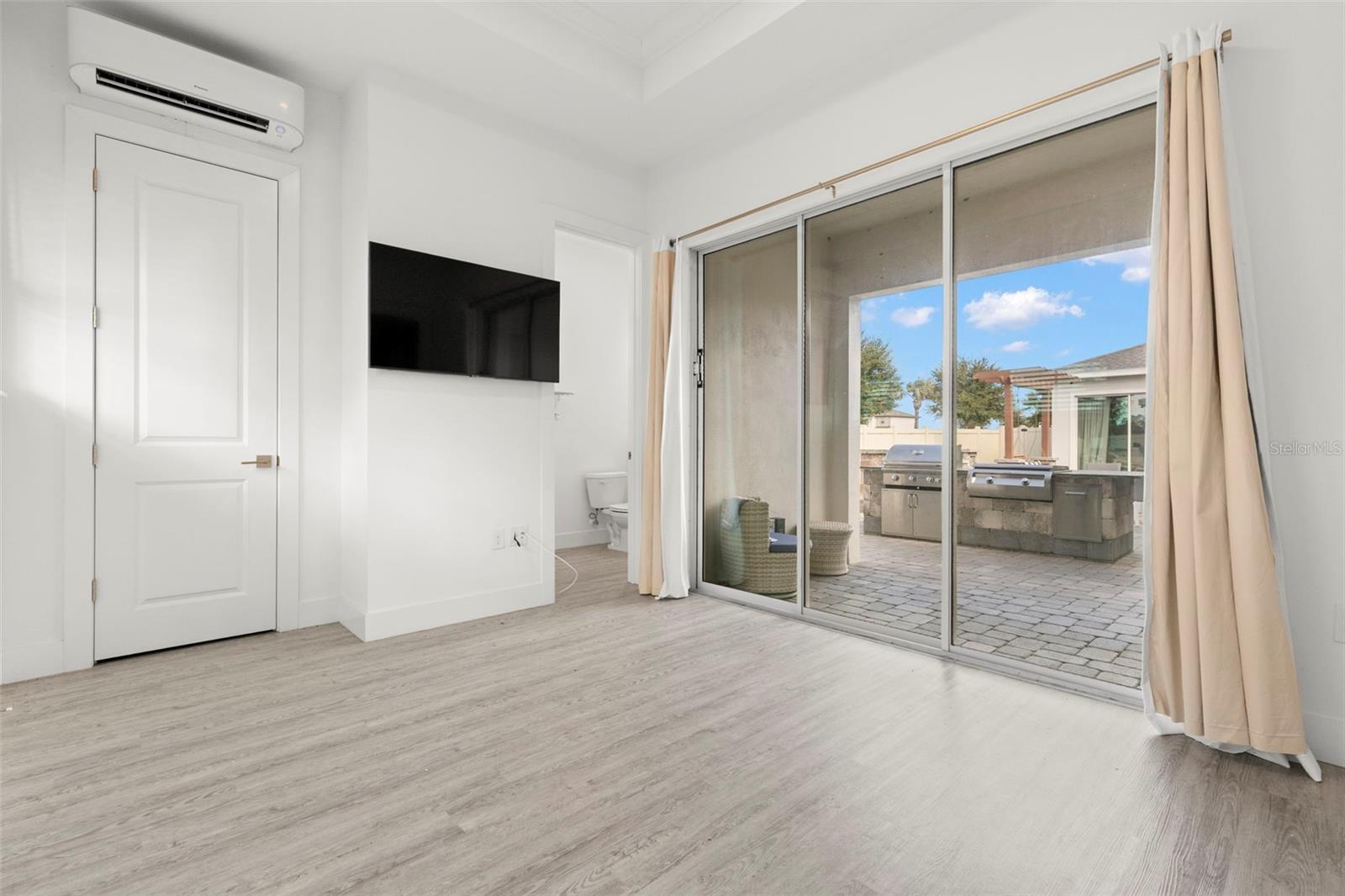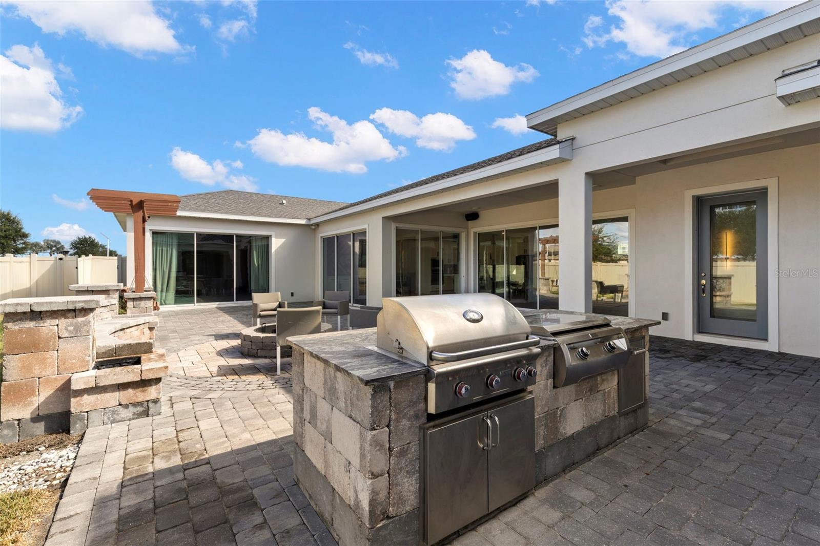 - Courtyard, Lighting, Outdoor Grill, Outdoor Kitchen, Sidewalk, Sliding Doors, Storage