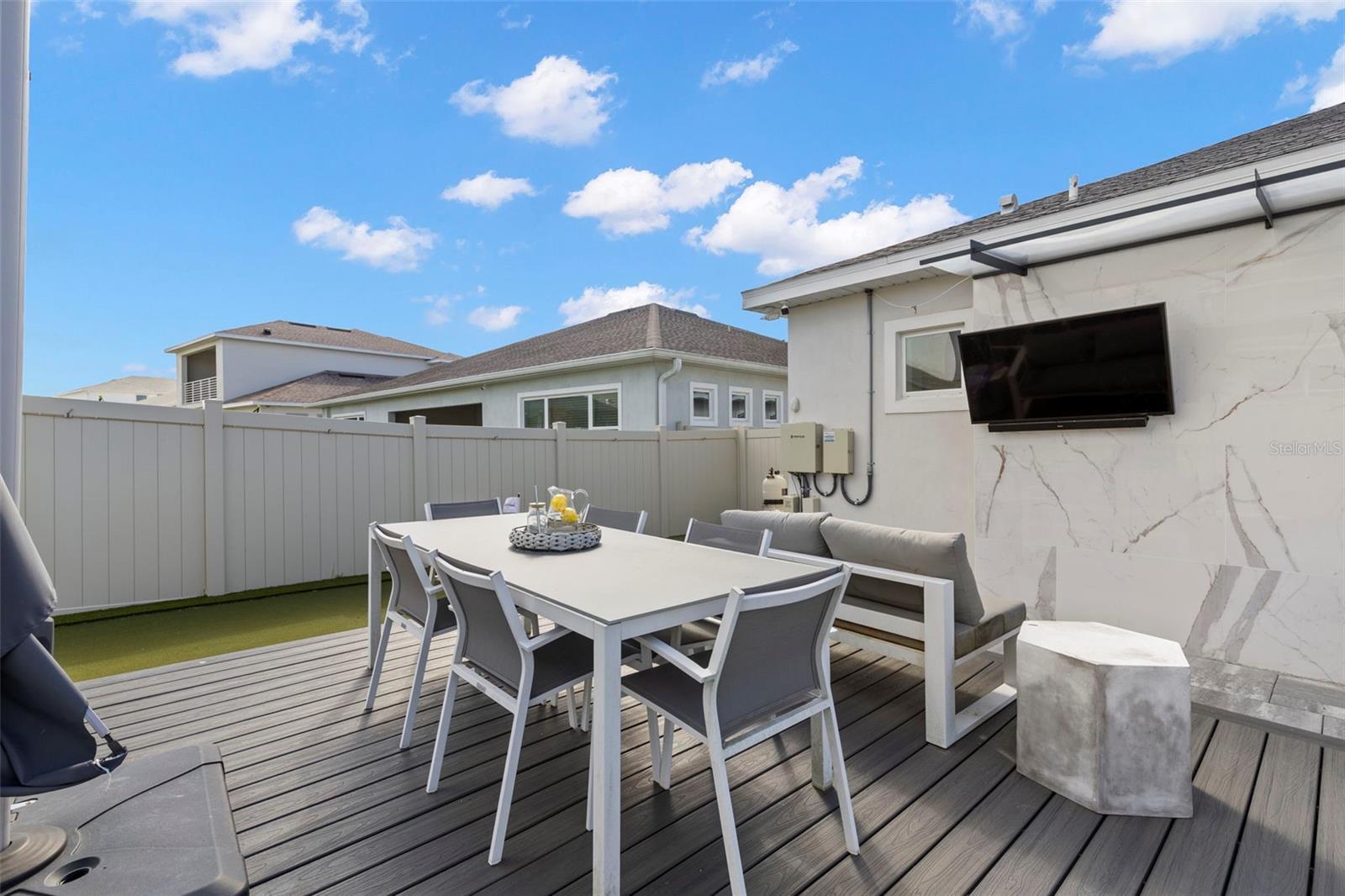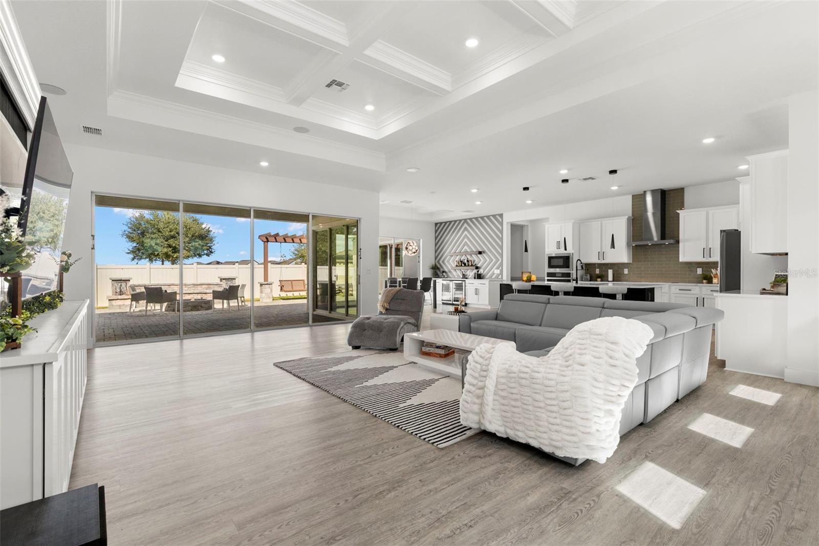 Stunning Modern Key West Courtyard Home in Epperson Lagoon Community Welcome to this exceptional 2021-built modern courtyard home in the highly desirable Epperson Lagoon Community, where resort-style living meets contemporary elegance. Situated on a spacious corner lot with no front and only one side neighbor, this home offers 4 bedrooms, 3.5 bathrooms, and a 3-car garage with over 3,000 sqft of beautifully designed living space. Every detail has been thoughtfully crafted for comfort, style, and effortless entertaining. At the heart of the home is an oversized private courtyard and a private backyard—a true outdoor sanctuary. Enjoy a saltwater pool, spa, putting green, and entertainment deck, all surrounded by artisan stone finishes, a built-in summer kitchen with AOG grill and Fire Magic griddle, a cozy fire pit, dual waterfalls, a pergola swing, and a natural mosquito repellent system. Whether relaxing with morning coffee or hosting guests under the stars, this outdoor space delivers the ultimate Florida lifestyle. Inside, the open great room concept blends style and functionality, featuring custom coffered ceilings, LED accent lighting, a gourmet kitchen with quartz countertops, stainless steel LG appliances, a large walk-in pantry, a dry bar, and added cabinetry. The master suite is a peaceful retreat with tray ceilings, porcelain accent walls, dual closets, and a spa-inspired bathroom with LED rain shower, LED mirrors and double-sink vanity. A private guest suite offers its own bath and lanai—ideal for multigenerational living or overnight visitors. Additional upgrades include a Culligan water softener + reverse osmosis system, security cameras, outdoor Klipsch speakers, and low HOA fees (including cable & internet). Located across from the Lake House on King Lake and just minutes to I-75, Publix, Starbucks, top-rated schools, and shopping, this home sits within one of Wesley Chapel’s most sought-after communities. The Epperson Lagoon—the first Crystal Lagoon® in the U.S.—features 7 acres of crystal-clear water with sandy beaches, cabanas, water slides, swim-up bars, paddleboarding, live music, and community events year-round. Enjoy additional amenities like playgrounds, trails, dog parks, an outdoor gym, and golf cart-friendly streets. Experience the perfect balance of luxury, leisure, and lifestyle at Epperson—where every day feels like a vacation.