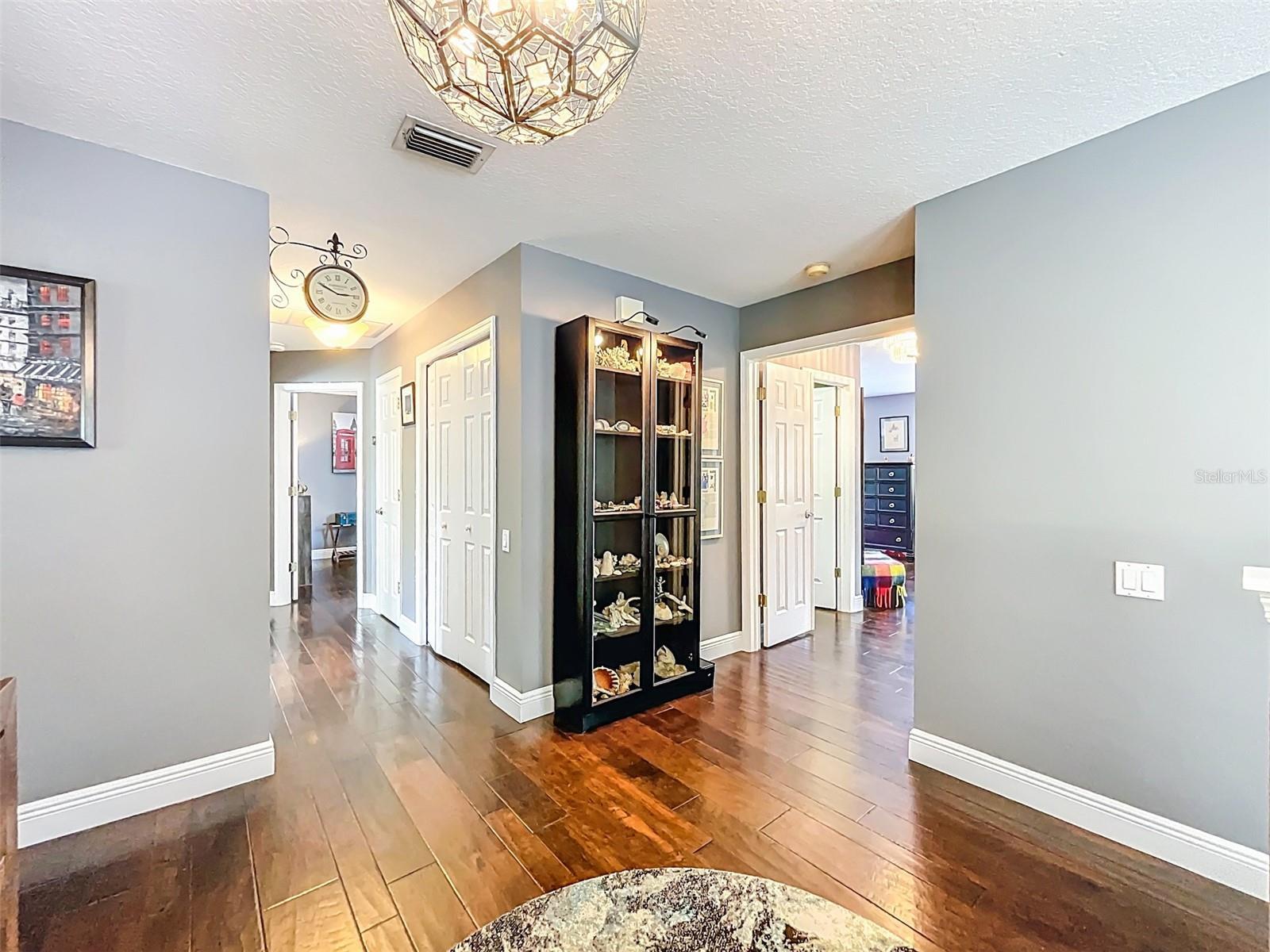 Welcome to 18142 Regents Square Drive a rare opportunity to own one of Brookfields most thoughtfully designed and richly upgraded homes, nestled within the prestigious guard-gated golf community of Hunters Green in New Tampa. This 4-bedroom, 2.5-bath, 3,210 sq ft two-story residence blends timeless craftsmanship with modern luxury, making it a true standout in the Tampa market. Step inside to soaring 20-foot ceilings and walls of natural light, enhanced by thermal-tinted windows and custom motorized solar shades. The formal living and dining areas are elegantly finished with crown molding, walnut-engineered hardwood flooring, and plantation shutters throughout. A custom cherry wood dry bar with wine fridge adds sophistication to your entertaining space. The fully renovated chefs kitchen (2018) is a true showpiece, featuring espresso-stained, soft-close cabinetry, granite countertops, a 6-foot center island with storage and beverage fridge, Samsung dark stainless appliances including a Family Hub refrigerator, gas cooktop, and custom subway tile backsplash. The adjacent family room offers a cozy custom library built-in, gas fireplace, and serene views of your resort-style backyard. Upstairs, the expansive primary suite spans the full length of the home, complete with tray ceilings, dual walk-in closets, and a spa-like bath with garden tub, walk-in shower, and an abundance of natural light. Step outside to a private outdoor oasis featuring a remodeled PebbleTec saltwater pool, new lighting, separate spa with massage bed, and a fully equipped outdoor kitchen (grill, cooktop, dual fridges, sink, and solar shades). As a unique bonus, this is the only home in Hunters Green with a grandfathered-in half basketball court ideal for recreation and entertaining. Additional highlights include two brand-new 16 SEER HVAC systems (2024) with blue light purification, a recent roof inspection with wind mitigation approval, and mature landscaping throughout the lot. All of this is set within Hunters Green, one of Tampa's most established lifestyle communities featuring a private Tom Fazio-designed golf course, Hunters Green Country Club, tennis courts, Olympic-size pool, fitness center, a 15-acre community park, playgrounds, basketball and soccer fields, miles of paved trails, and proximity to Flatwoods Wilderness Park. With top-rated schools and easy access to I-75, Wiregrass Mall, USF, and Moffitt, this is resort-style living with a true sense of community.