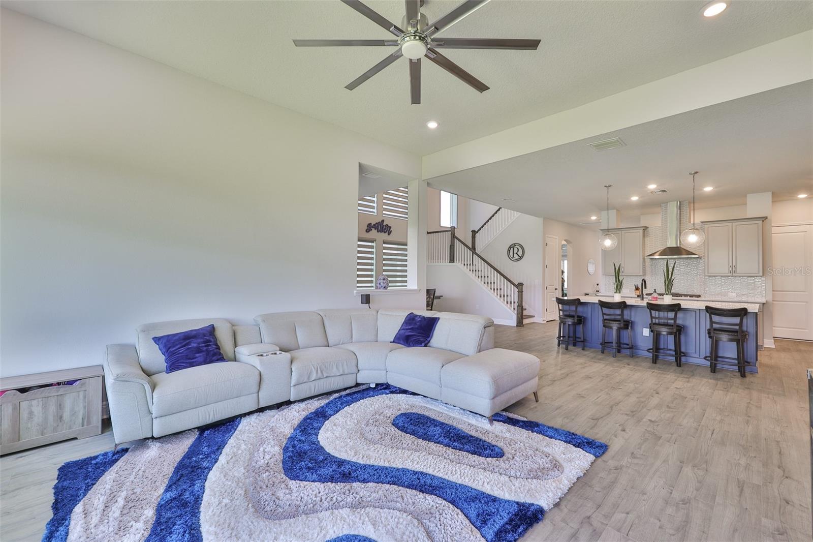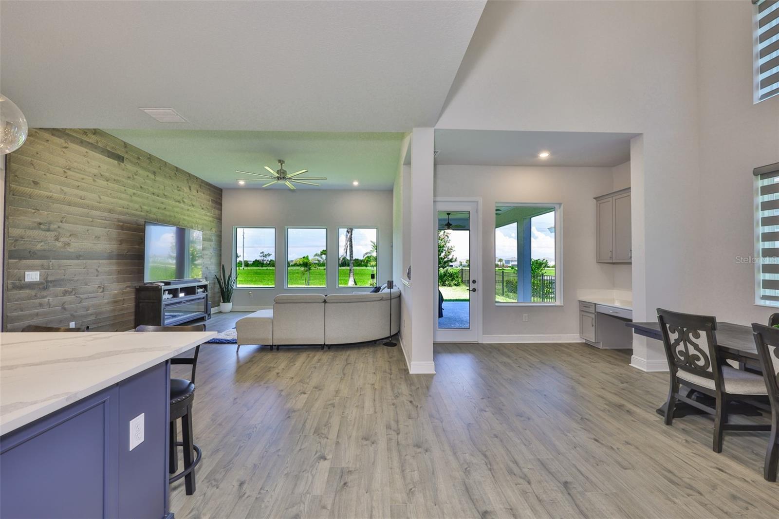 - Ceiling Fans(s), Eat-in Kitchen, High Ceilings, Kitchen/Family Room Combo, Open Floorplan, Solid Wood Cabinets, Stone Counters, Thermostat, Walk-In Closet(s), Window Treatments