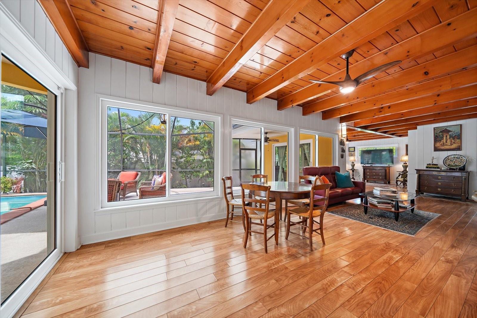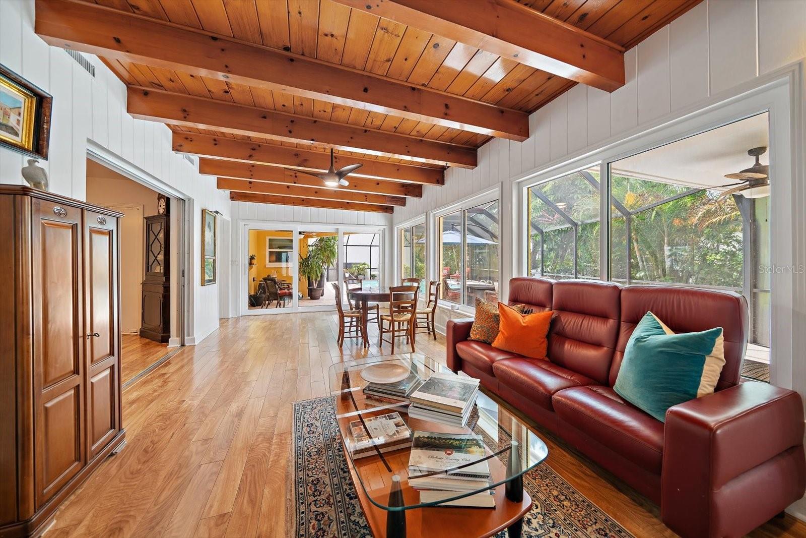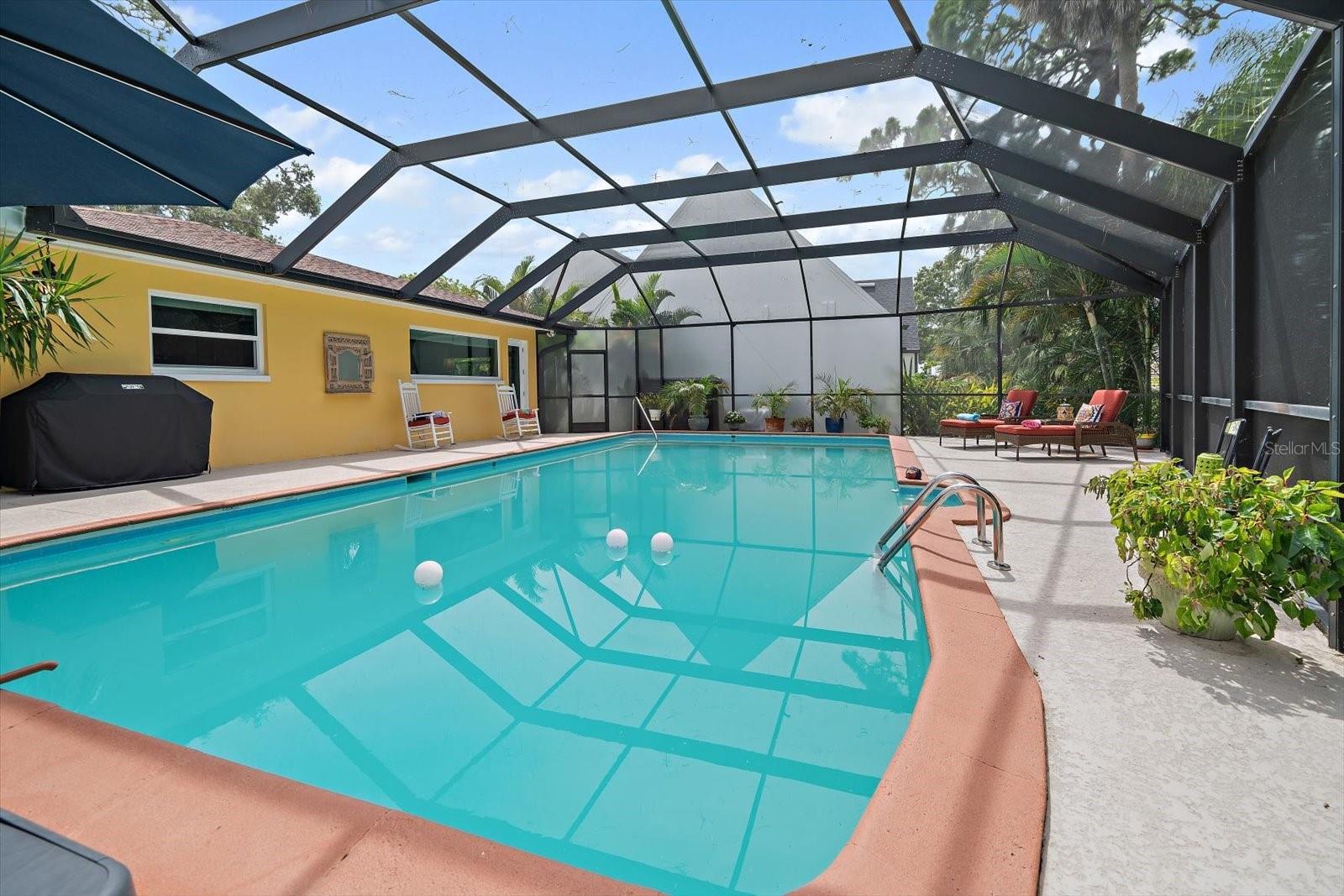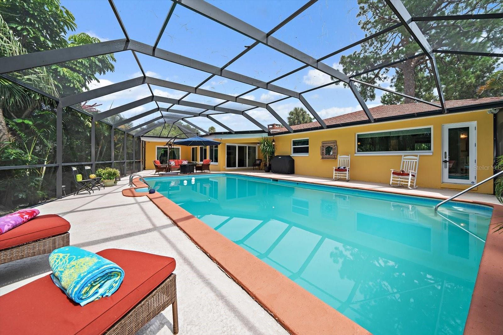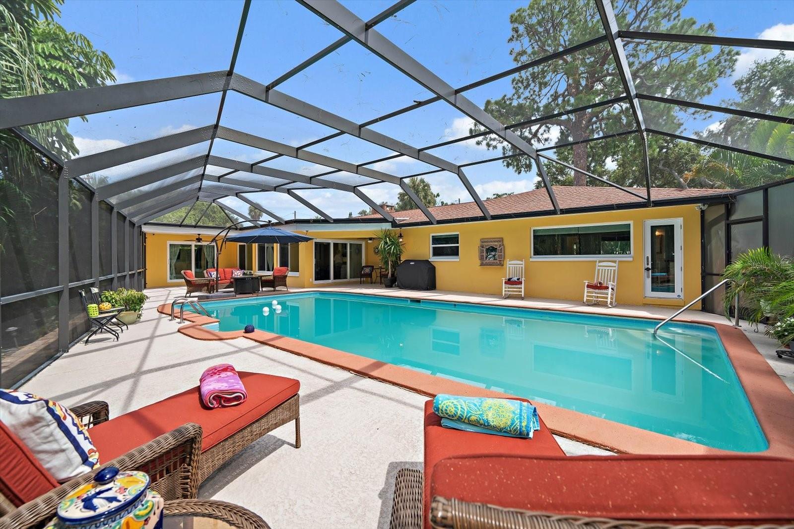 Move-in ready and perfectly positioned in the heart of beautiful Belleair, this stunning home offers refined Florida living just one block from the water and beautiful Winston Park, yet sits high and dry in a non-flood zone. Bursting with curb appeal, this meticulously maintained home features tropical native landscaping, a newly pavered front walkway and patio, and a welcoming entryway. Inside, a bright and open floor plan is enhanced by designer finishes, neutral luxury vinyl flooring, and a seamless flow between spacious living areas. The living room is filled with natural light, boasts electric blinds, and is anchored by a striking wood-burning fireplace, while the adjacent dining room connects effortlessly to the gorgeous white kitchen with stainless steel appliances, granite countertops, custom tile backsplash, wine fridge, and pass-through to the pool. The family room stuns with white paneled walls and soaring pine ceilings with exposed beams, creating an unforgettable atmosphere. Sliders open to a private, lush backyard oasis, where you will find expansive outdoor living that is a perfect blend of luxury and functionality, including 2 distinct covered areas, each offering a unique retreat, and a large shimmering pool with a 10 foot deep-end. Encasing the pool is a soaring screen enclosure providing protection from leaves and insects while maintaining an open, breezy atmosphere. The primary suite is a peaceful retreat with a walk-in custom closet, natural light, private glass door to the pool, and an ensuite featuring a furniture-inspired vanity and walk-in shower. Additional bedrooms are equally well appointed with custom closets, and built-ins. Extras include a 3-car garage with new custom flooring, impact windows and sliders, whole house generator, and electric blinds, Situated in one of Pinellas County’s most desirable neighborhoods, you're just minutes from two private golf clubs, boutique shopping, local dining, and the area's most beautiful beaches. Don’t wait—this Belleair beauty won’t last long!