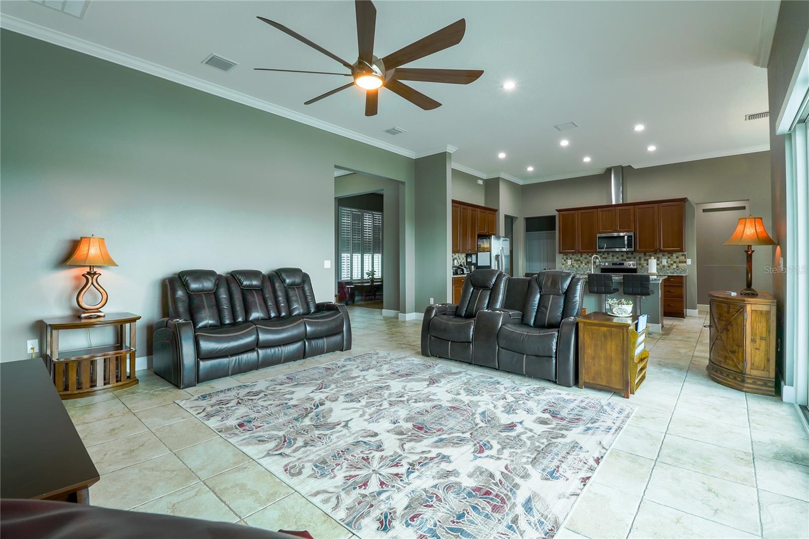 - Ceiling Fans(s), Crown Molding, Eat-in Kitchen, Kitchen/Family Room Combo, Open Floorplan, Primary Bedroom Main Floor, Solid Surface Counters, Solid Wood Cabinets, Split Bedroom, Thermostat, Walk-In Closet(s)