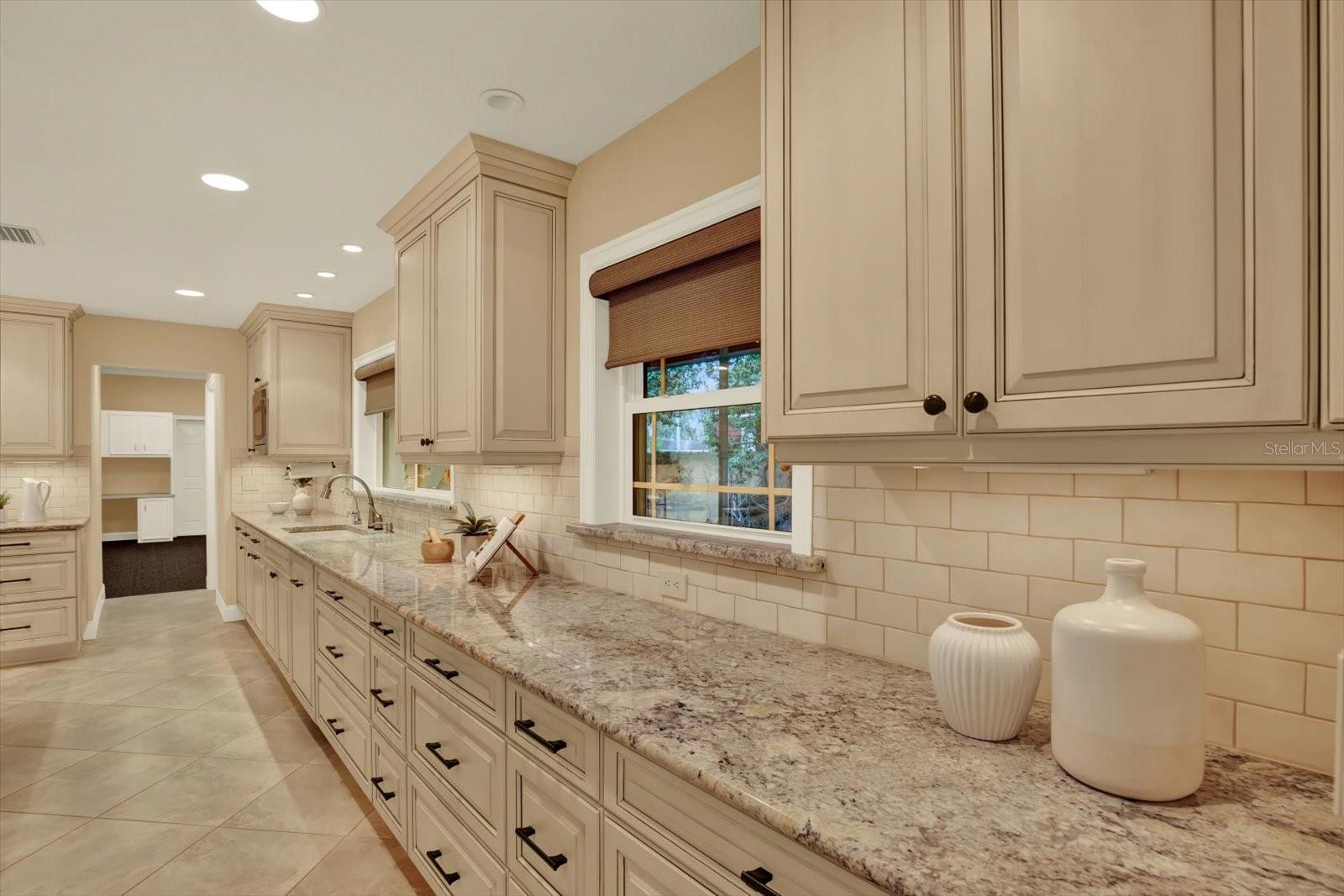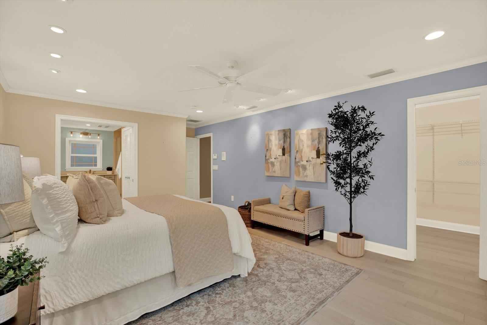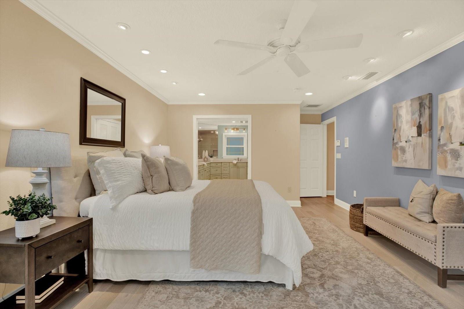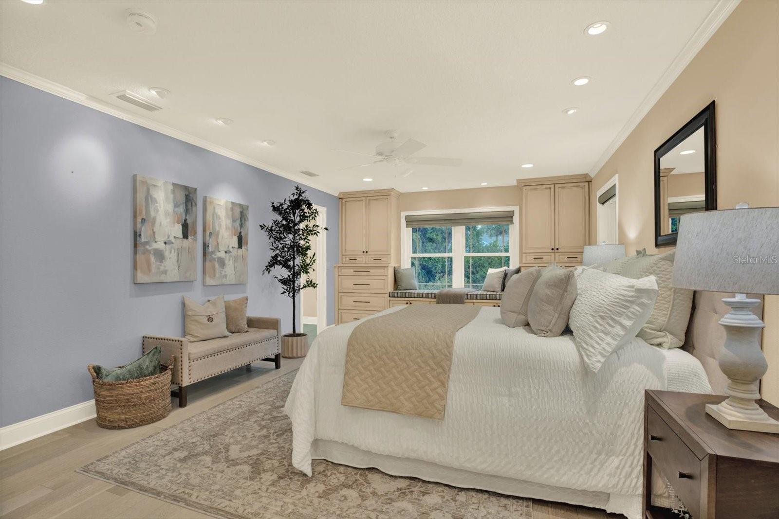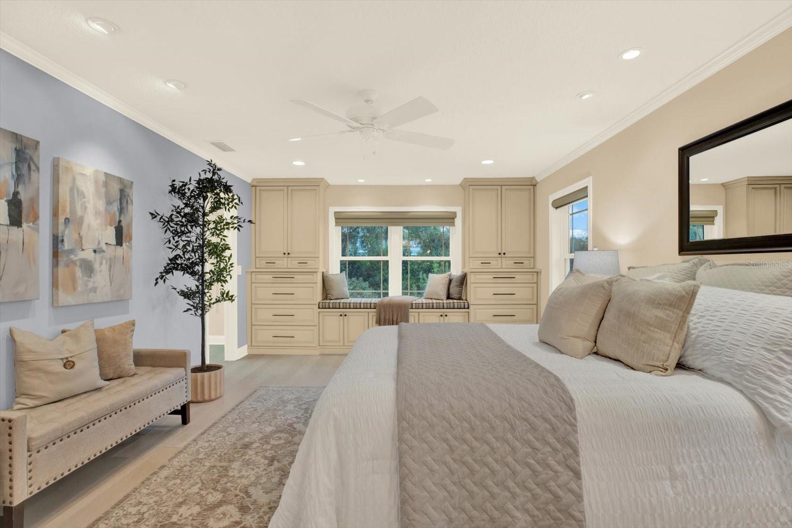 - Built-in Features, Ceiling Fans(s), Central Vaccum, Crown Molding, Eat-in Kitchen, PrimaryBedroom Upstairs, Solid Wood Cabinets, Stone Counters, Thermostat, Walk-In Closet(s), Wet Bar