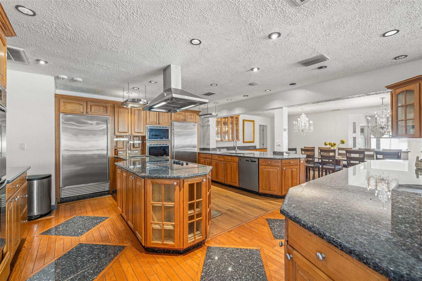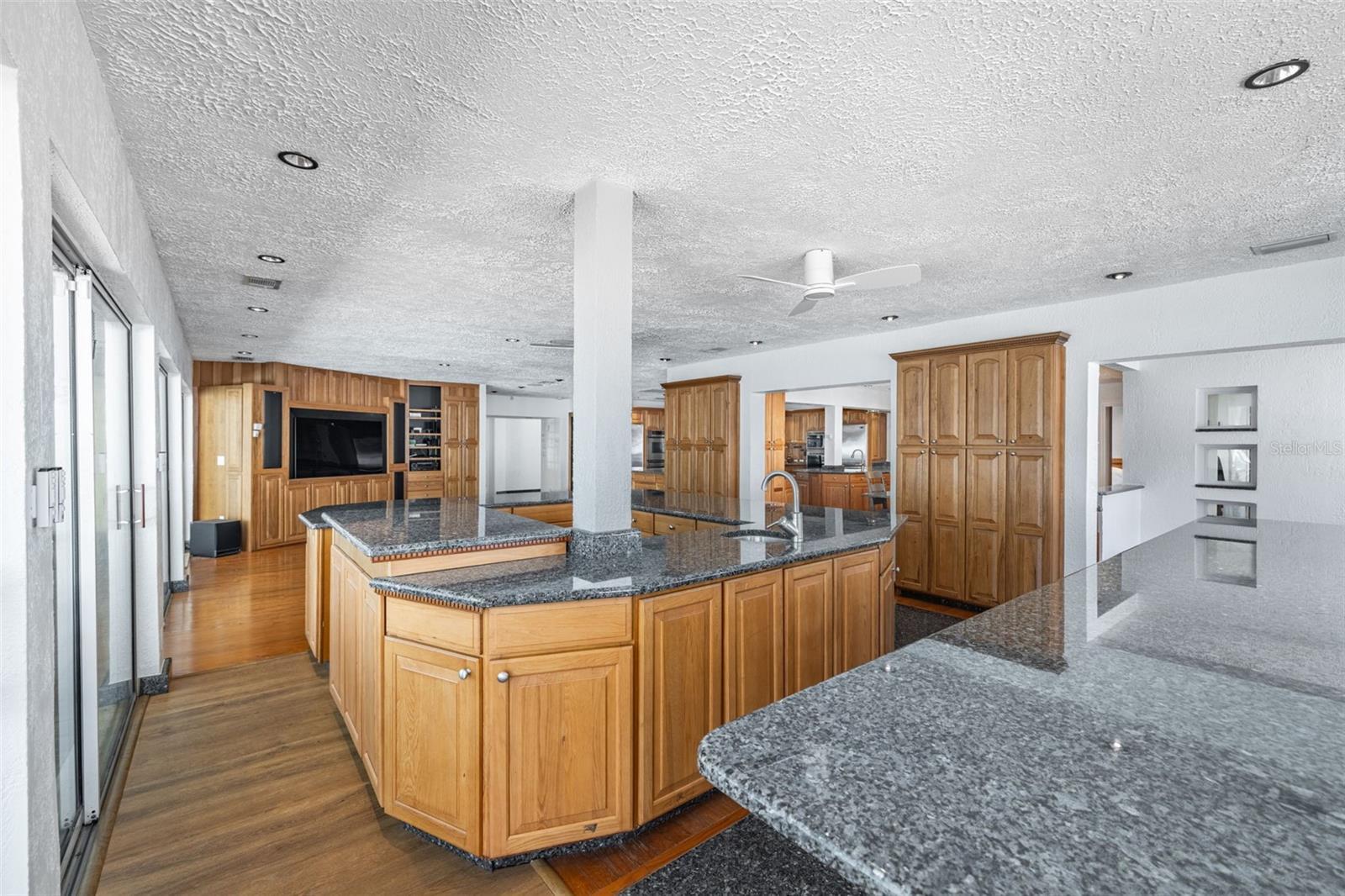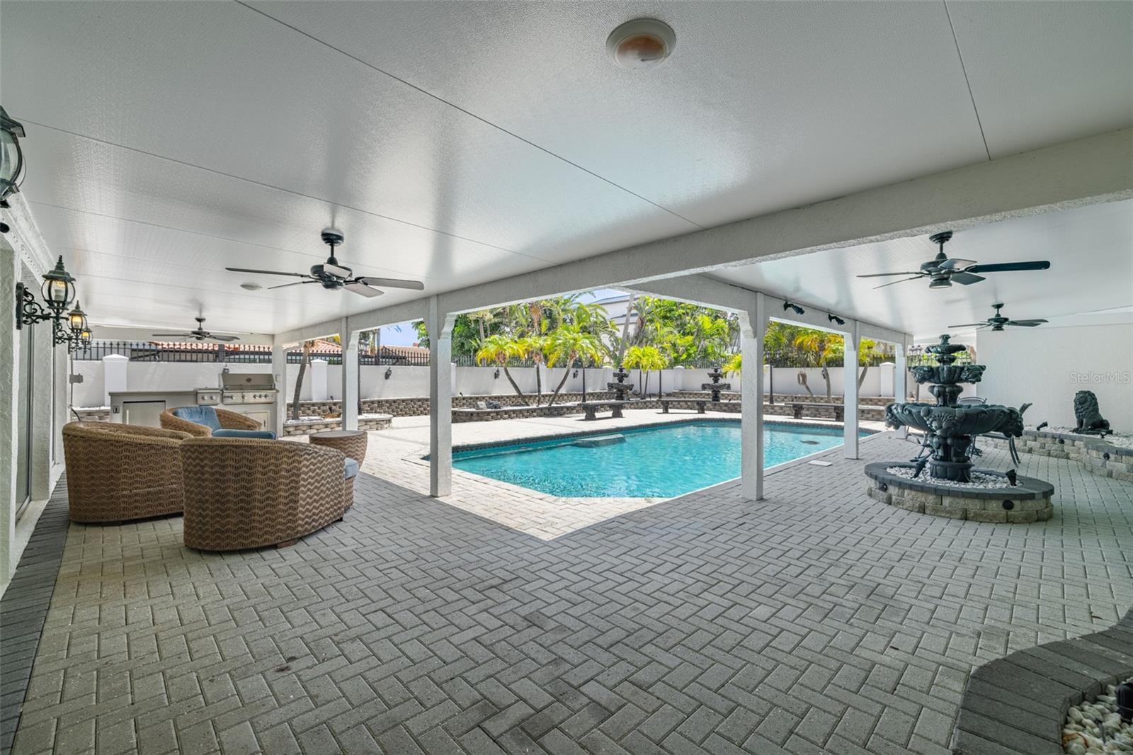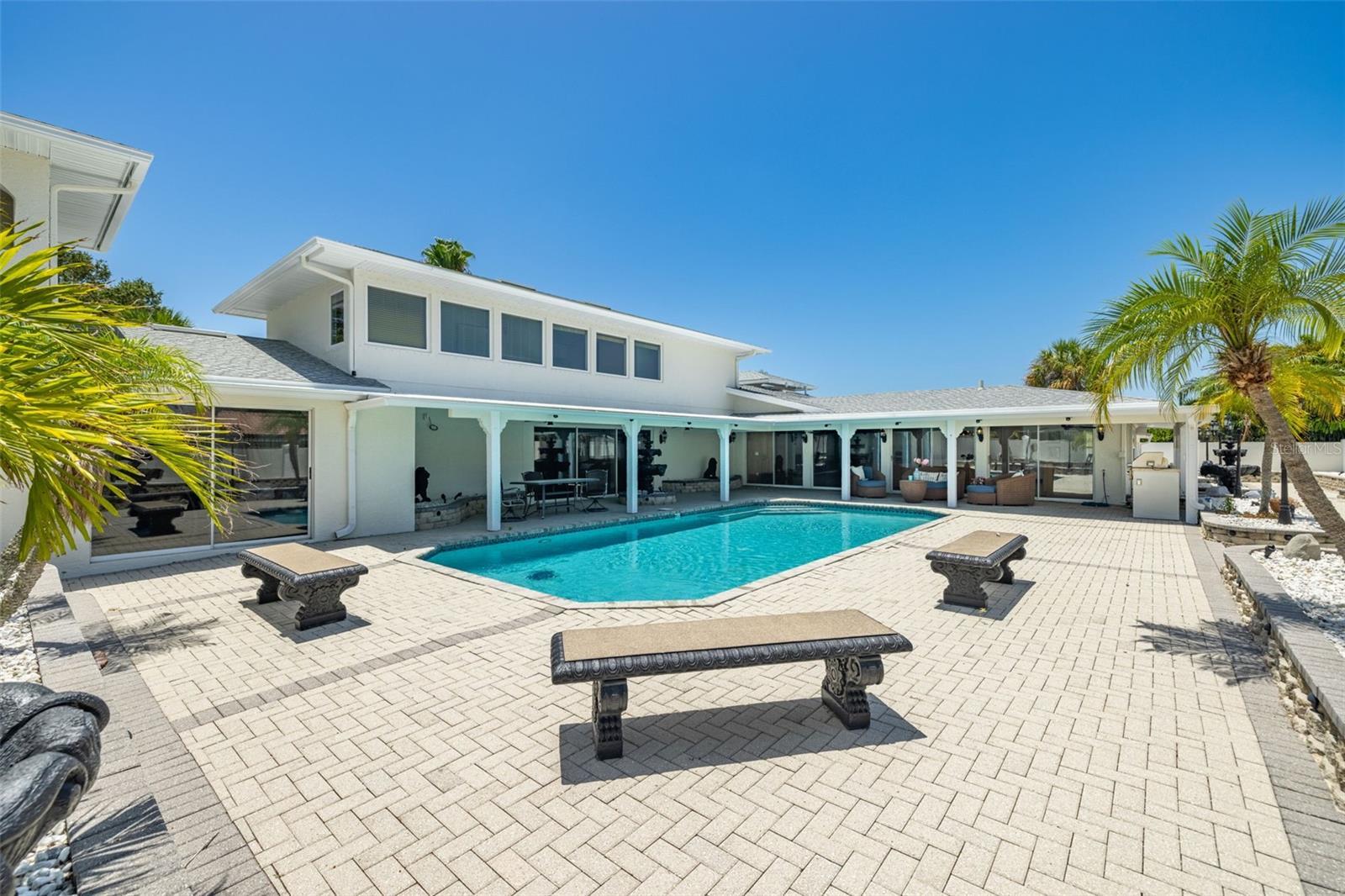 ELEVATED ABOVE THE STREET ON AN EXPANSIVE DOUBLE LOT! This freshly painted Tierra Verde residence offers stately curb appeal, generous scale, large private pool backyard, and outstanding potential. A paved driveway leads to the inviting porch with entry door and continues onto oversized garage and offers ample surface parking—perfect for showcasing a collection of vehicles. Step into the soaring foyer and discover a home thoughtfully designed for comfort, entertaining, and everyday lifestyle. To the left, a custom theater room seats up to eight. To the right, a private office with built-in closet space and substantial desk easily converts to a fifth bedroom. The open-concept living and family room centers around a stylish wet bar and media wall, flowing seamlessly into a chef-inspired kitchen. Outfitted with dual high-end refrigerators, two dishwashers, a large electric cooktop with chef’s rack, dual sinks, granite countertops, and extensive cabinetry, current dining table seats 12, this kitchen is enormous, functional and impressive. A wall of sliders ready to entertain open to a fully fenced, completely private backyard oasis featuring a sparkling pool, shaded lounging areas, ambient lighting, and an outdoor kitchen. Low-maintenance landscaping front and back allows effortless enjoyment of the lush island surroundings. The conveniently located main-level primary suite features custom built-ins, a walk-in closet, and a spa-style bath with Jacuzzi tub, walk-in shower, and smart commode. A guest bedroom and the convertible office complete the downstairs with a nearby half bath. Upstairs, two spacious guest bedrooms are connected by a loft—ideal as a media space, playroom, or kitchenette—along with a stylish full bath and a large walk-in closet/bonus room. The oversized garage is a standout, offering premium red-and-black craftsman cabinetry, utility sink, ceiling beam for lifting equipment, and space for up to five vehicles. With direct access to the side and rear yard, it’s a dream setup for car collectors or hands-on enthusiasts. With its exceptional privacy, flexible layout, zero hurricane or flood damage, and generous footprint, this residence offers rare value and opportunity in one of Tierra Verde’s most sought-after island communities—ready for a personalized touch to bring it to its full potential. Roof 2023. Located 10 mins from downtown St Pete, 30 mins to TPA, 10 mins to Ft DeSoto Park & Beaches