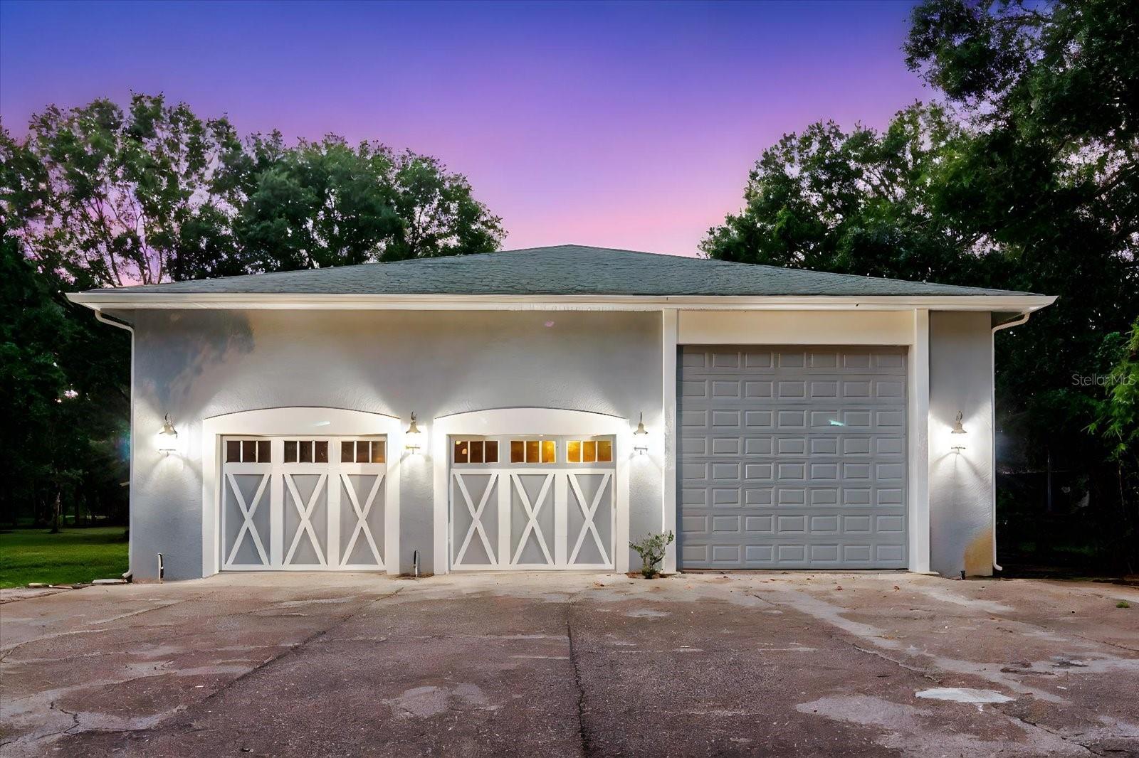 One or more photo(s) has been virtually staged. Enjoy 3.16 acres of no-HOA, no-CDD, freedom with this modern farmhouse featuring 4,563 sq. ft. (main house Under roof) and nearly 3540 sq. ft. of Garage/workshop areas. Highlights include a wrap-around porch, brand-new roof, three new AC units, and two primary suites one on each level plus two oversized bedrooms and a renovated bath. The massive block Garage building offers an 840 sq ft of climate-controlled storage, an office space and or Gym, an upstairs 840 sq ft studio with full bath and wet bar, ideal for guests or an in-law suite, and an RV/boat/car lift space. A third block detached building workshop adds even more possibilities. All of this sits on roughly two-thirds of the property, with a separately fenced 1-acre section ideal for horses, a barn, gardens, or additional storage. Located just minutes from shopping and dining, yet offering the peaceful privacy of country living. The property is fully fenced and gated. all just minutes from shopping and dining yet surrounded by peaceful privacy.