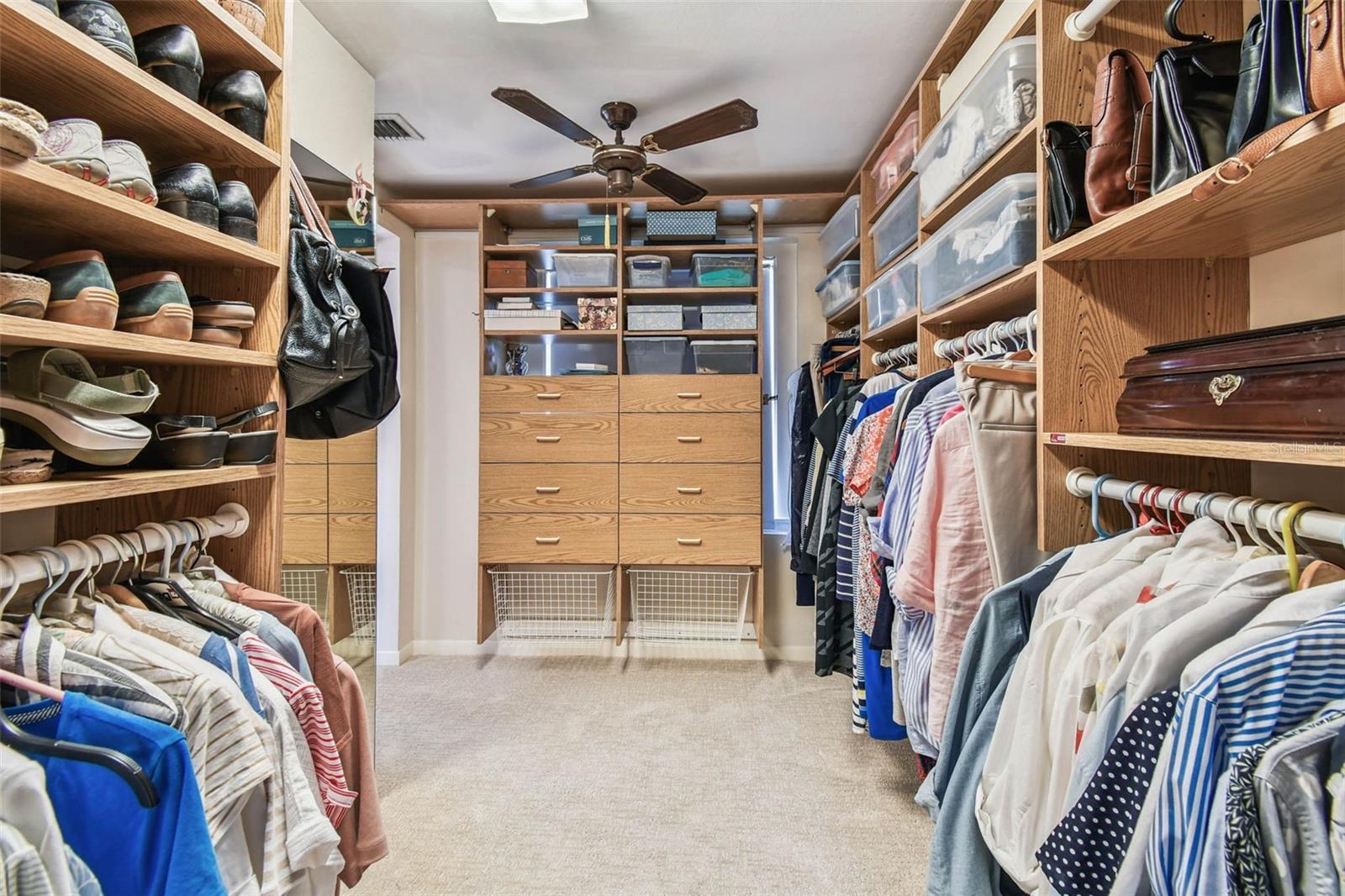 - Built-in Features, Ceiling Fans(s), Crown Molding, Eat-in Kitchen, PrimaryBedroom Upstairs, Solid Wood Cabinets, Stone Counters, Thermostat, Walk-In Closet(s), Window Treatments