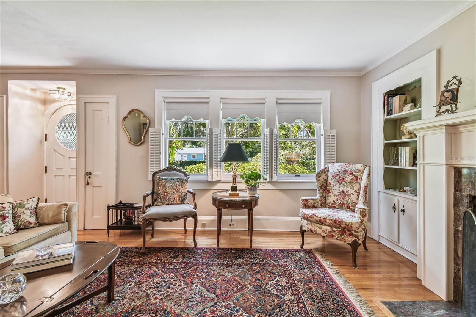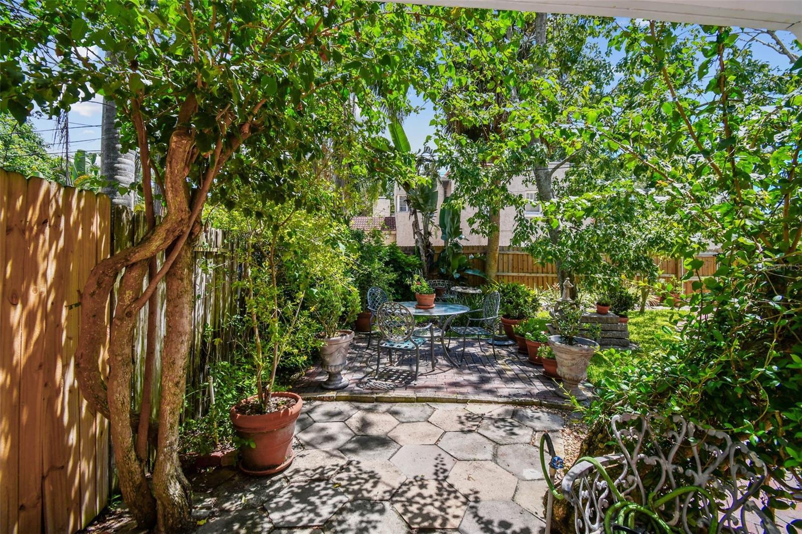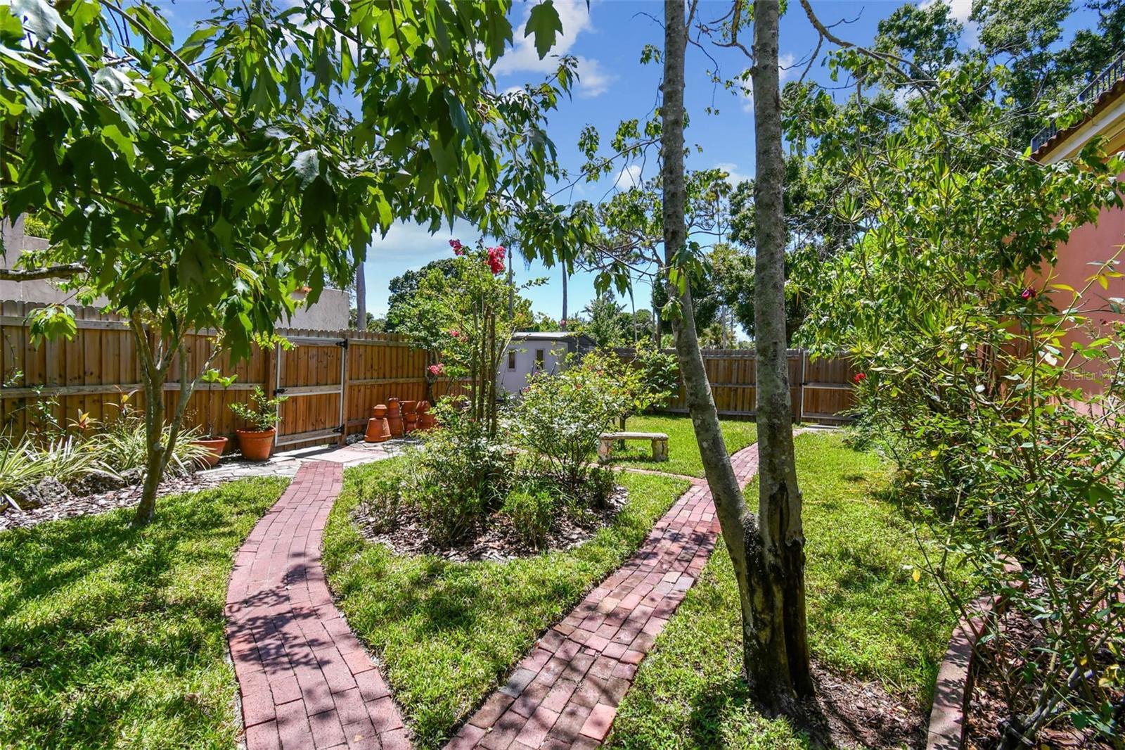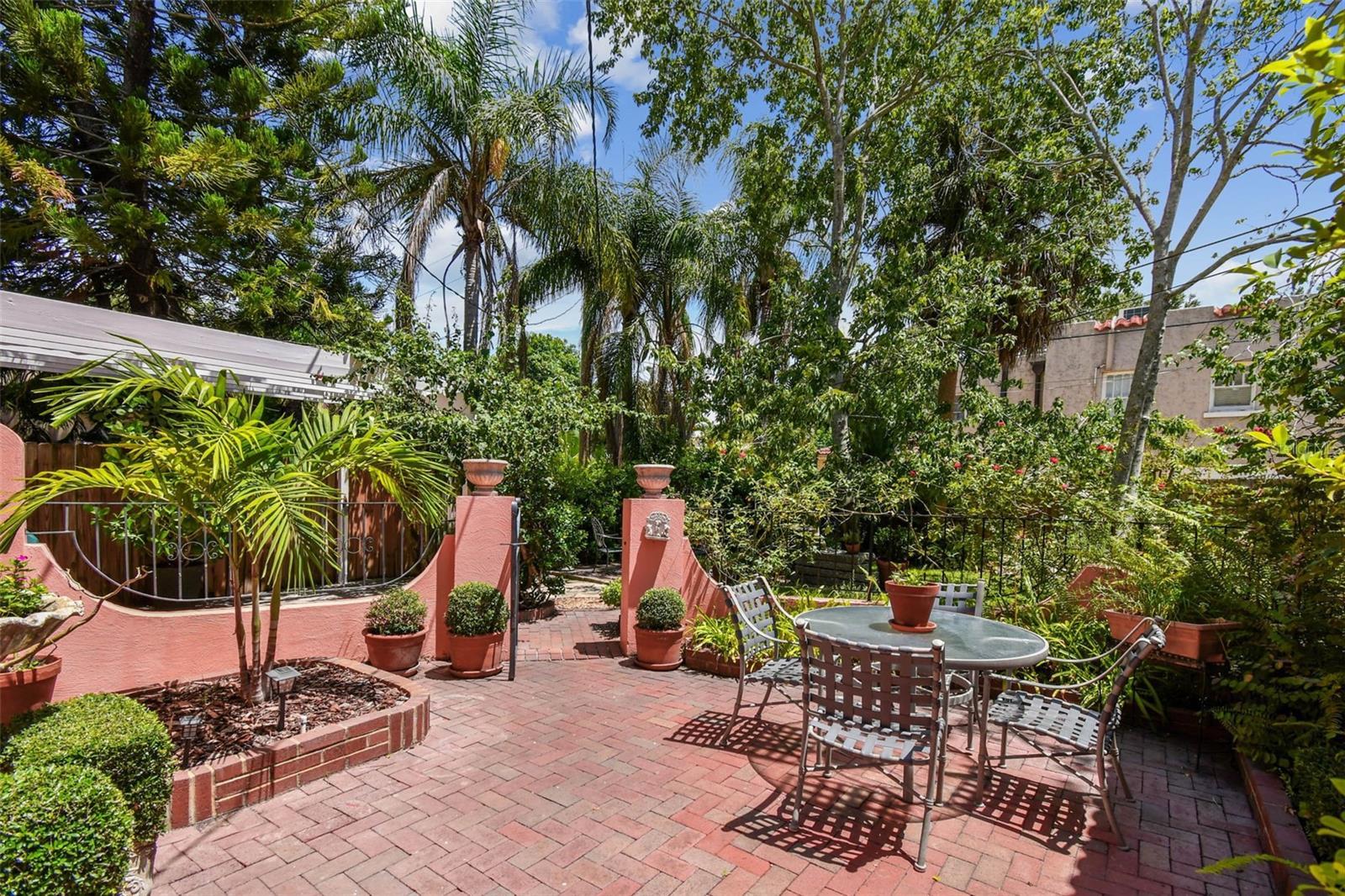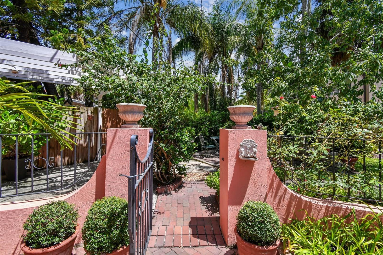 Fabulous two-story historic home with three bedrooms, three baths and a garage apartment in brick-lined Old Pasadena! On two landscaped tree-lined lots, this home was the first home built in Old Pasadena in 1920 and is maintained with pride, modern amenities, and updated key home systems. Electrical replaced July 2025, two roofs replaced 2024, another roof in 2020, and new air conditioners in 2025. Interior of home is impeccable with oak floors, neutral paint, built-in bookcases, lots of sunlight, window shutters, front door custom built with leaded glass design and large fireplace with marble hearth. Home has a great floor plan with a large family room, separate office, sun-filled breakfast room and a spacious kitchen. You can entertain in style and with plenty of space for cooking, dining and socializing. The brick patio and courtyard have multiple areas to enjoy the gardens and alfresco dining with a flower-covered gazebo and wrought iron gate leading you to more green areas. Extremely picturesque! The garage apartment has one bedroom, full eat-in kitchen, wood floors, separate outside entry and is easily rented. Garage has a workshop and space for additional storage. No flooding or power loss during past hurricanes. Close to beaches, schools, hospital, shopping centers, and 10 minutes from downtown.