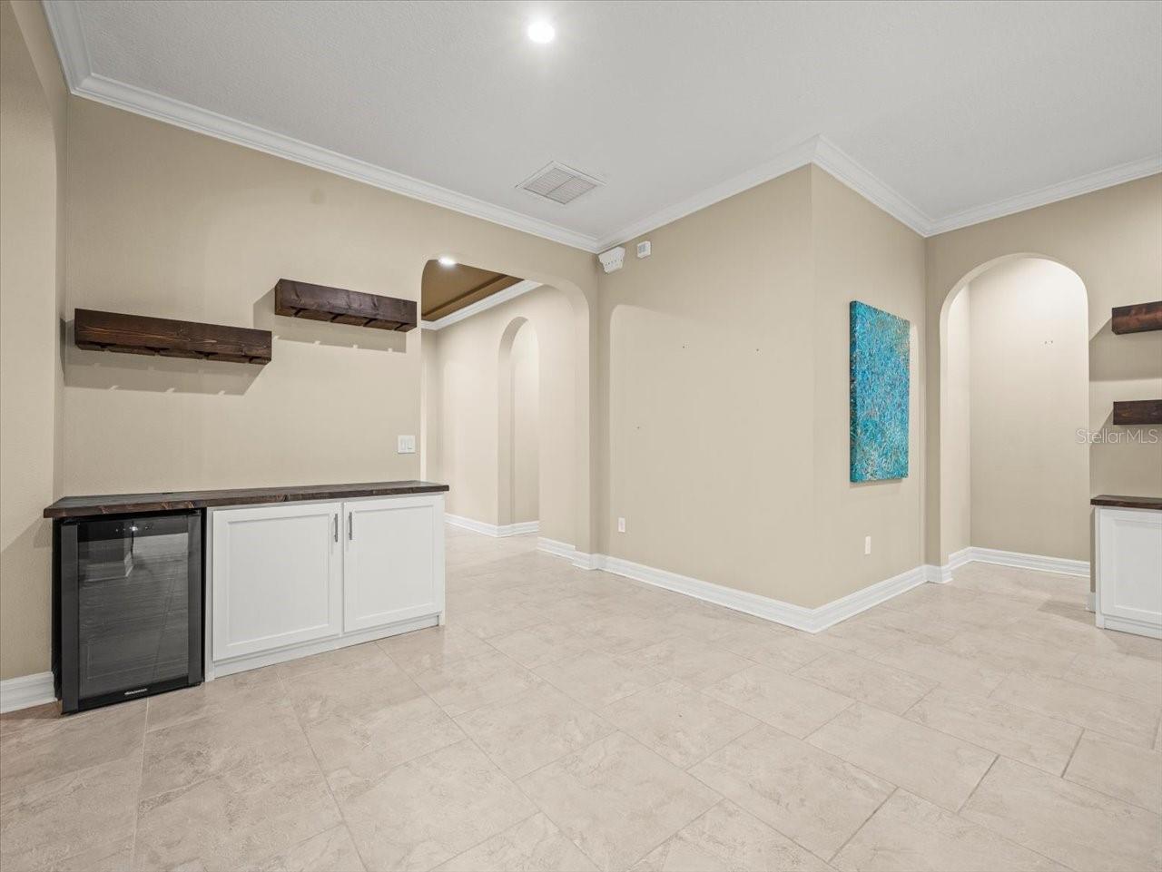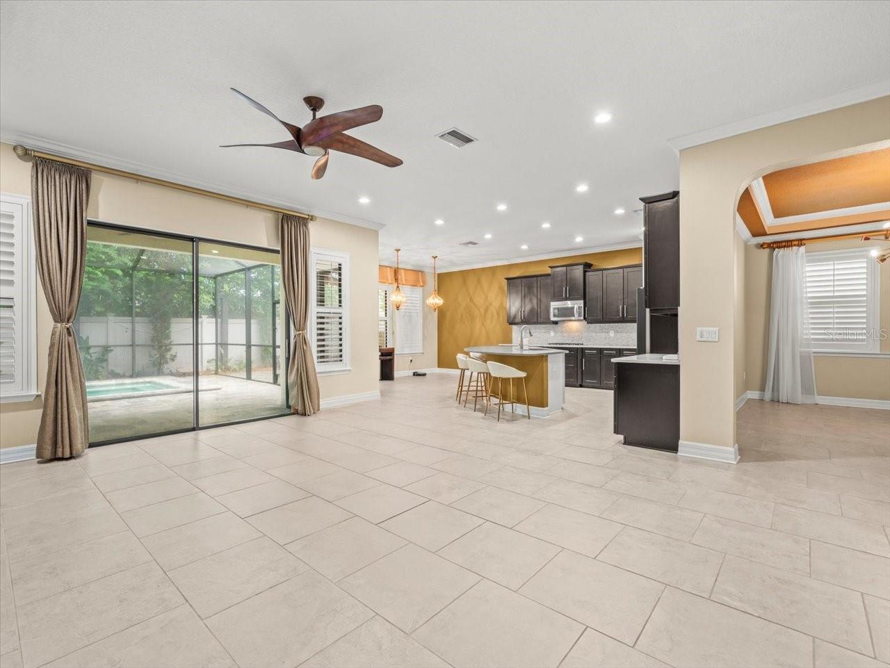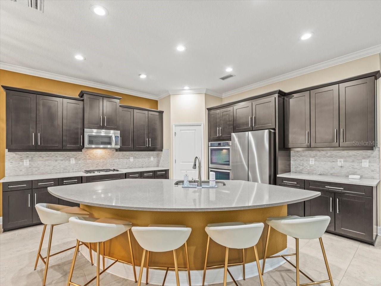 - Built-in Features, Ceiling Fans(s), Crown Molding, Dry Bar, Eat-in Kitchen, High Ceilings, Kitchen/Family Room Combo, Open Floorplan, Primary Bedroom Main Floor, Split Bedroom, Stone Counters, Walk-In Closet(s)