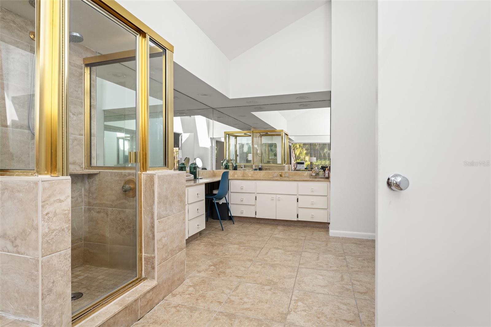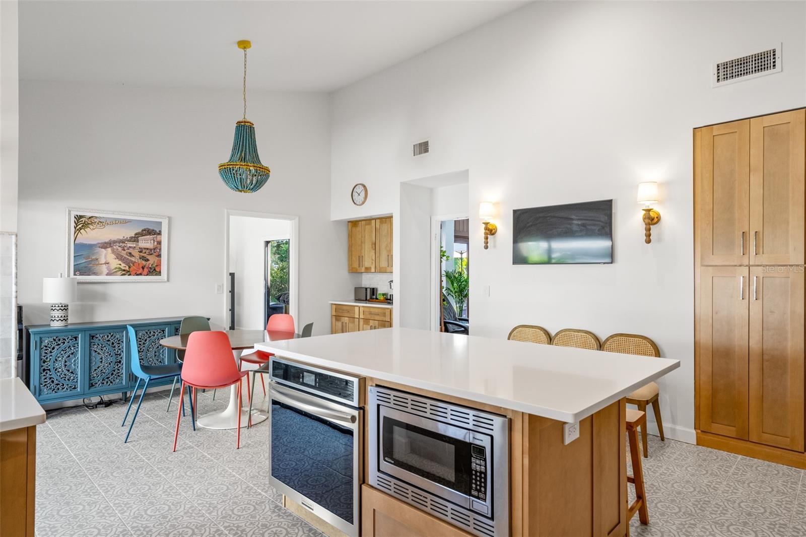 - Built-in Features, Cathedral Ceiling(s), Ceiling Fans(s), Eat-in Kitchen, High Ceilings, Living Room/Dining Room Combo, Primary Bedroom Main Floor, Solid Surface Counters, Solid Wood Cabinets, Stone Counters, Thermostat, Vaulted Ceiling(s), Walk-In Closet(s), Window Treatments