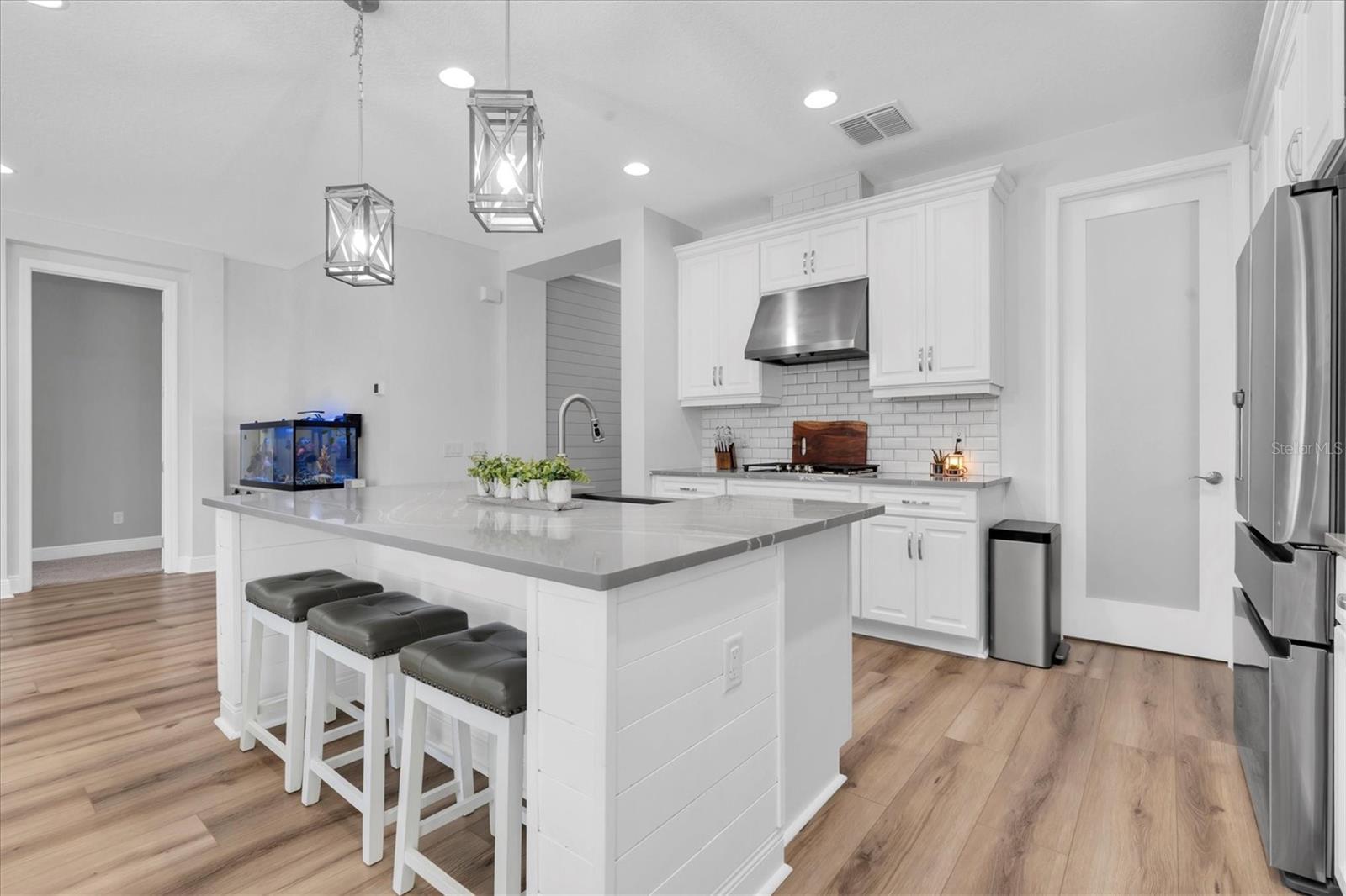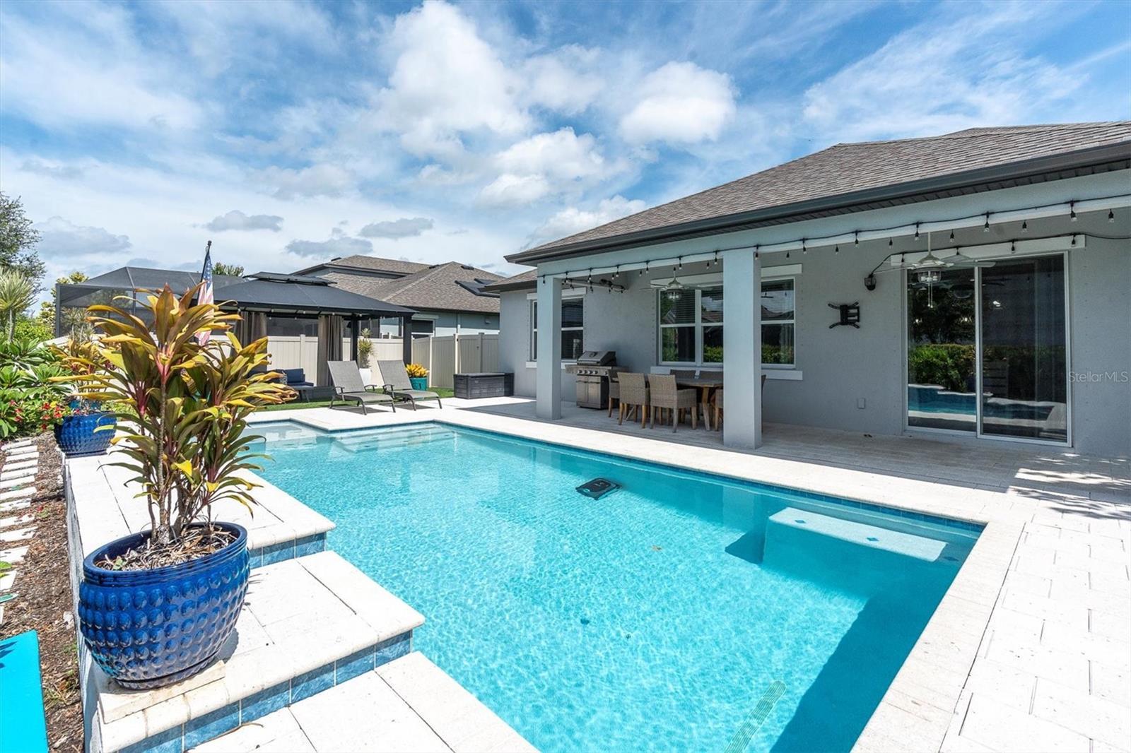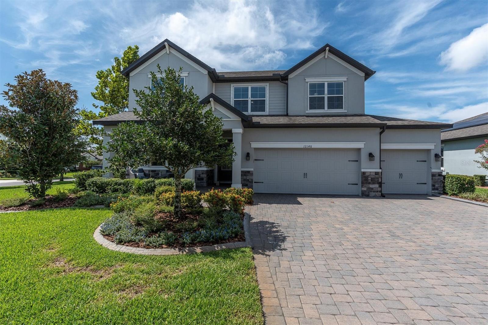 Under contract-accepting backup offers. INVITING POOL HOME IN DESIRABLE STARKEY RANCH! Well Appointed MI Homes Santa Monica on a corner lot offers 4/3.5/3 + bonus rm & office with large, covered lanai overlooking 26 x 13 Pebble Tec pool with sun shelf and fully fenced turf yard with beautiful gazebo located in Albritton in the highly sought-after community of Starkey Ranch. Custom designed in 2019 w/ over 60K in luxurious upgrades w/ builder & 135K after market, this intelligently positioned & popular open floor plan offers functional living space for entertaining & everyday life. Attractive exterior has exceptional curb appeal thanks to the stone detail, Hardie Siding, paver driveway, manicured landscaping with designer curbing & a welcoming front porch. Entering the foyer through the frosted glass inlay front door, the soaring ceiling, custom vertical shiplap wall & modern light fixtures capture your attention. Newly added neutral waterproof & scratchproof Luxury vinyl floor is located throughout most of the home creating a consistent flow. As you enter the foyer, to the left is the office with ceiling fan, double window and a half bath close by. The open floor plan unfolds offering a cozy gathering place to entertain and relax. The spacious living room is anchored by a ceiling fan, tray ceiling, shiplap wall & a beautiful view of the pool. The luxurious Gourmet kitchen will impress w/ White 42’ Raised Panel wood cabinets & Drawers accented w/ crown molding are complimented by brushed nickel hardware & subway backsplash blend beautifully w/ upgraded Dove Gray Quartz counters. Custom walk-in pantry helps stay organized. Spacious island with shiplap accent seats 3 bar stools comfortably illuminated by 2 Pendant Lights. Island also provides additional storage, a deep basin sink & Moen Gooseneck faucet. Upgraded Stainless appliances include refrigerator, 5 burner gas cooktop, Built in oven & microwave & Dishwasher. A dining room, adjacent to the kitchen, highlighted by chandelier and accent chair rail, offers pretty views of the pool. Located on the 1st floor, the spacious owners retreat offers ample room for furniture w/ ceiling fan and views of the pool. Luxurious selections in ensuite impress w/ his & hers quartz counters, cabinets & drawers, frameless oversized walk-in shower with listello, pebble floor & bench. Ascend the wrought iron staircase with white risers & LVP floors to the second story where a large bonus rm will be useful space to gather for a football game or movie night. Well-sized Br 2 offers ensuite bath. Br 3 and 4 are located close by with an adjacent full bath w/ tub shower combo & dual sinks. The extended covered lanai with breezy ceiling fans will be a nice area to BBQ or enjoy morning coffee. The sparkling 26x13 pool with sunshelf surrounded by shellac pavers will provide hours of entertainment and enjoyment. This fully fenced yard is made even more private with a natural barrier and turf for easy care. An outdoor gazebo with electricity adds to the enjoyment of this exceptional outdoor space. *Baskeball Hoop* Laundry Room w/ Cabinets & Shiplap* Starkey Ranch offers an unparalleled lifestyle w/ its Magnet K-8 school, 3 pools, playgrounds & 20 miles of trails. Easy access to Restaurants, Publix, beaches & Tampa Airport. Make this exquisite home yours.