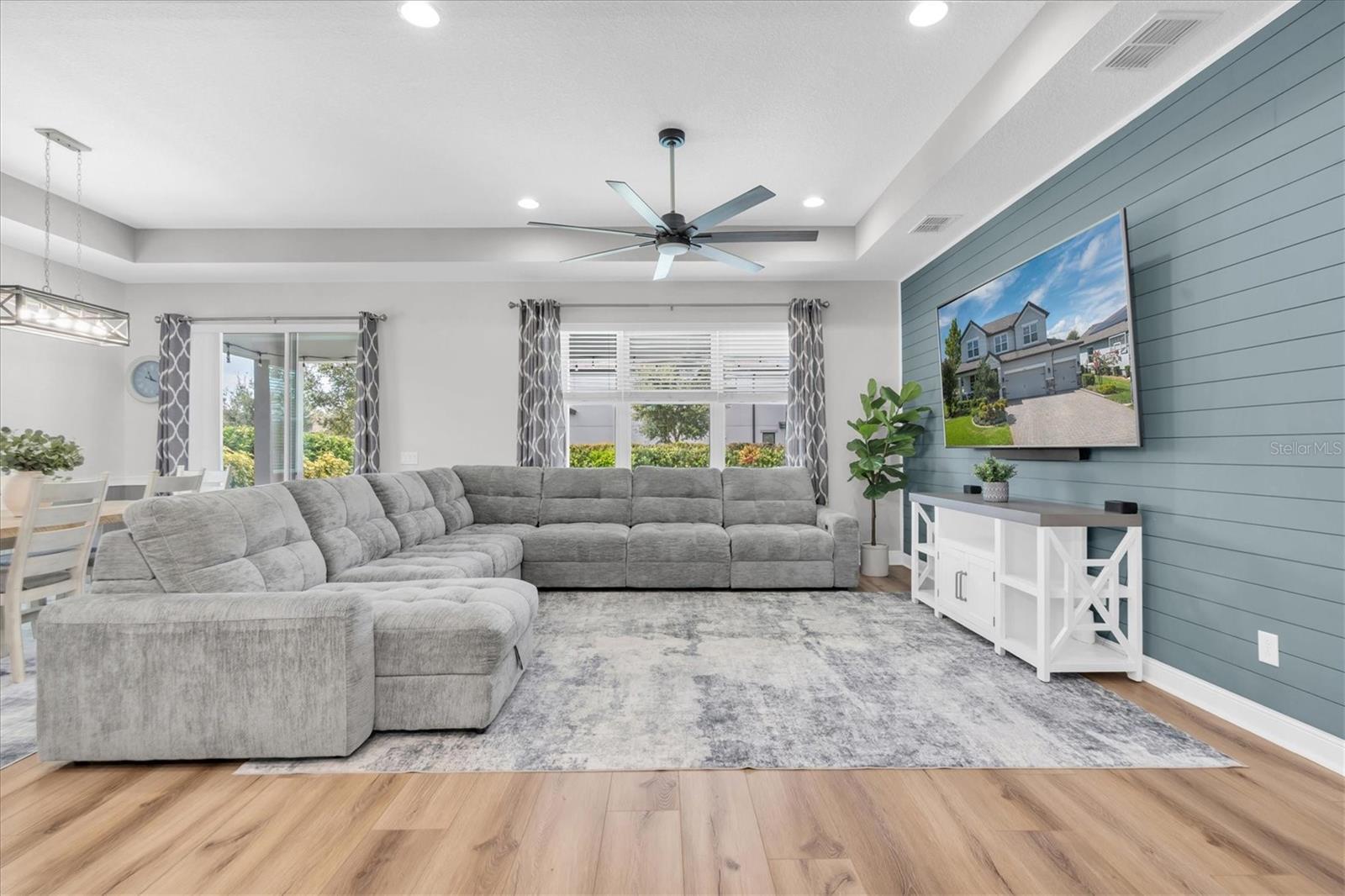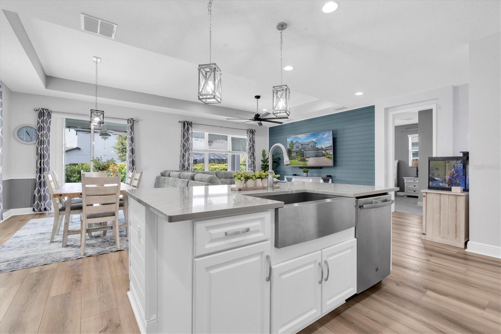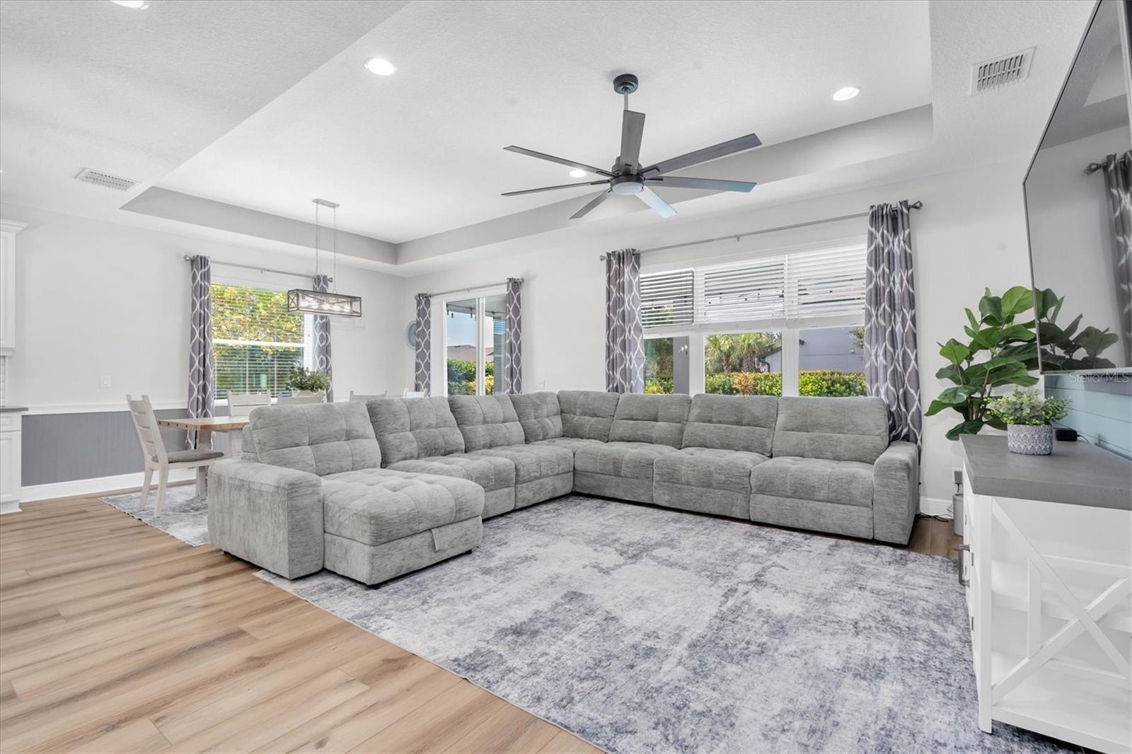 - Ceiling Fans(s), Eat-in Kitchen, High Ceilings, Kitchen/Family Room Combo, Living Room/Dining Room Combo, Open Floorplan, Primary Bedroom Main Floor, Solid Wood Cabinets, Stone Counters, Thermostat, Tray Ceiling(s), Walk-In Closet(s)
