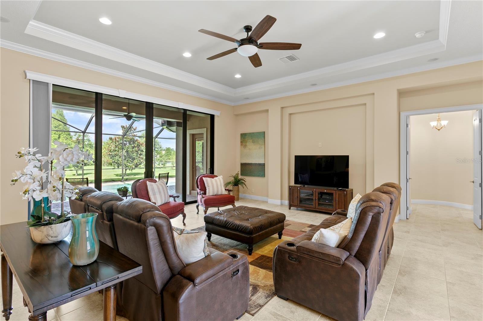 The charm of Ladera Estates - live expansively, privately, and beautifully. Known for it’s blend of tranquility and convenience, Ladera Estates offers a unique, gated lakefront community on Lake Merrywater. Welcome to 1213 Merry Water Drive with a timeless design, modern comfort, and breathtaking natural surroundings. Built in 2015 and situated on just under an acre with no rear neighbors, this custom-built residence offers 4882 sq ft of total living space. Set on .98 of an acre, this estate is designed for both grand entertaining and everyday luxury. Key Features: • GREAT ROOM – Enter through double doors into the Great Room with 12-ft ceilings, surround sound, and views of the pool, conservation and pond. A comfortable family room with sliding glass doors for seamless living to the outdoor terrace. • DESIGNER KITCHEN – An oversized granite island anchors the space, complemented by a hidden walk-in pantry with a coffee bar and dining room built in storage. Open concept living with an oversized casual dining room - ideal for gatherings large or small. • PRIMARY SUITE & MAIN LEVEL ROOMS – The main-level primary suite includes dual custom walk-in closets, and spa-inspired bath with freestanding tub and oversized walk-in shower. Three additional bedrooms, as oversized study, and drop-zone with built-ins next to a large laundry room complete the thoughtful main floor. • UPSTAIRS LIVING – Two oversized suites upstairs, each with private baths and large closets—perfect for guests, teens, or multigenerational living. The upstairs entertainment zone includes a large bonus room, wet bar with fridge, and balcony overlooking the serene pond and backyard conservation views. A separate movie room with 1/2 bath complete this entertainment space • RESORT-STYLE LIVING Heated pool with sunshelf, covered and fully screened terrace, full summer kitchen, and access to a pool bath. Lush, mature landscaping and lots of extra green space are a perfect space for play or pets• ADDITIONAL HIGHLIGHTS – Features 8-foot doors on both levels, 3-car garage, custom-finished walk-in closets, pantry and additional storage closet, crown and tray ceilings throughout. • This estate is more than a home- it’s a retreat. Wake up to sunrise views, unwind in complete privacy, and enjoy the serenity of expansive natural surroundings that draw you to Ladera Estates.• Located in Lutz- one of the Tampa Bay area’s most sought-after communities for its natural beauty, larger homesites, and tranquil lifestyle- you’ll enjoy the peace of country-style living with the convenience of being just minutes from top-rated schools, hospitals, dining, shopping, major highways, and Tampa International Airport. It’s the perfect balance of space, serenity, and accessibility.