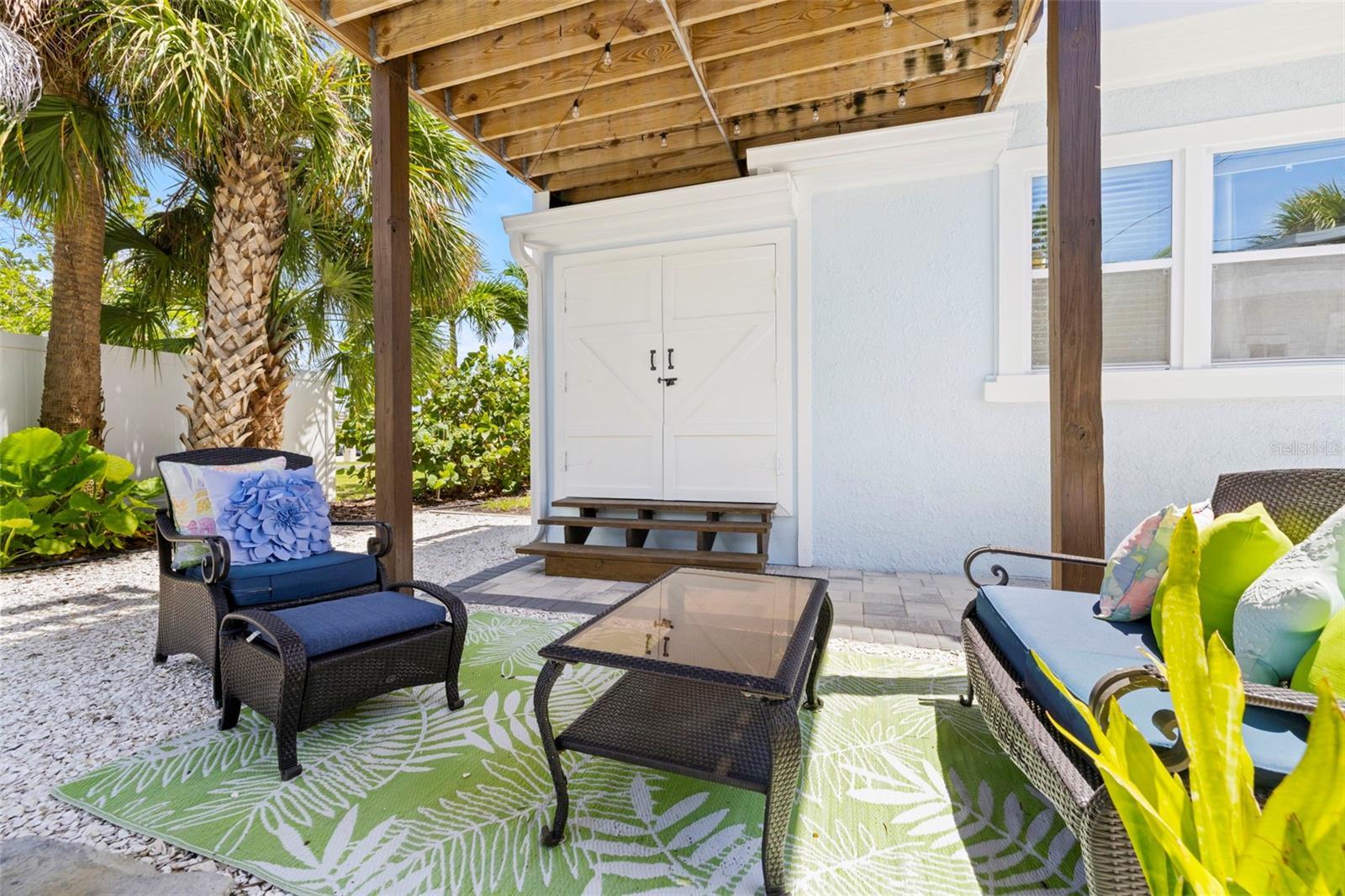 - Awning(s), Courtyard, French Doors, Rain Gutters, Sprinkler Metered, Storage