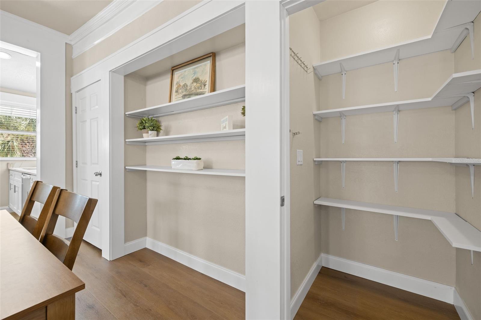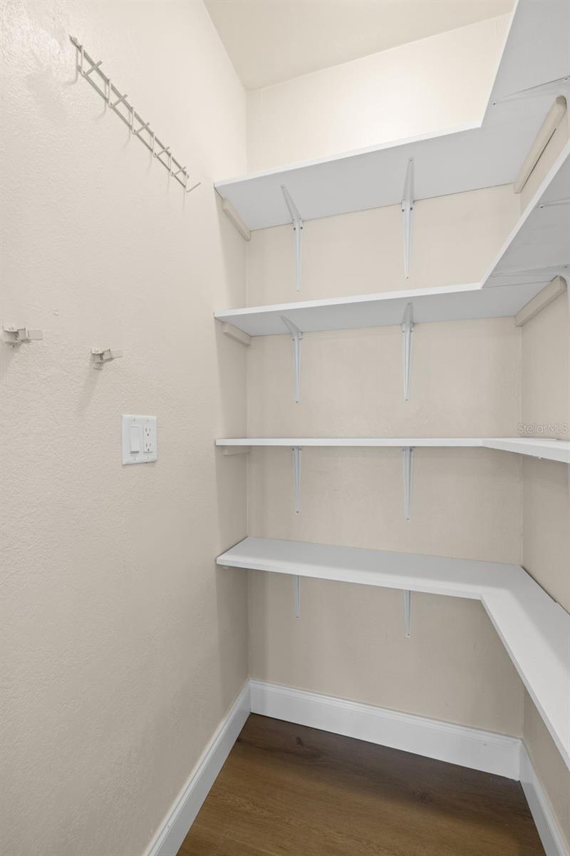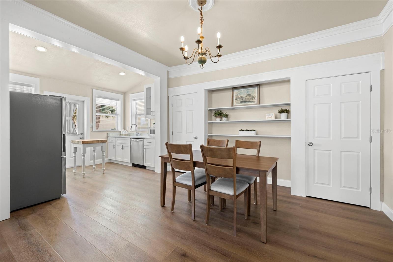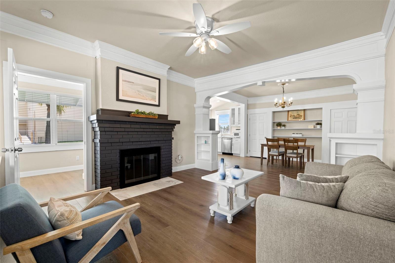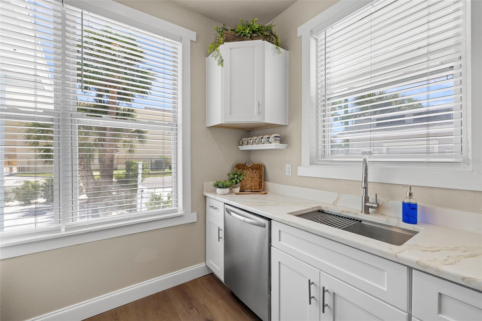 - Built-in Features, Ceiling Fans(s), Eat-in Kitchen, High Ceilings, Living Room/Dining Room Combo, Open Floorplan, Solid Wood Cabinets, Split Bedroom, Stone Counters, Thermostat, Window Treatments