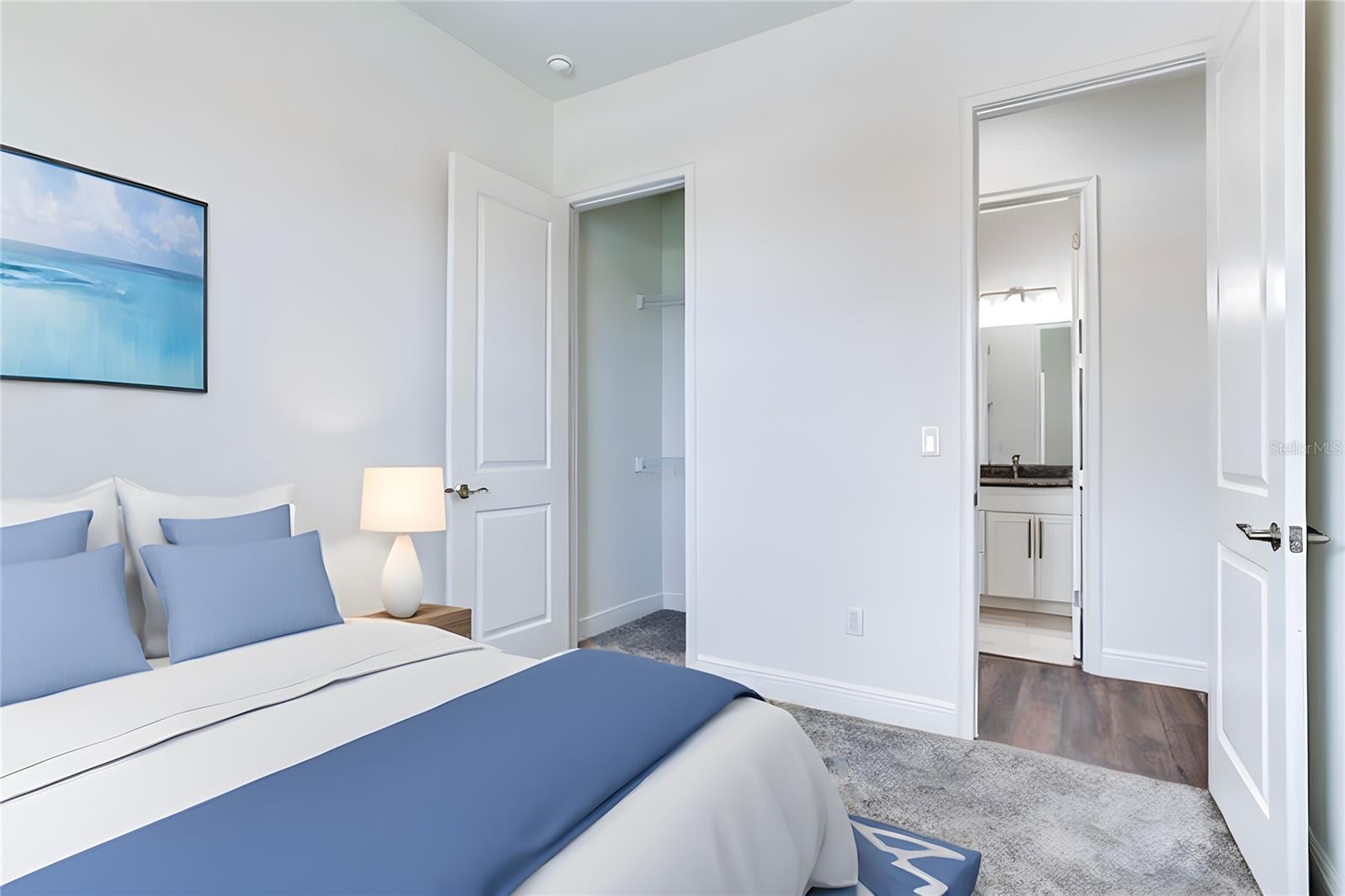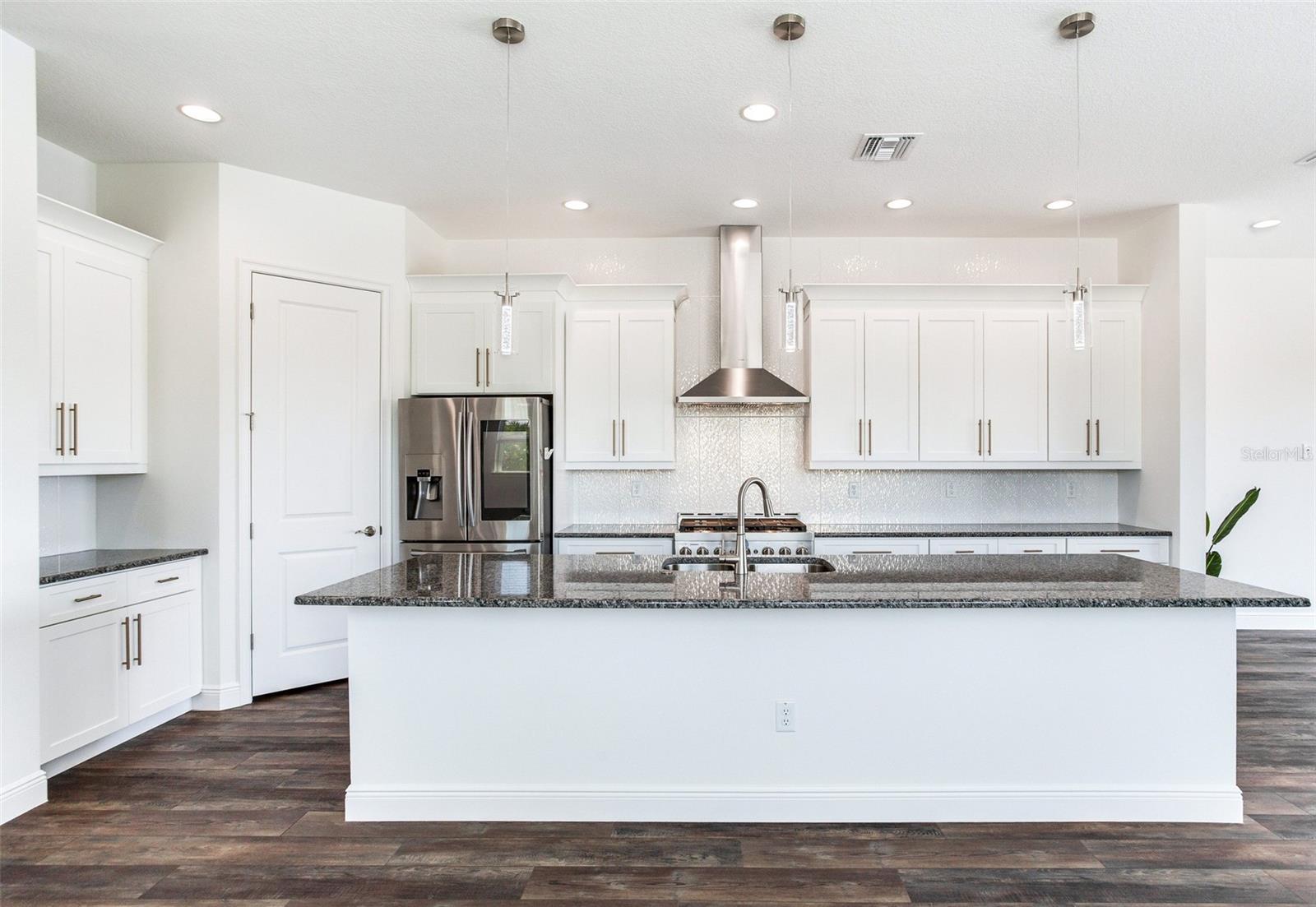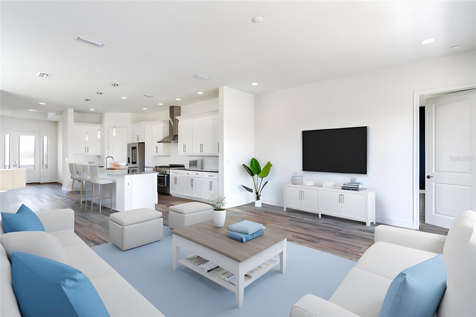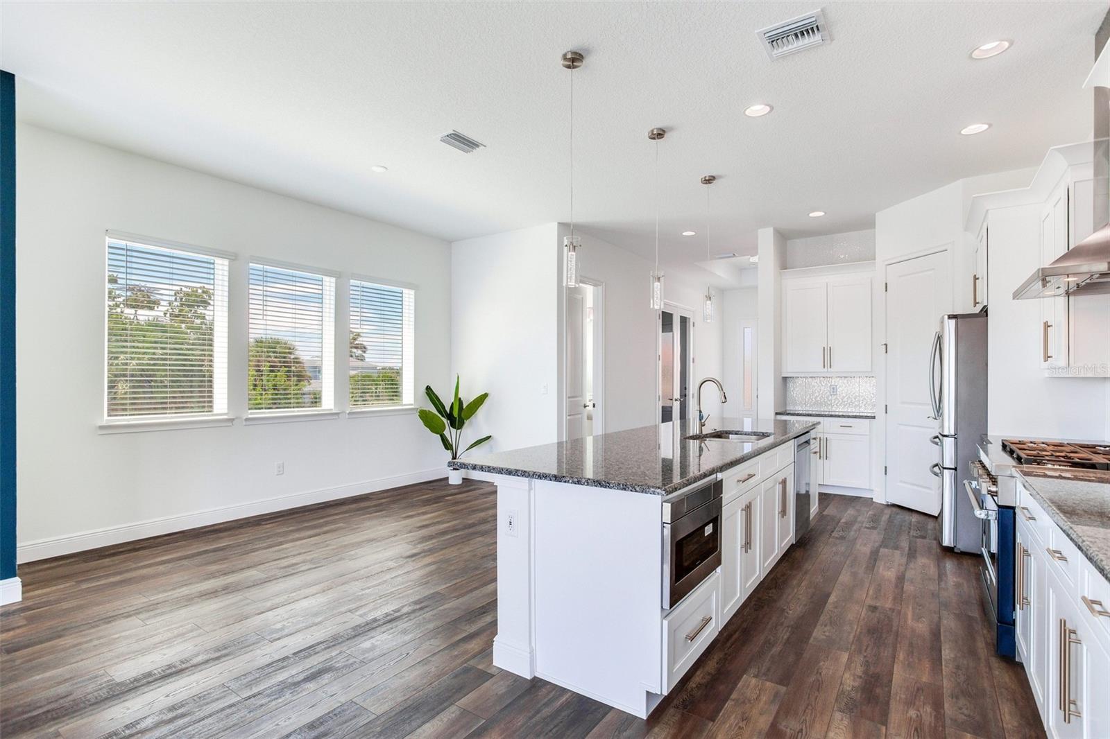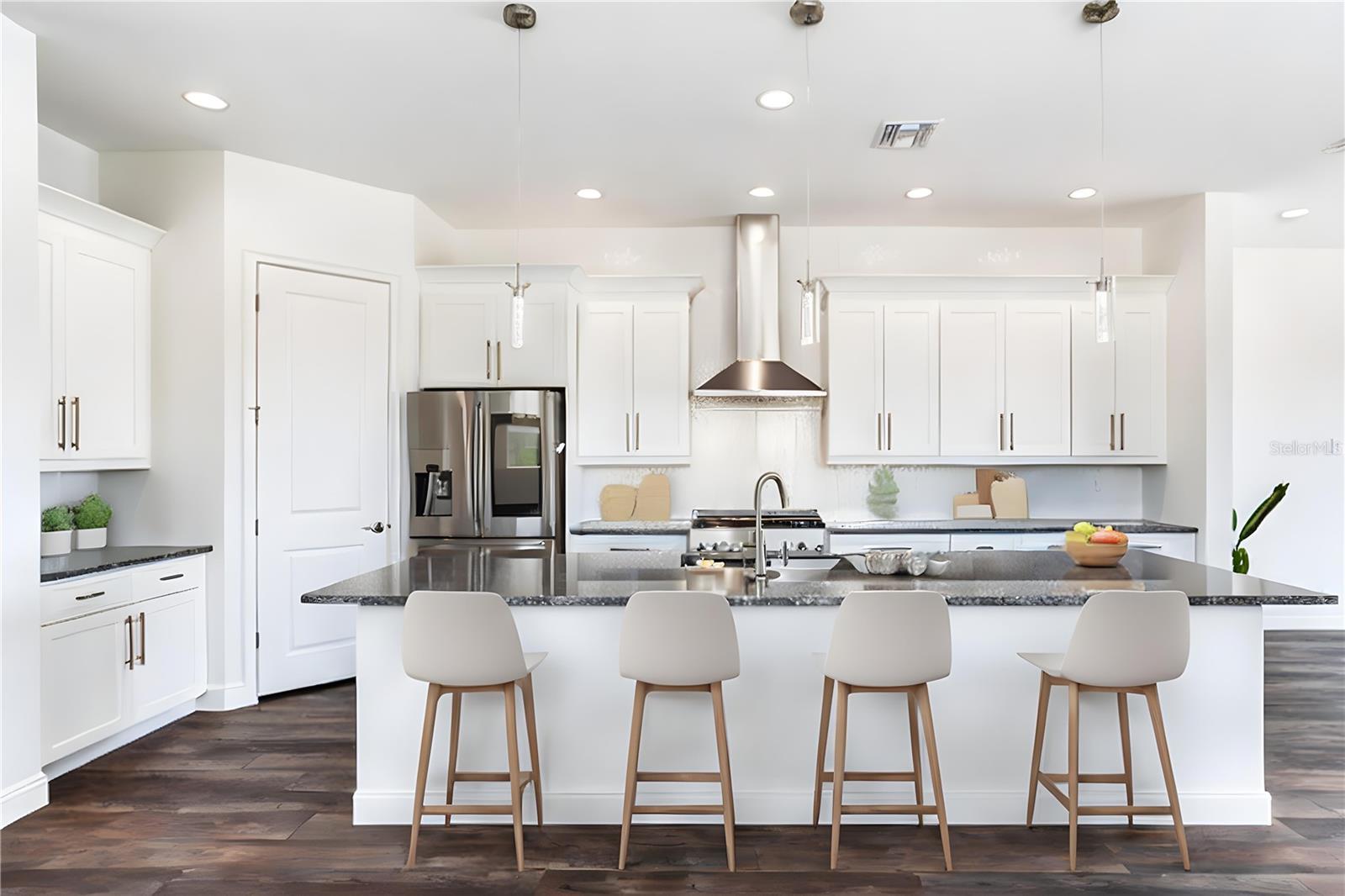 - Ceiling Fans(s), Eat-in Kitchen, High Ceilings, Kitchen/Family Room Combo, Open Floorplan, Solid Surface Counters, Solid Wood Cabinets, Split Bedroom, Stone Counters, Walk-In Closet(s)