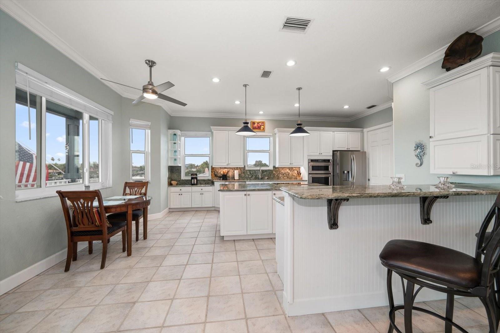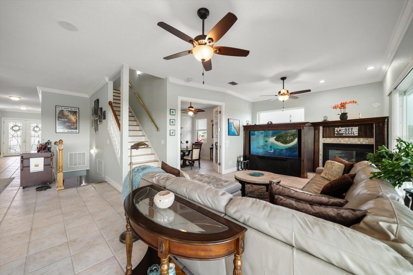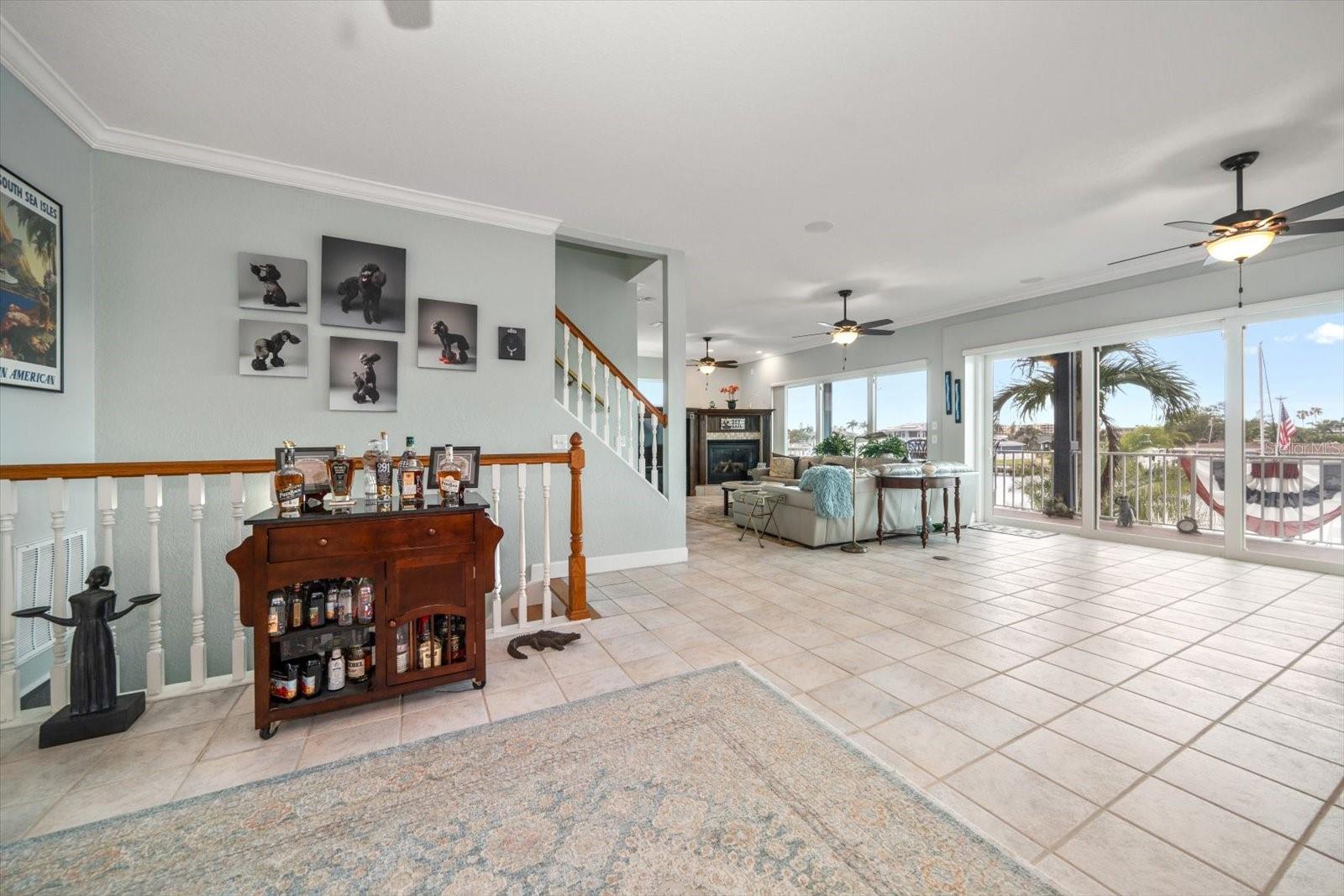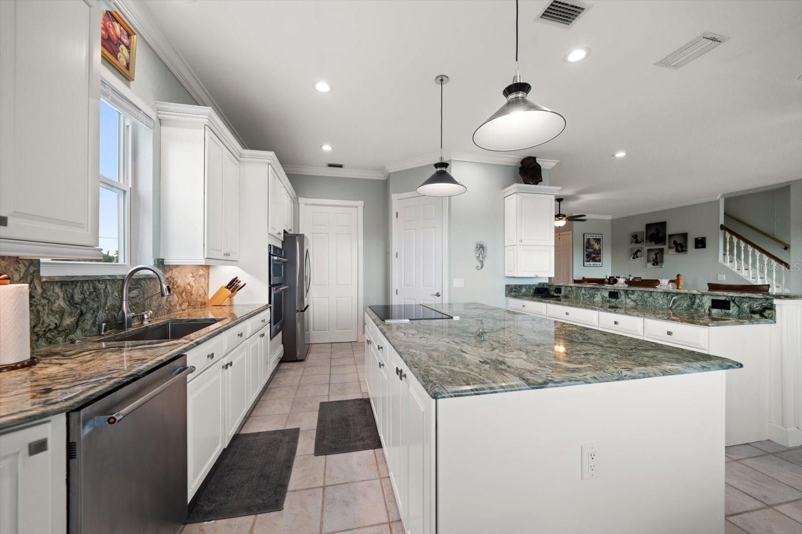 - Cathedral Ceiling(s), Ceiling Fans(s), Crown Molding, Eat-in Kitchen, High Ceilings, Kitchen/Family Room Combo, PrimaryBedroom Upstairs, Stone Counters, Walk-In Closet(s), Window Treatments