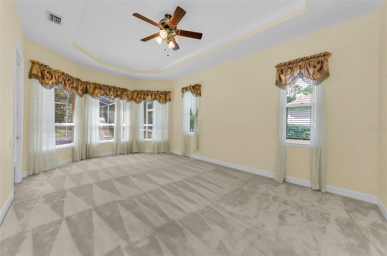 - Eat-in Kitchen, High Ceilings, Open Floorplan, Primary Bedroom Main Floor, Solid Surface Counters, Split Bedroom, Stone Counters, Thermostat, Vaulted Ceiling(s), Window Treatments