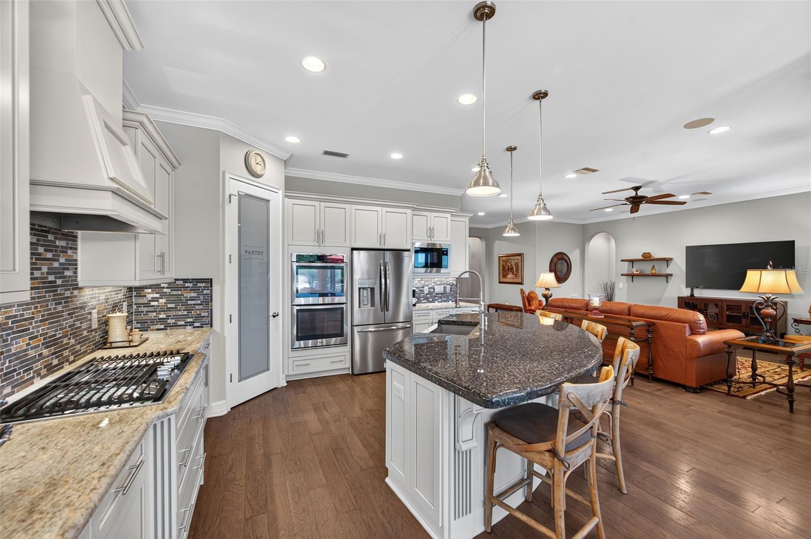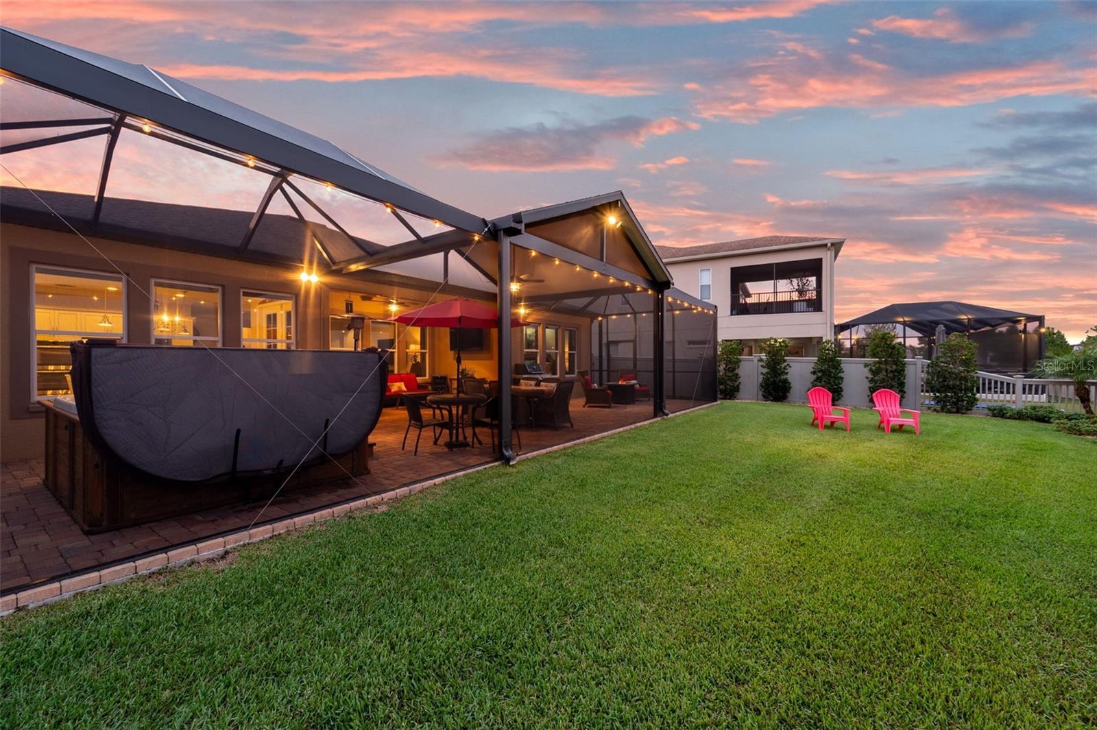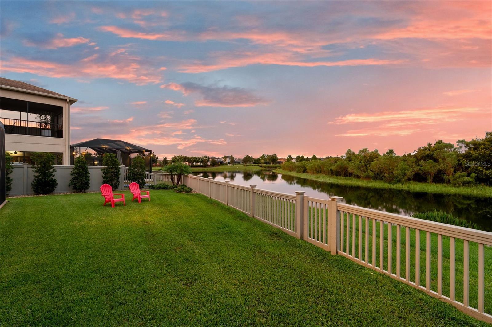 Seller is highly motivated. Now offered at an improved price. Welcome to Estancia at Wiregrass, one of Wesley Chapel's most coveted master-planned communities. The moment you step through the doors of this Hamilton floor plan, your eye is immediately drawn across the foyer to sweeping water & conservation views that set the tone for a home defined by elegance & effortless Florida living. Perfectly situated at the end of a cul-de-sac, its timeless curb appeal is evident in the brick-paved driveway, manicured landscaping, custom exterior & nebula lighting, & a freshly painted exterior that glows with sophistication. Offering 2,584 sq. ft. under air & 3,720 total sq. ft., the residence unfolds with engineered hardwood flooring throughout, crown molding, custom ceiling fans, plantation shutters, new window coverings & refined architectural details. At the heart of the home, the gourmet kitchen commands attention with an oversized island & breakfast bar, custom wood chimney hood, natural gas cooktop, double wall ovens, built-in microwave, full extension cabinetry with glass inlays & a walk-in pantry, flowing seamlessly into the formal dining room, sunlit dinette & expansive family room enhanced by surround sound. The primary suite is privately tucked away to capture serene morning light & features a spa-inspired bath with dual vanities, an oversized walk-in shower with custom tile, a soaking tub & a generous walk-in closet, while a secondary en suite bedroom & two additional bedrooms with a shared bath offer comfort & versatility. Extending the living experience outdoors, the home’s most captivating feature is its remarkable 1,000 sq. ft. lanai addition, conceived as an outdoor pavilion with a pitched roof, panoramic screening, surround sound, outdoor lighting & multiple zones for dining, lounging & entertaining, complete with a Jacuzzi spa & mounted TV that convey, all set against an unforgettable backdrop of sunrise-to-starlight views. Additional luxuries include a three-car garage with epoxy floors, a central vacuum system, whole-home water softener & filtration, outdoor patio lighting, upgraded landscaping, nebula & exterior lighting, French drains with a guest bedroom TV also remaining, creating a residence where striking curb appeal, refined interiors & extraordinary outdoor living come together in perfect harmony. Please be sure to view the 3D tour walkthrough to fully experience the sophistication, scale & lifestyle this exceptional home offers!