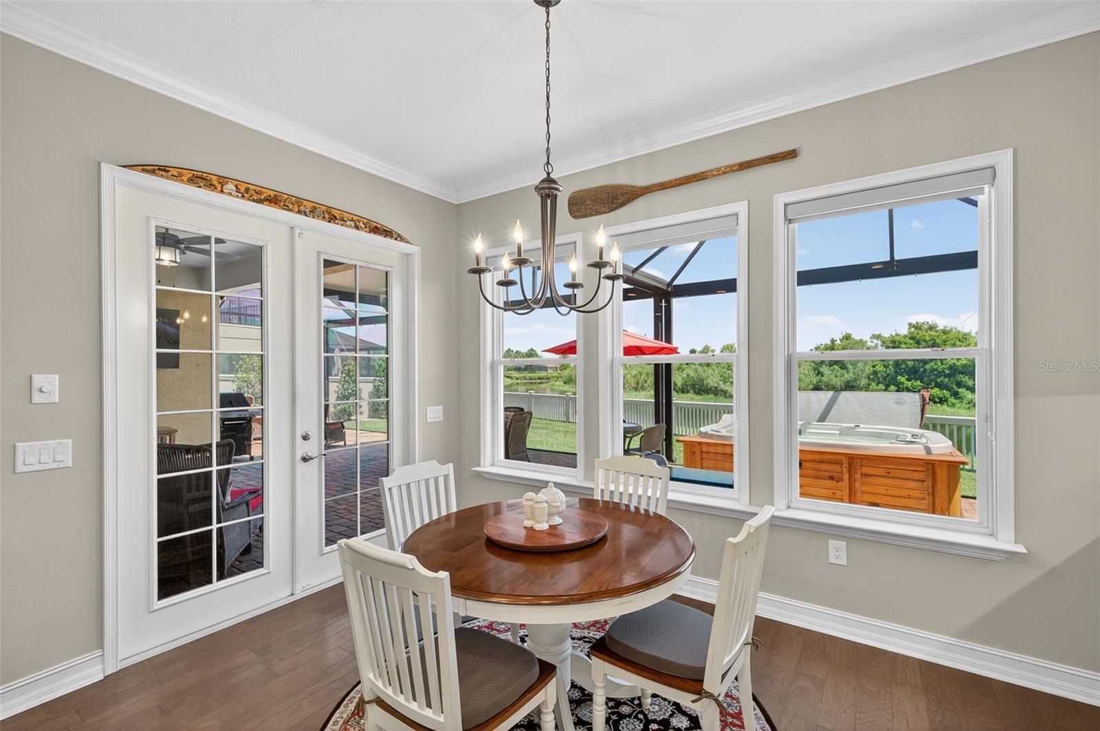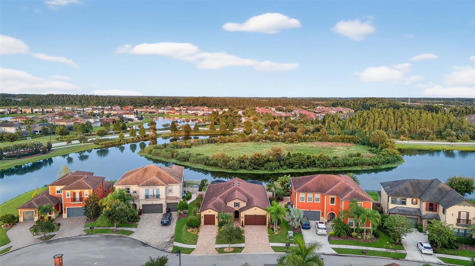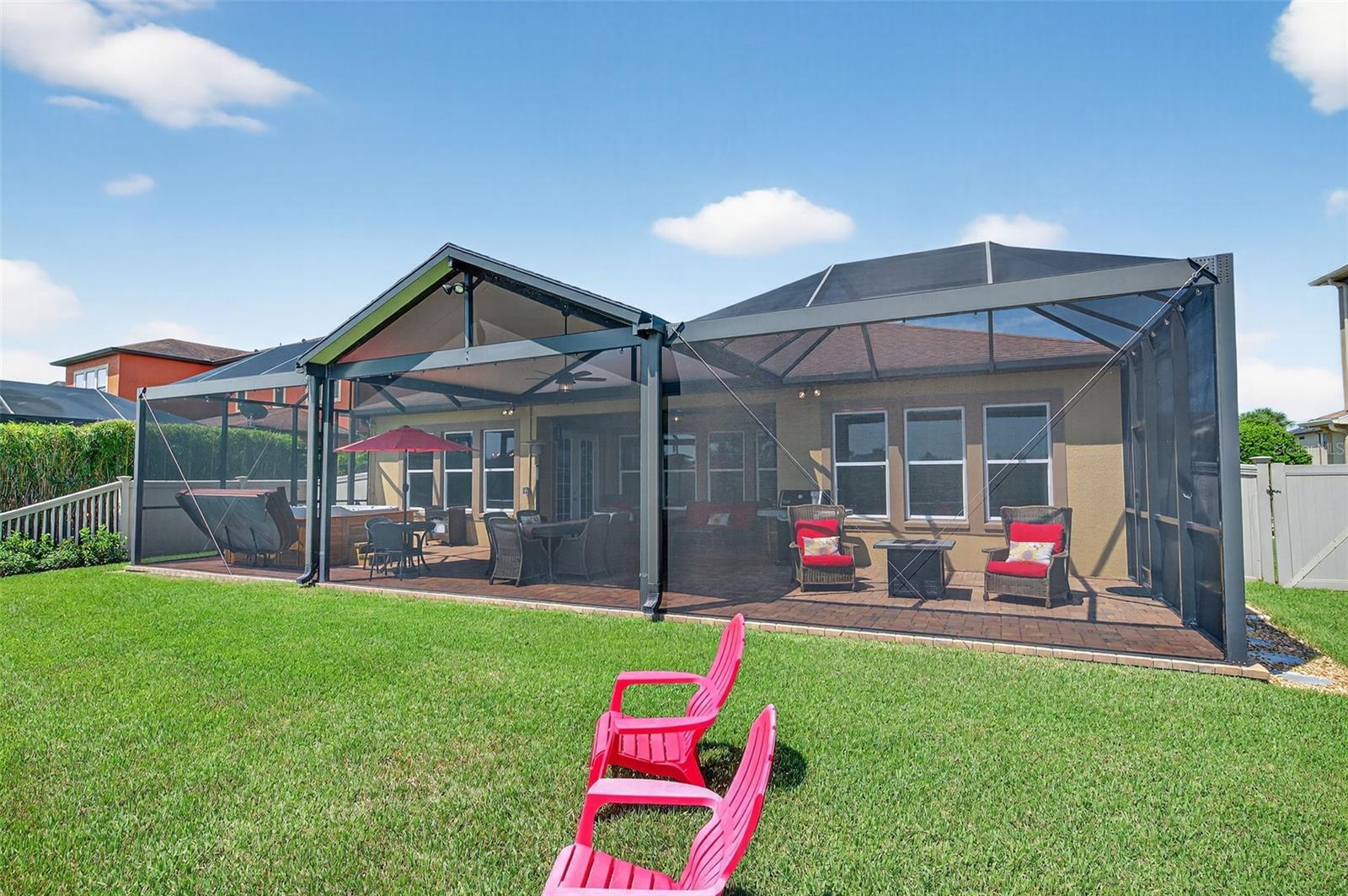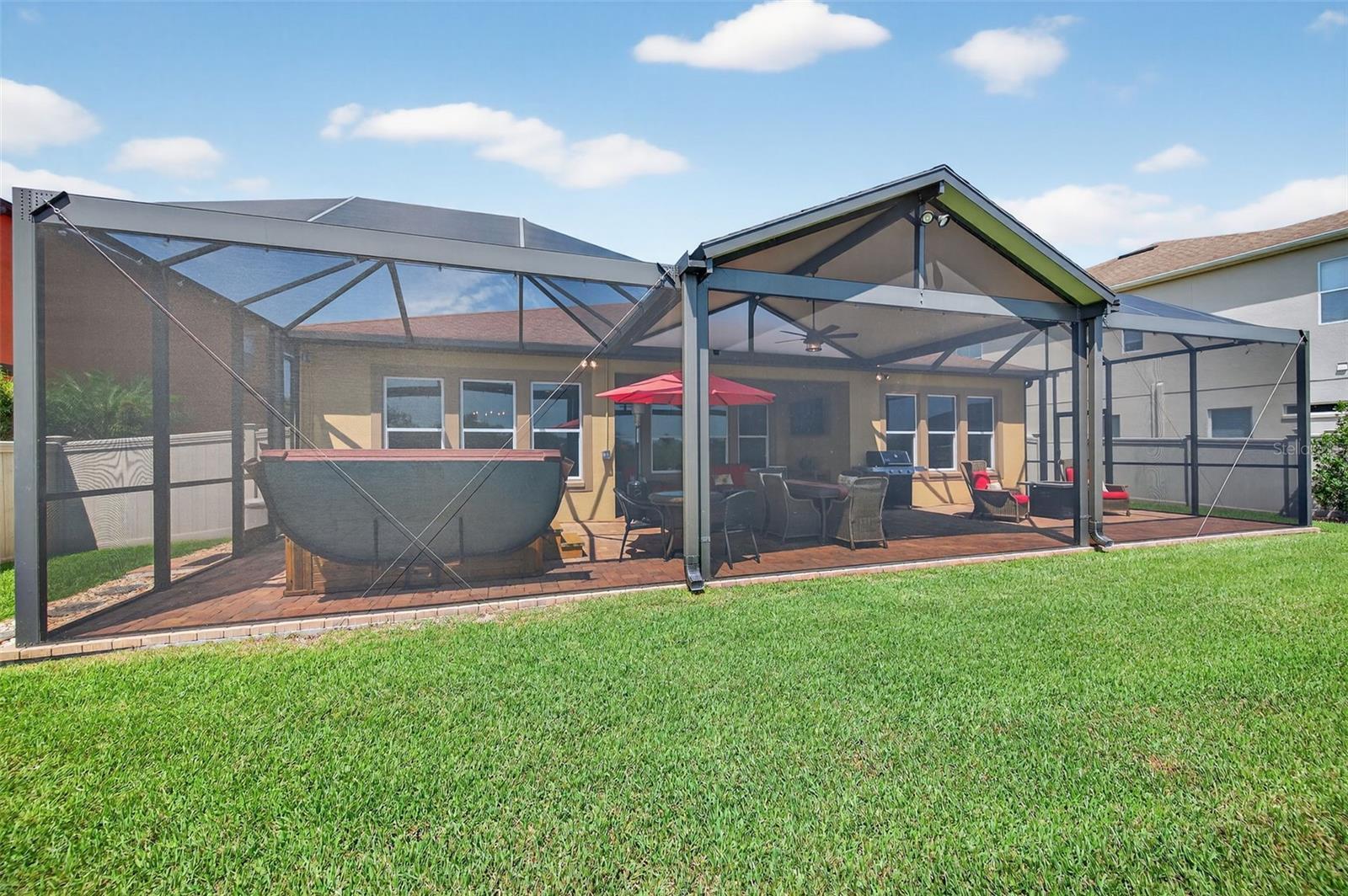 Seller is highly motivated. Now offered at an improved price. Welcome to Estancia at Wiregrass, one of Wesley Chapel's most coveted master-planned communities. The moment you step through the doors of this Hamilton floor plan, your eye is immediately drawn across the foyer to sweeping water & conservation views that set the tone for a home defined by elegance & effortless Florida living. Perfectly situated at the end of a cul-de-sac, its timeless curb appeal is evident in the brick-paved driveway, manicured landscaping, custom exterior & nebula lighting, & a freshly painted exterior that glows with sophistication. Offering 2,584 sq. ft. under air & 3,720 total sq. ft., the residence unfolds with engineered hardwood flooring throughout, crown molding, custom ceiling fans, plantation shutters, new window coverings & refined architectural details. At the heart of the home, the gourmet kitchen commands attention with an oversized island & breakfast bar, custom wood chimney hood, natural gas cooktop, double wall ovens, built-in microwave, full extension cabinetry with glass inlays & a walk-in pantry, flowing seamlessly into the formal dining room, sunlit dinette & expansive family room enhanced by surround sound. The primary suite is privately tucked away to capture serene morning light & features a spa-inspired bath with dual vanities, an oversized walk-in shower with custom tile, a soaking tub & a generous walk-in closet, while a secondary en suite bedroom & two additional bedrooms with a shared bath offer comfort & versatility. Extending the living experience outdoors, the home’s most captivating feature is its remarkable 1,000 sq. ft. lanai addition, conceived as an outdoor pavilion with a pitched roof, panoramic screening, surround sound, outdoor lighting & multiple zones for dining, lounging & entertaining, complete with a Jacuzzi spa & mounted TV that convey, all set against an unforgettable backdrop of sunrise-to-starlight views. Additional luxuries include a three-car garage with epoxy floors, a central vacuum system, whole-home water softener & filtration, outdoor patio lighting, upgraded landscaping, nebula & exterior lighting, French drains with a guest bedroom TV also remaining, creating a residence where striking curb appeal, refined interiors & extraordinary outdoor living come together in perfect harmony. Please be sure to view the 3D tour walkthrough to fully experience the sophistication, scale & lifestyle this exceptional home offers!