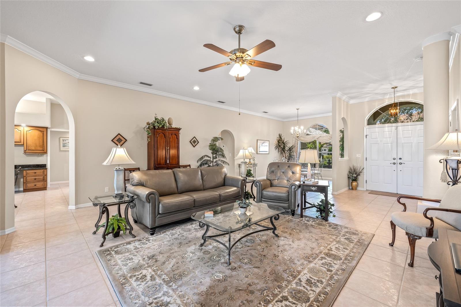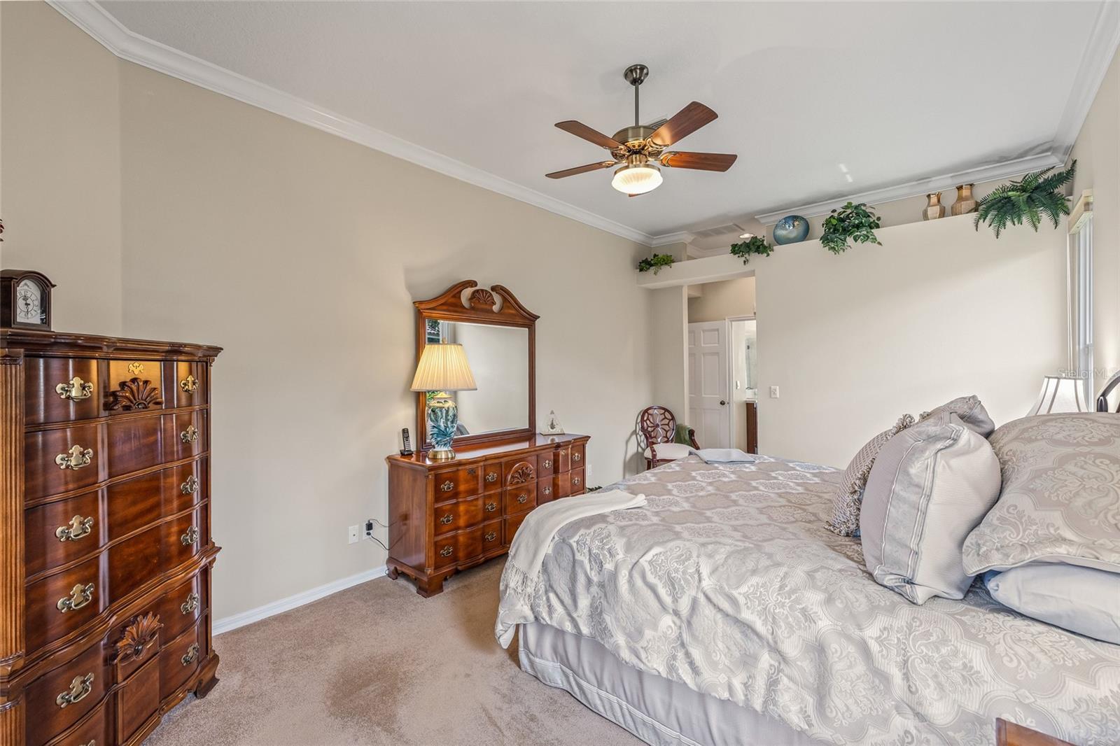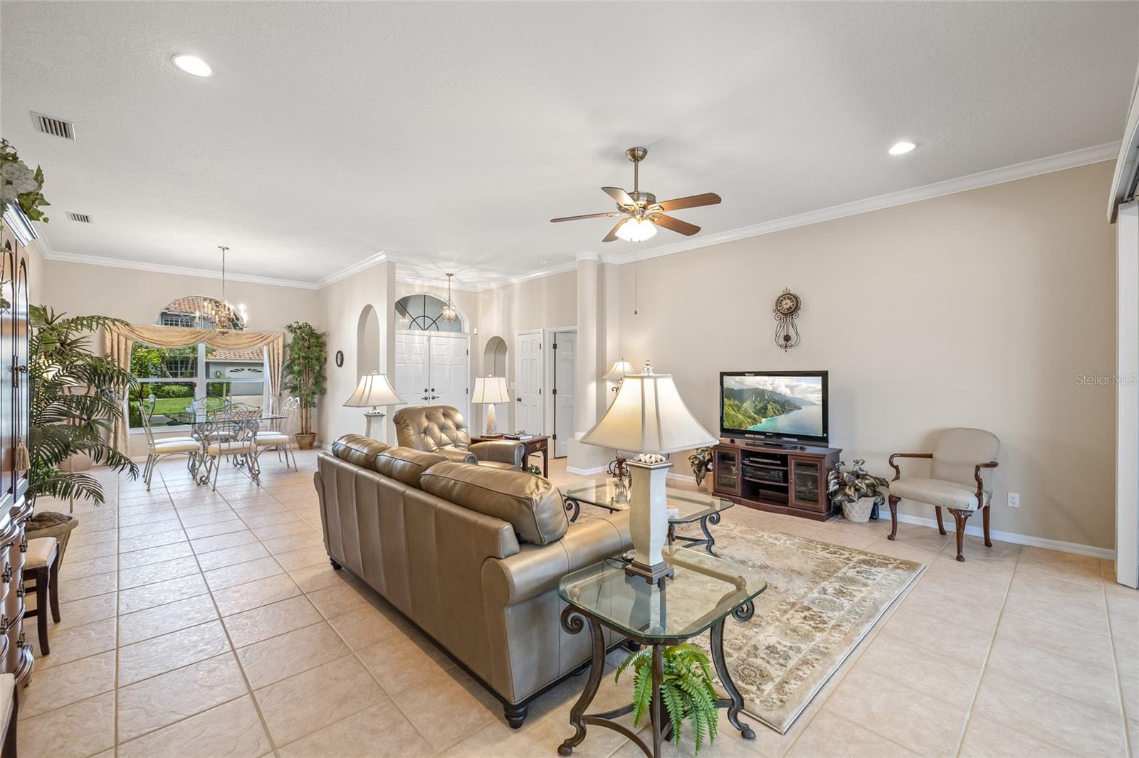 - Built-in Features, Ceiling Fans(s), Crown Molding, Eat-in Kitchen, High Ceilings, Living Room/Dining Room Combo, Pest Guard System, Primary Bedroom Main Floor, Solid Surface Counters, Split Bedroom, Stone Counters, Thermostat, Walk-In Closet(s), Window Treatments