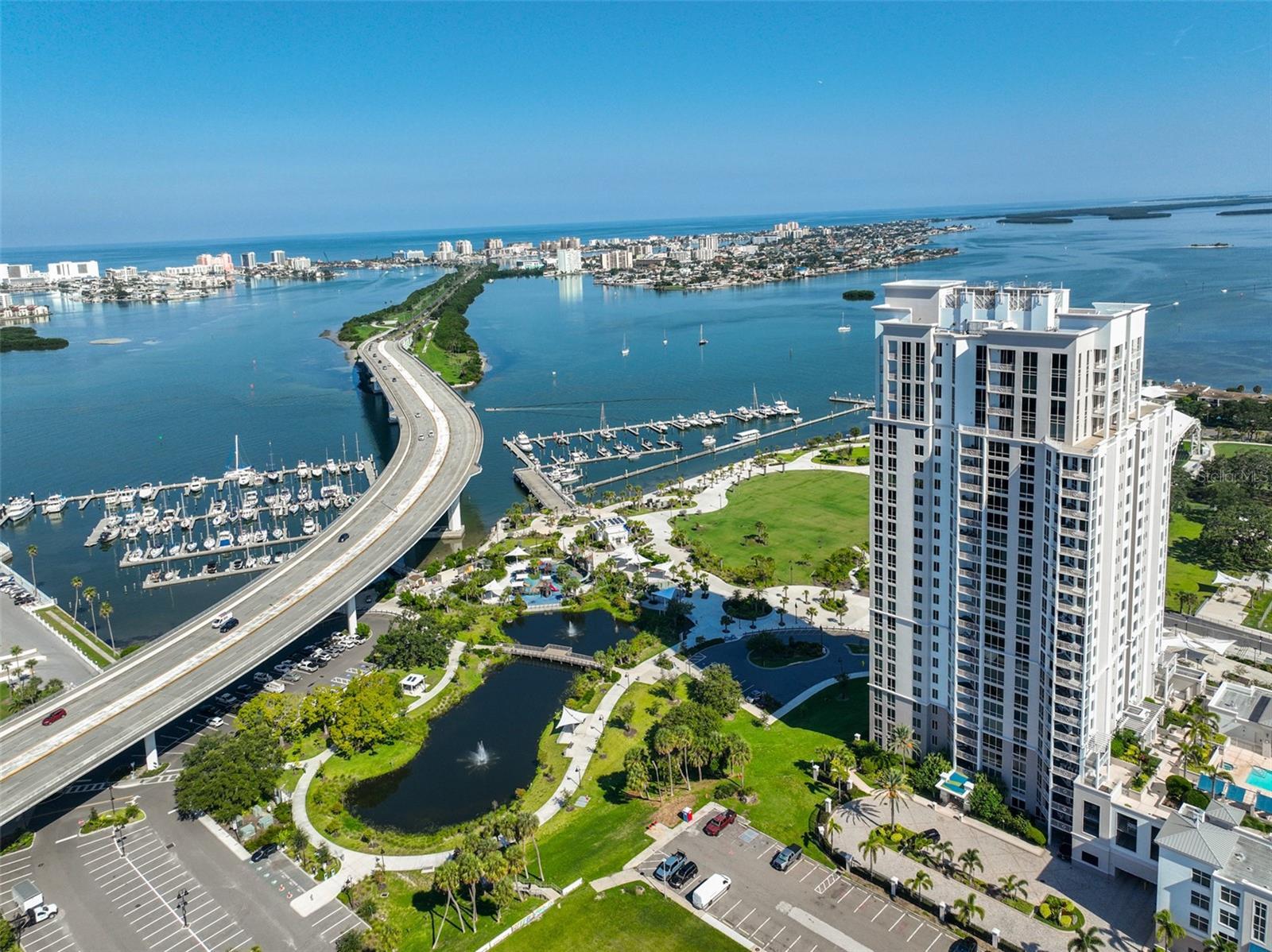 Enjoy stunning water and city views from this beautifully maintained 7th-floor condo at Water's Edge in downtown Clearwater. This spacious residence features an open living and dining layout with engineered hardwood floors and sliding glass doors leading from both the living area and primary suite to a private balcony overlooking the skyline. The kitchen is designed for both style and function with wood cabinetry, granite countertops, tile backsplash, stainless steel appliances, and a large breakfast bar. A flexible den/office/bonus space adds versatility to the floor plan. The primary suite offers direct balcony access, a custom bath with dual sinks, and a large walk-in shower. The guest bedroom also enjoys water views and has an adjacent full bath and a laundry room with a stacked washer/dryer. Brand New AC replaced in January 2025. This unit also has TWO assigned garage parking spaces and one storage space. Resort-style amenities elevate everyday living at Water's Edge. Residents enjoy a heated pool and spa with cabanas, outdoor grilling stations, and a cozy fireplace lounge overlooking the marina and Coachman Park. Indoors, you'll find a state-of-the-art fitness center with a sauna, a beautifully redecorated club, and social rooms with a catering kitchen and billiards, plus conference and event spaces ideal for entertaining. A 24/7 concierge provides security and convenience. Located in the heart of downtown Clearwater, you'll be just steps from the marina, Capitol Theatre, library, shopping, dining, and entertainment. and only minutes over the bridge to Clearwater Beach. An easy commute to Tampa International and Clearwater Airports. Call today for your private showing!